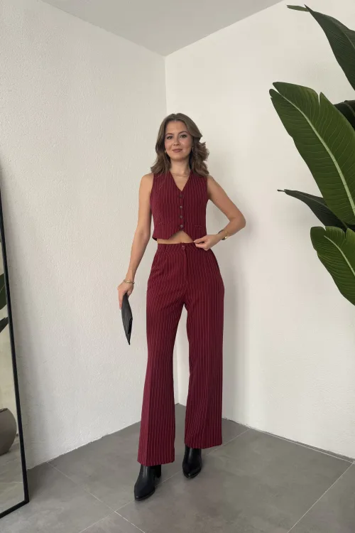Bordo Çizgili Kolsuz Düğmeli Astarlı Yelek