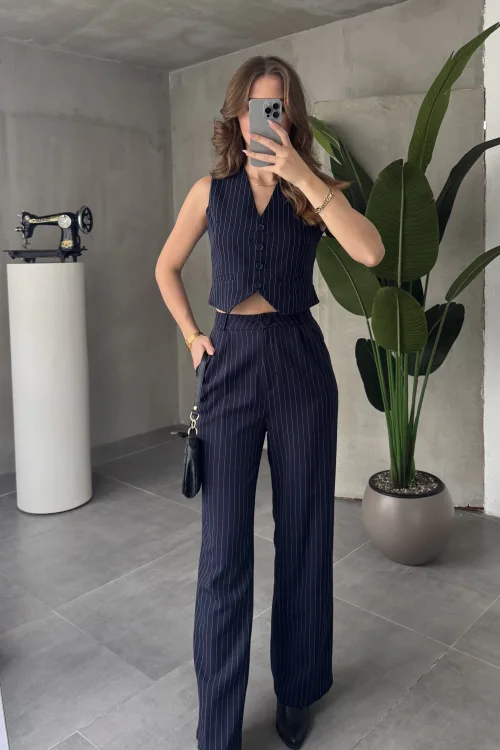 Lacivert Çizgili Kolsuz Düğmeli Astarlı Yelek
