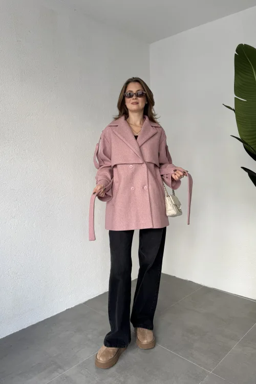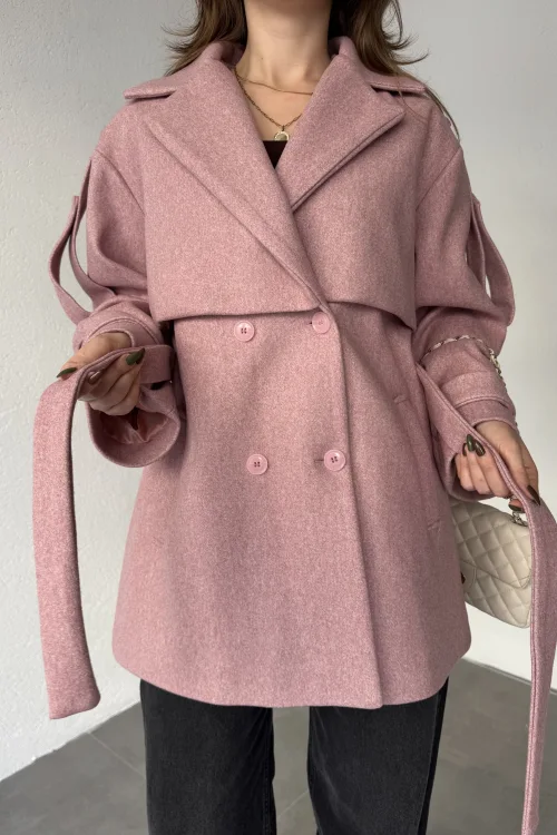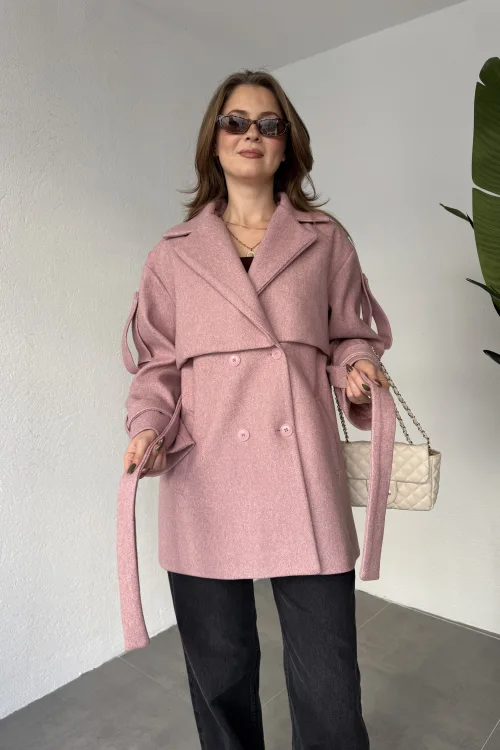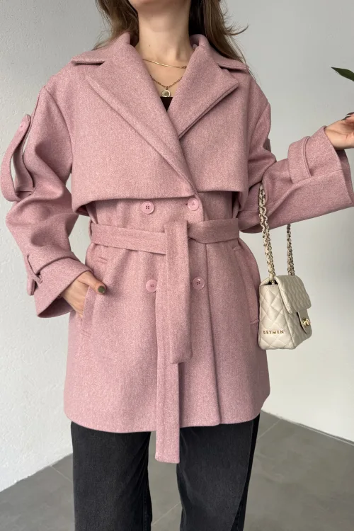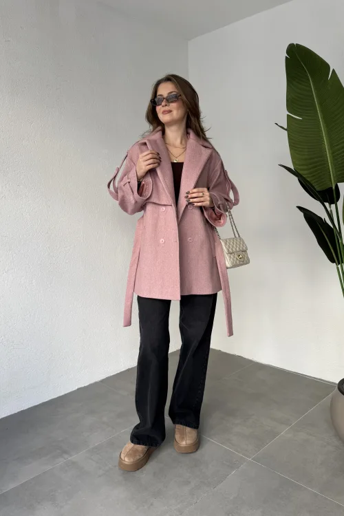 Pembe Kruvaze Oversize Astarlı Cepli Kuşaklı Kaşe Mont Kaban