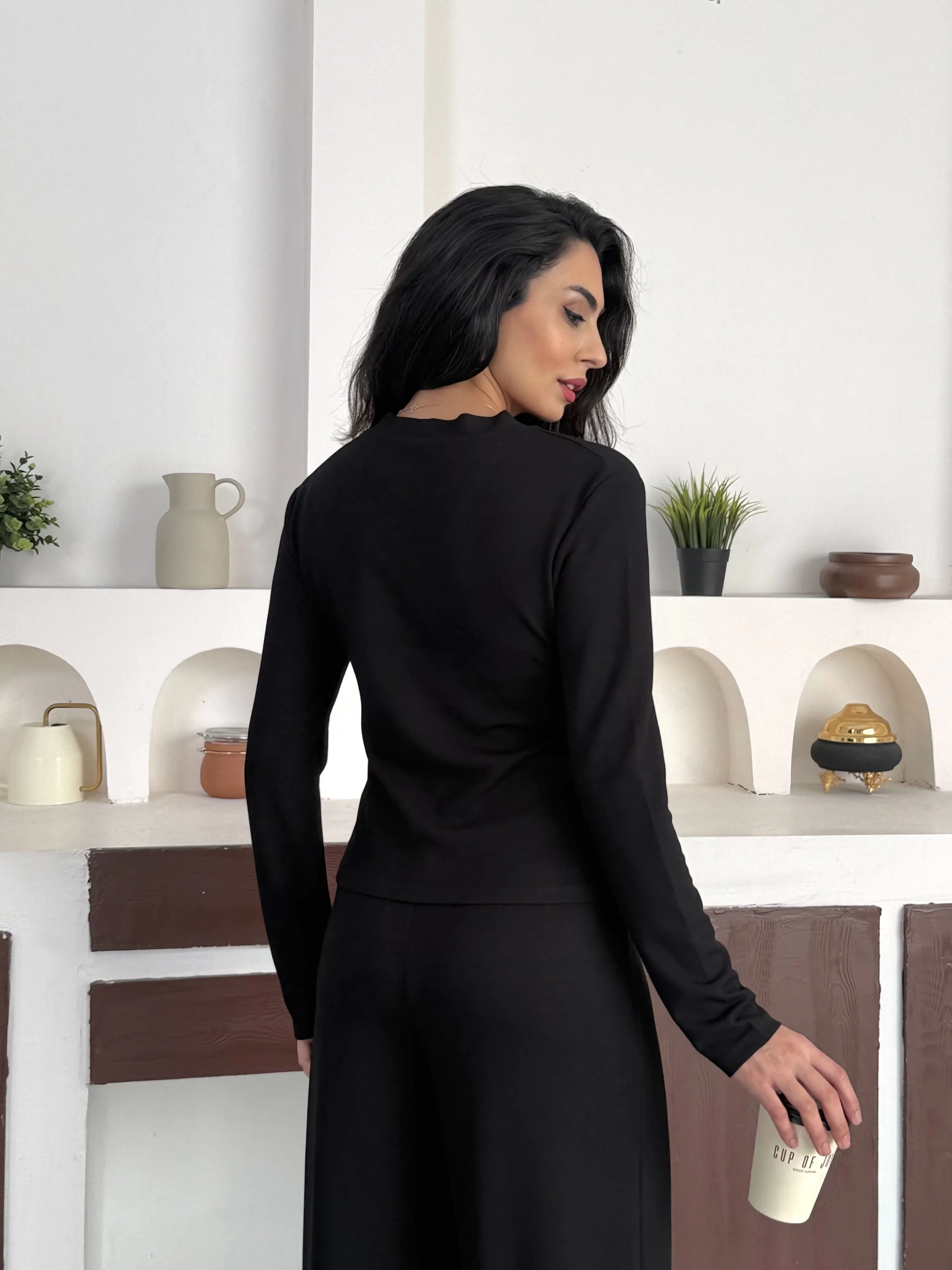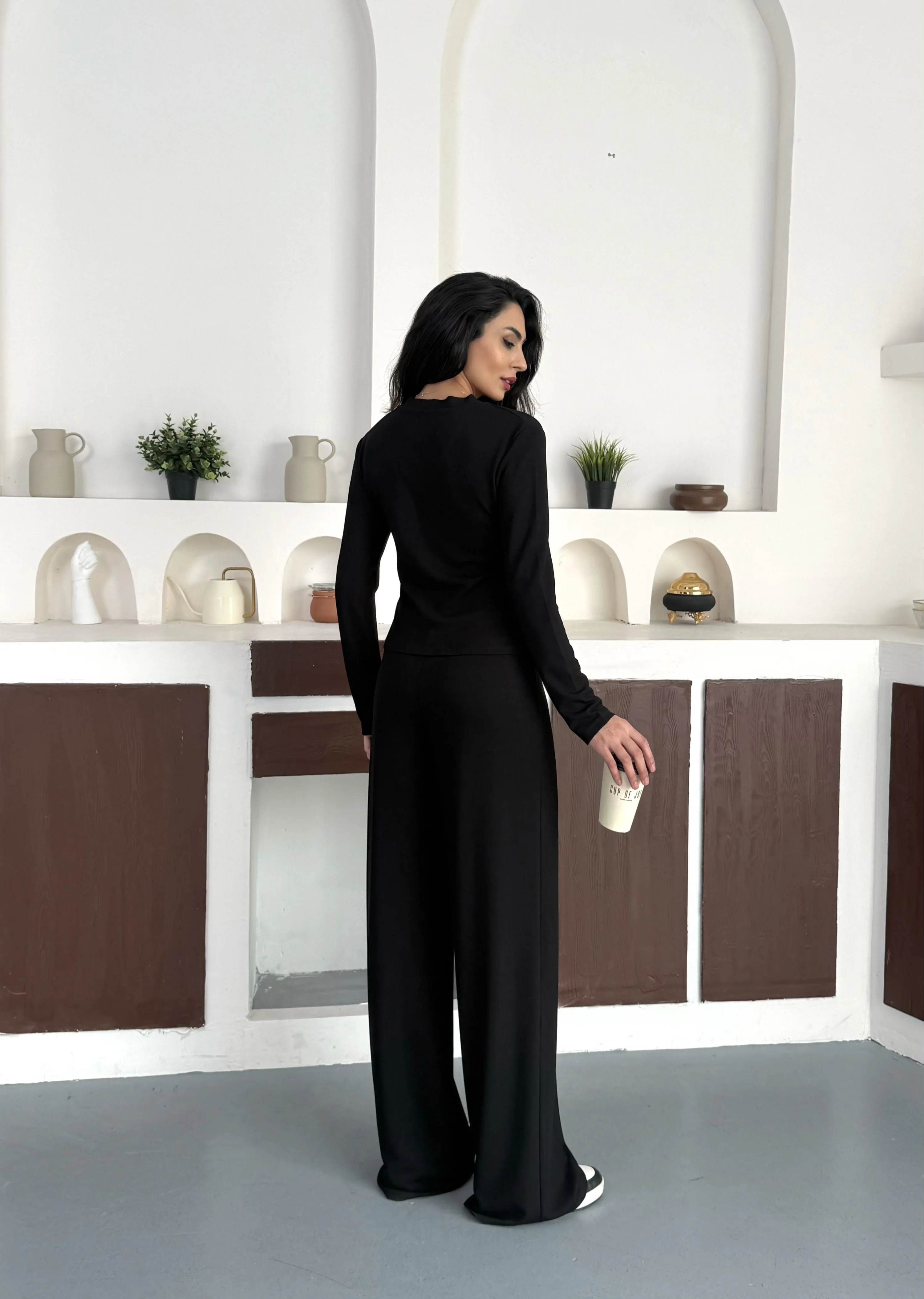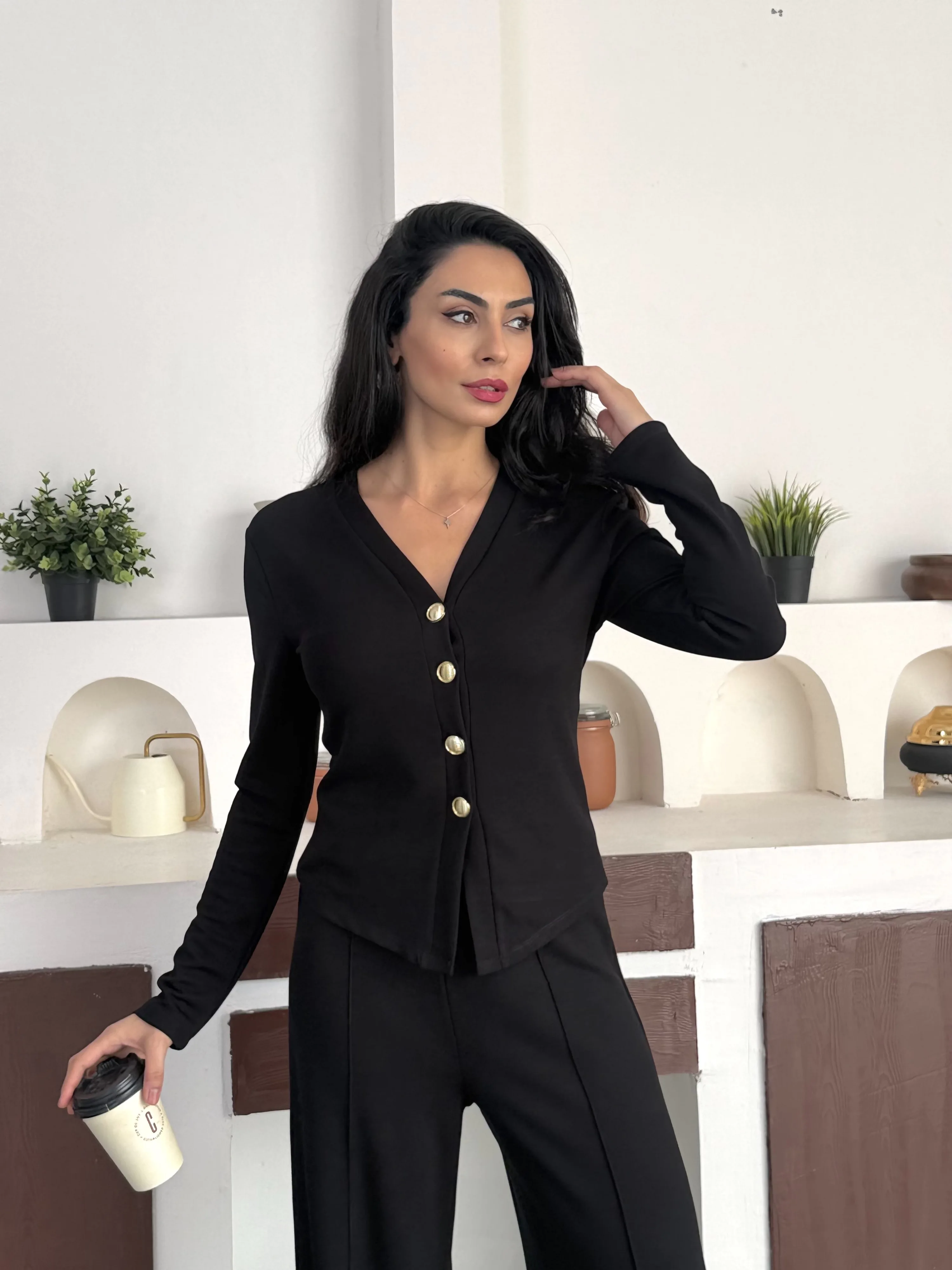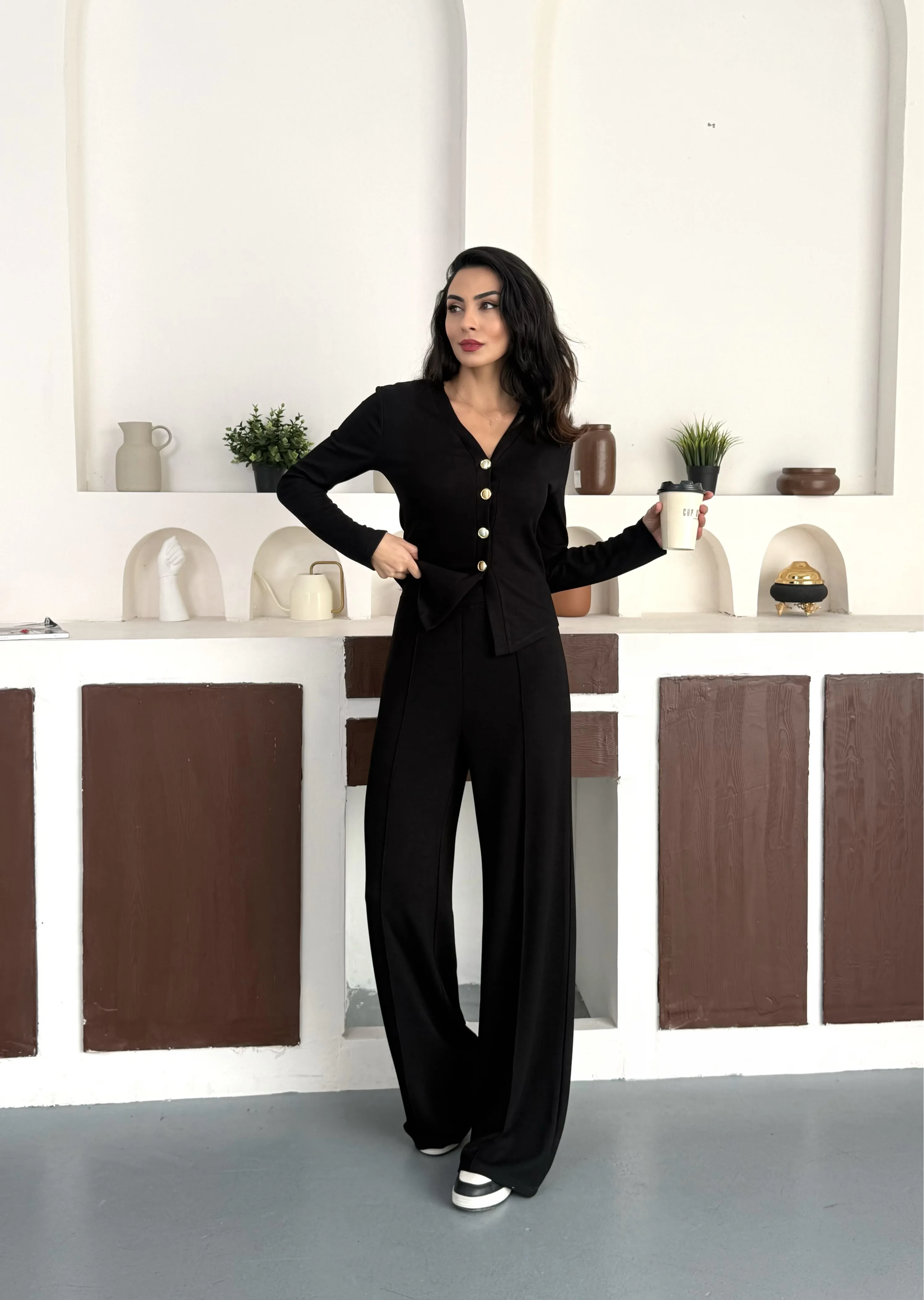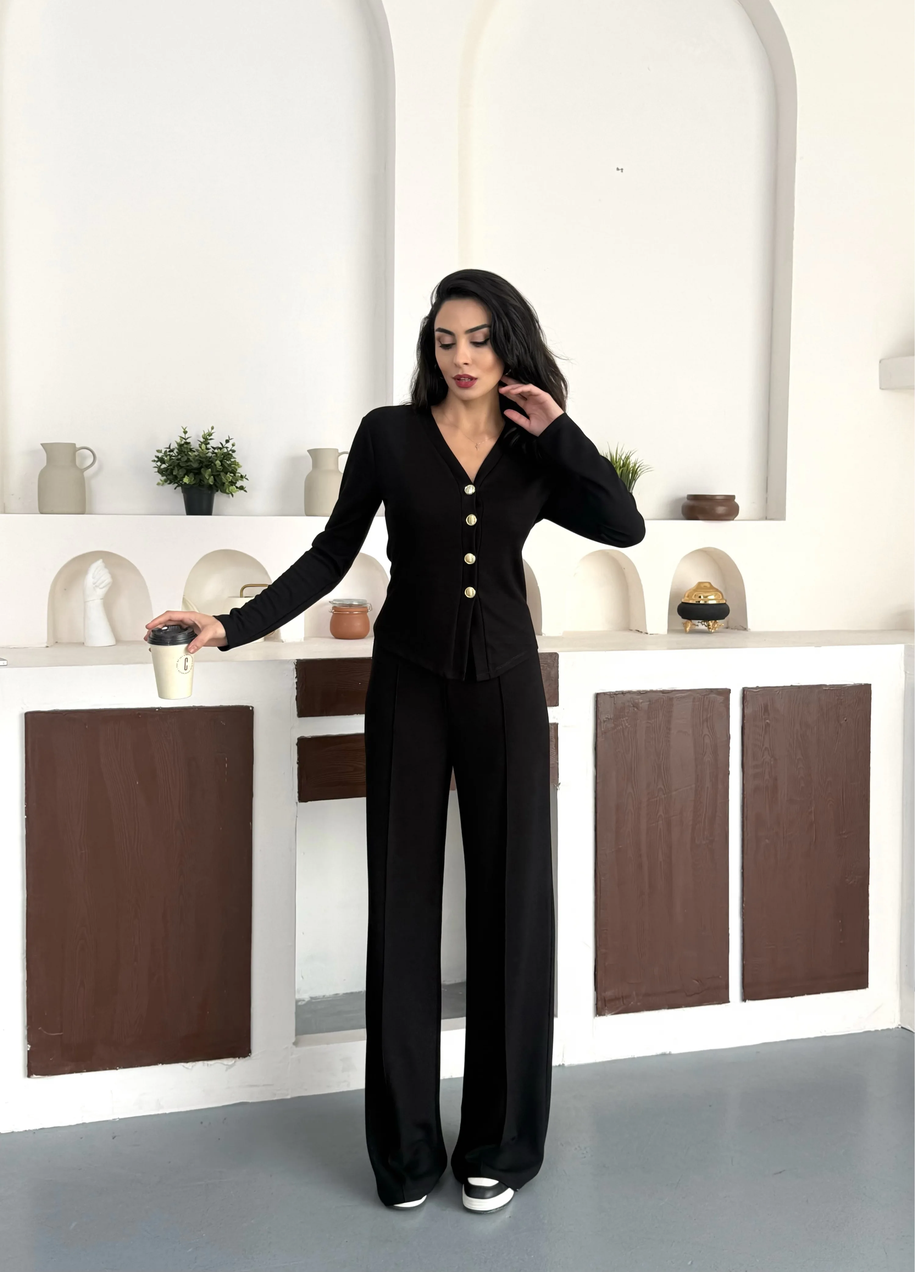 Siyah Gold Düğme Detaylı V Yaka Hırka İspanyol Paça Çimalı Viral Günlük Takım