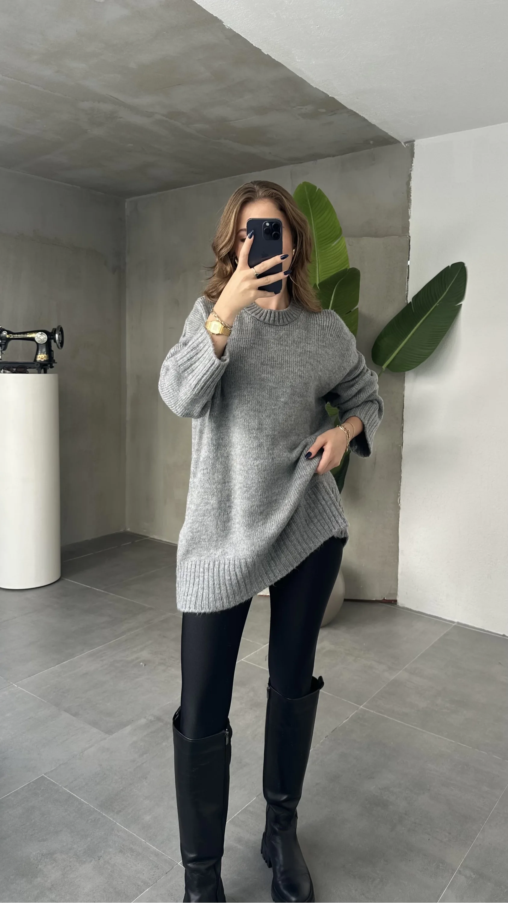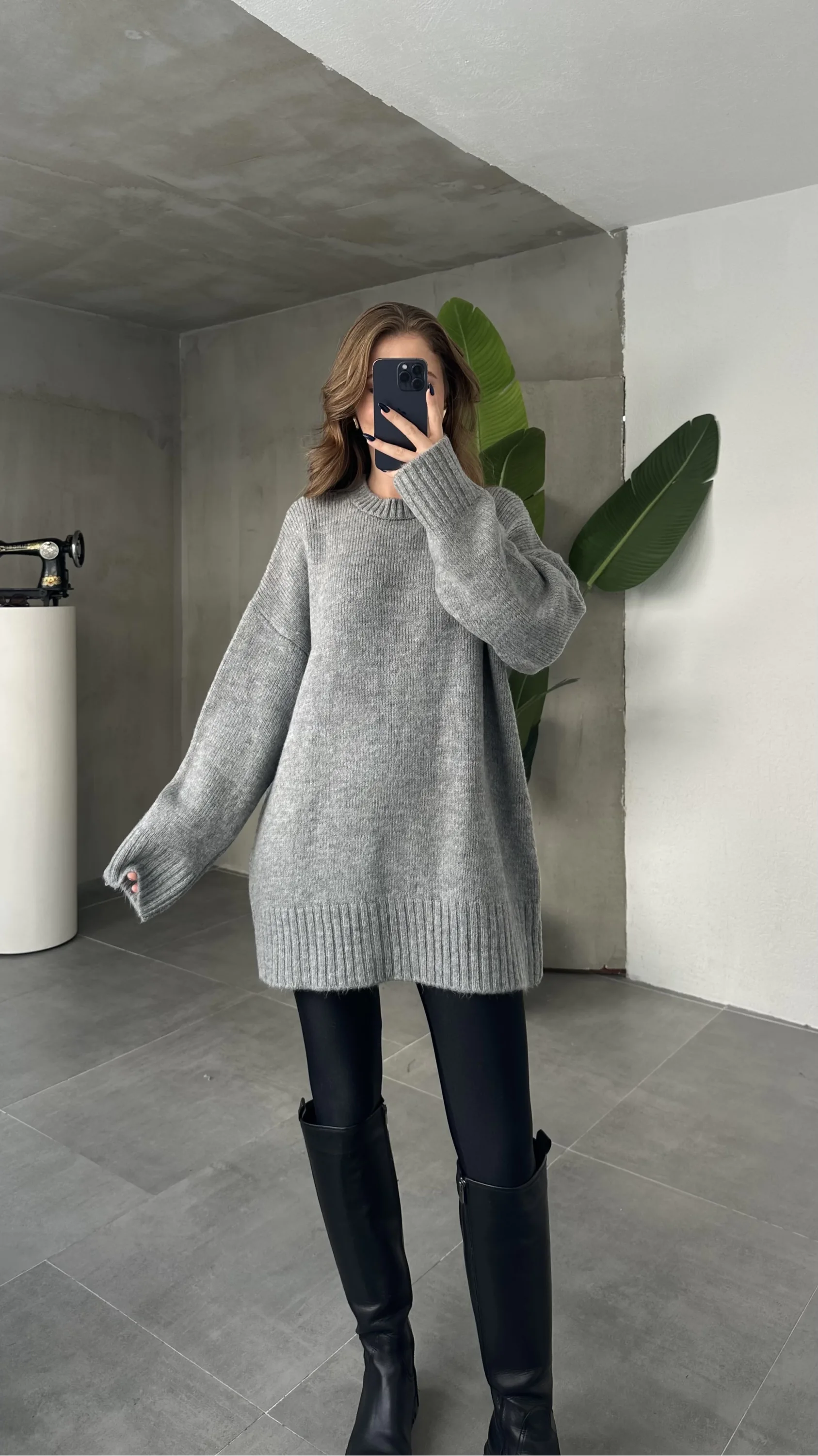 Gri Bisiklet Yaka Tam Salaş Oversize Uzun Triko Kazak