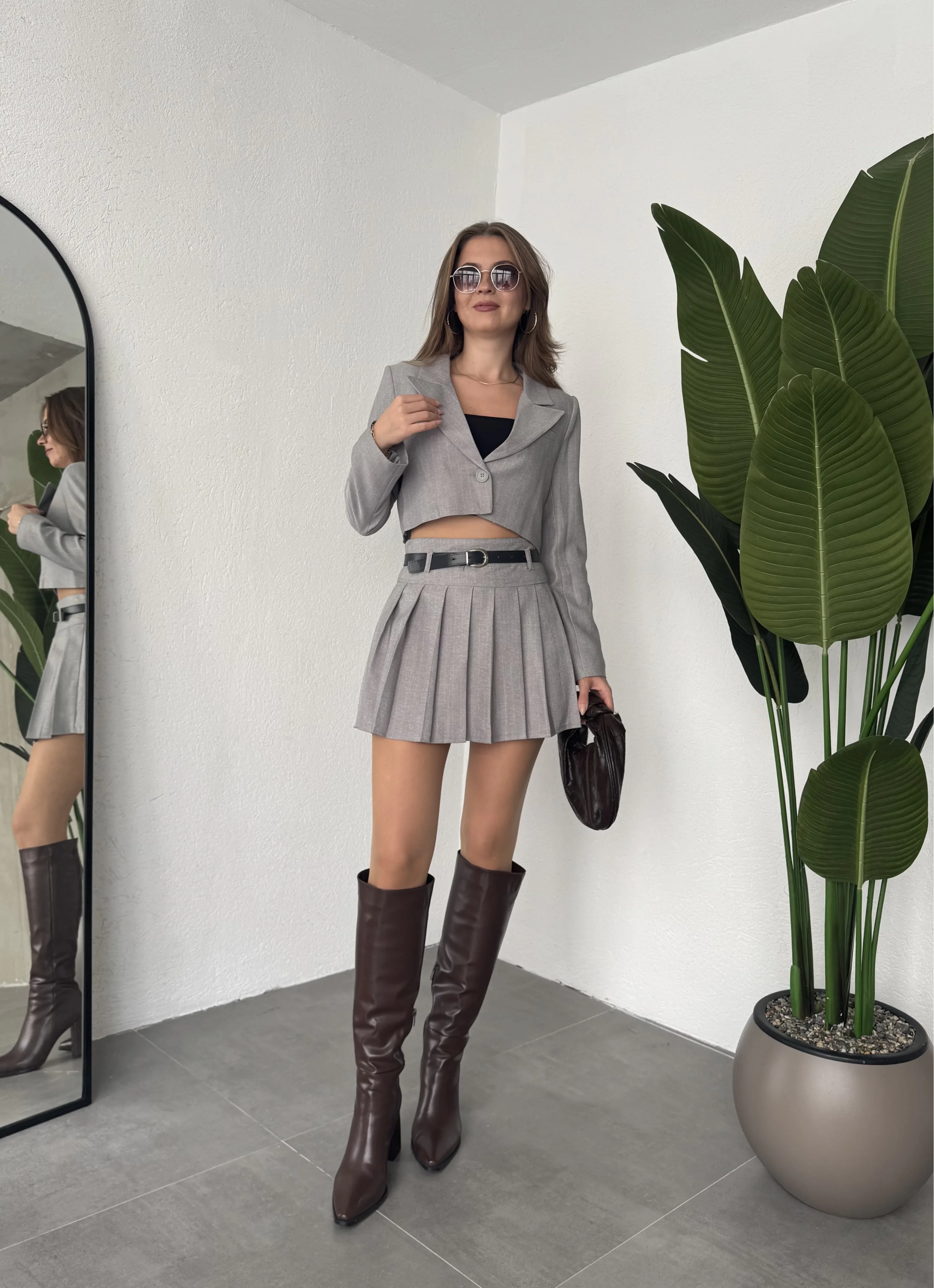 Gri Çizgili Astarlı Şortlu Kemerli Pileli Kışlık Mini Etek