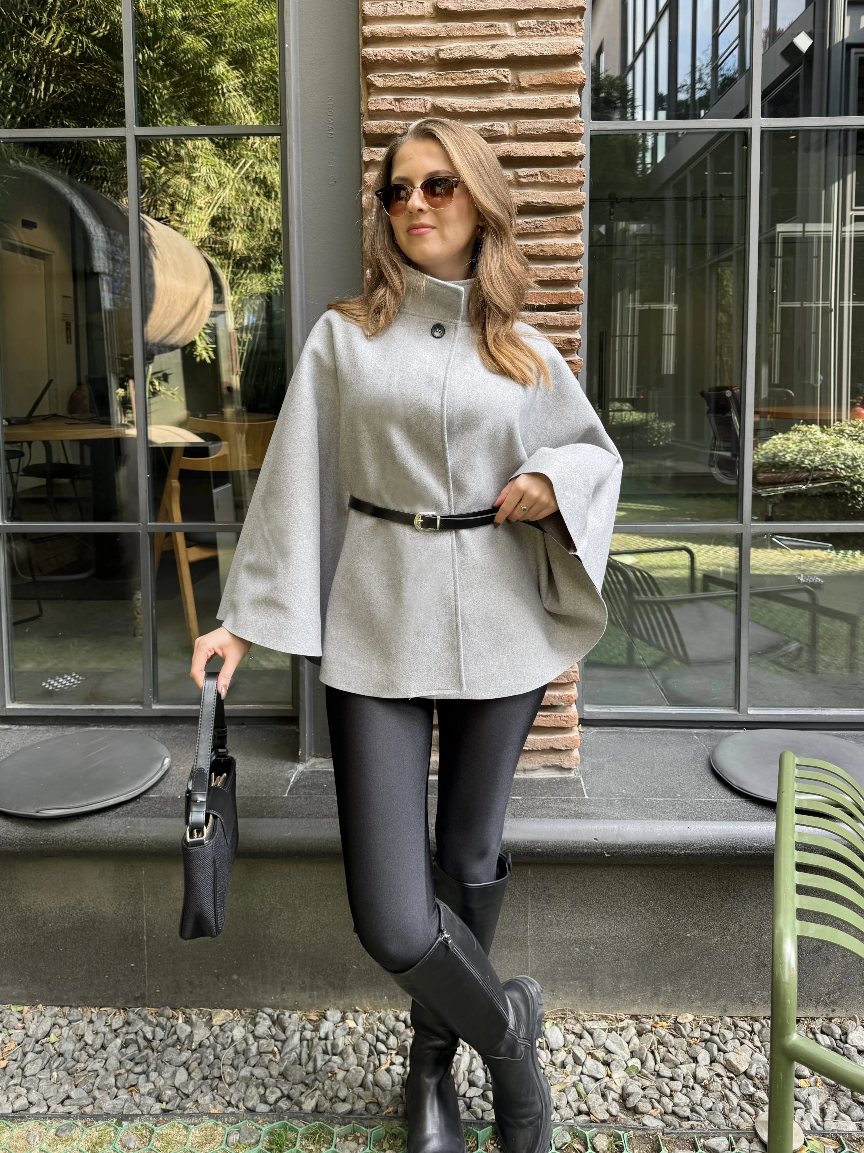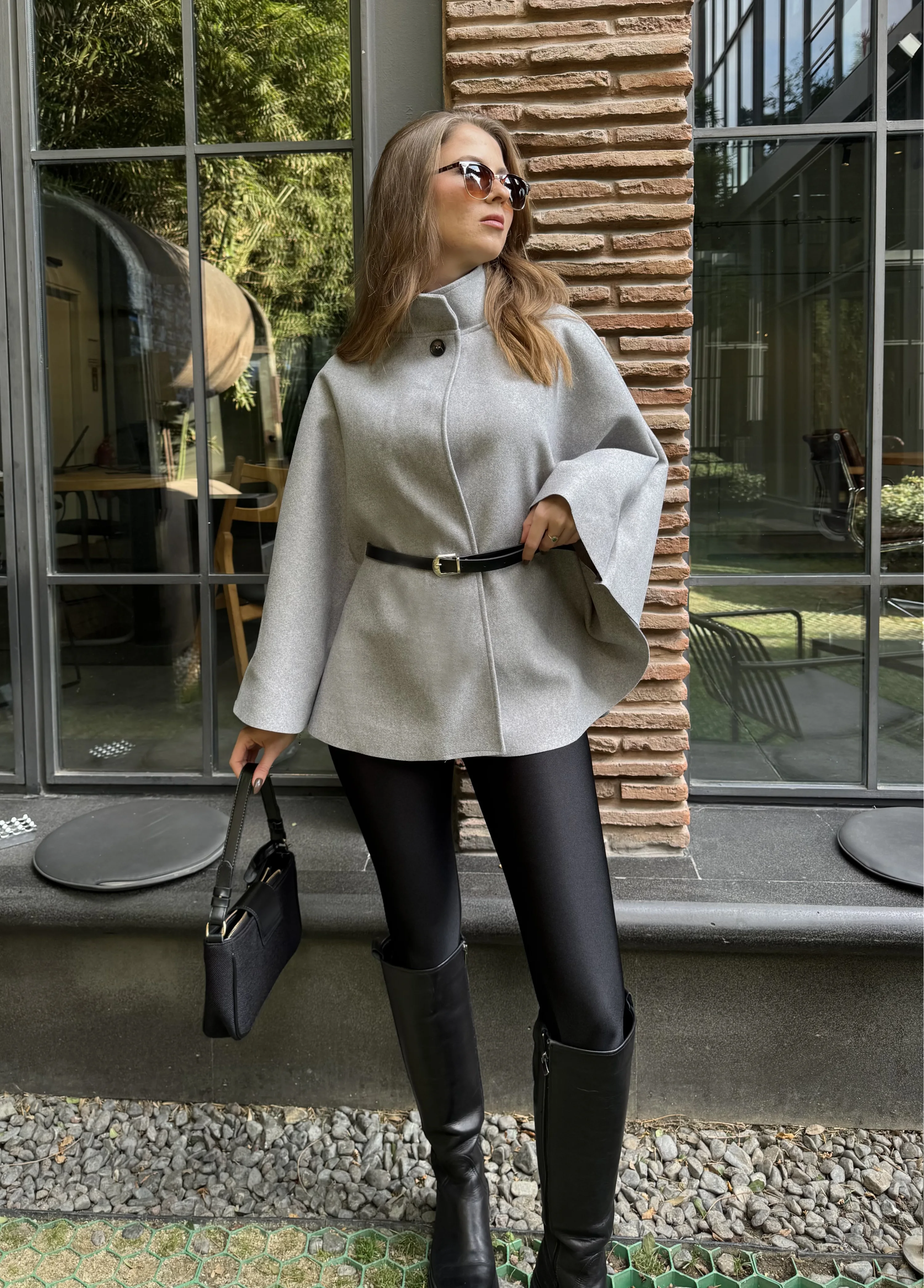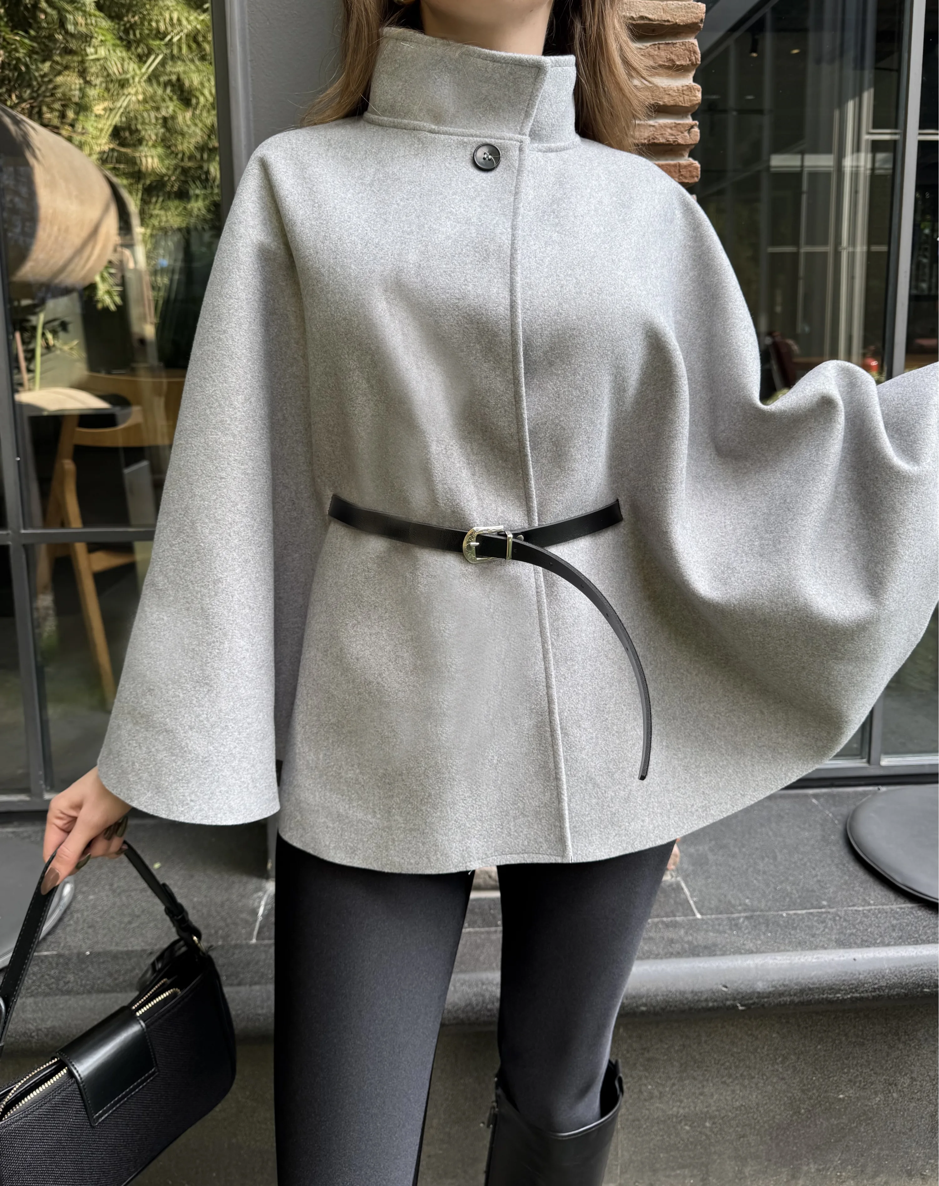 Gri Kemerli Dik Yaka Düğmeli Kaşe Pelerin Panço