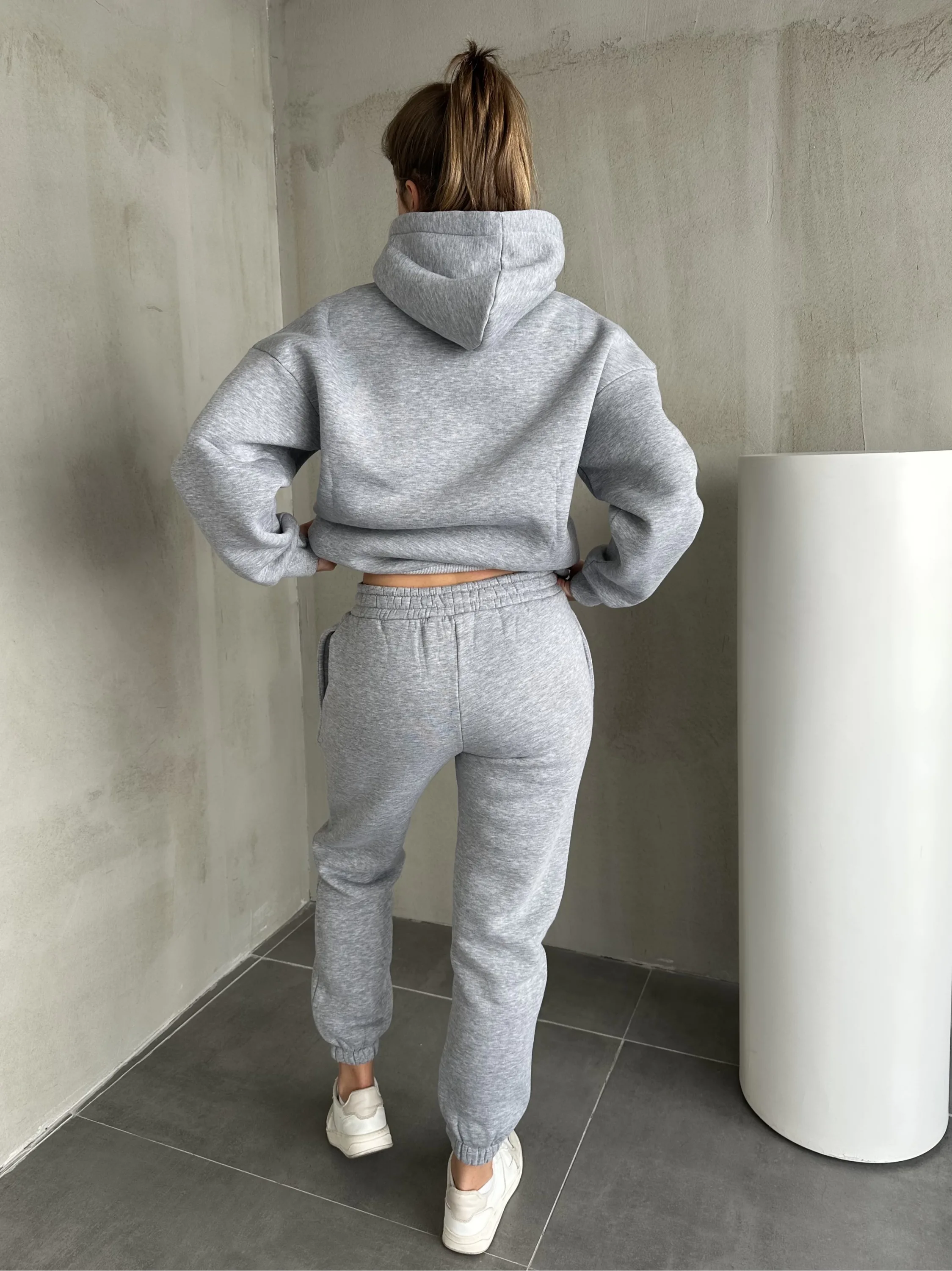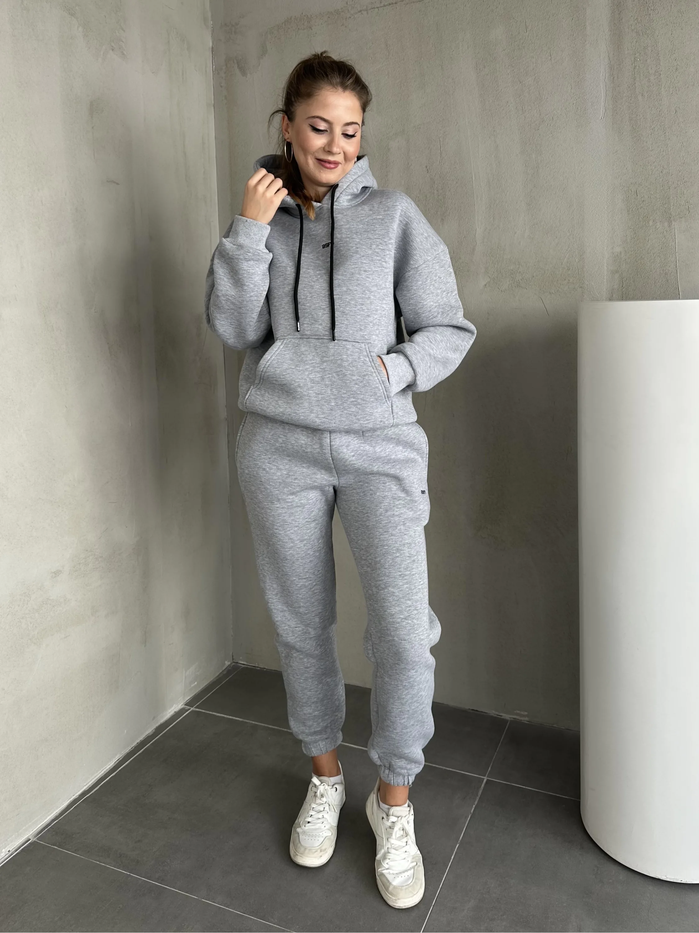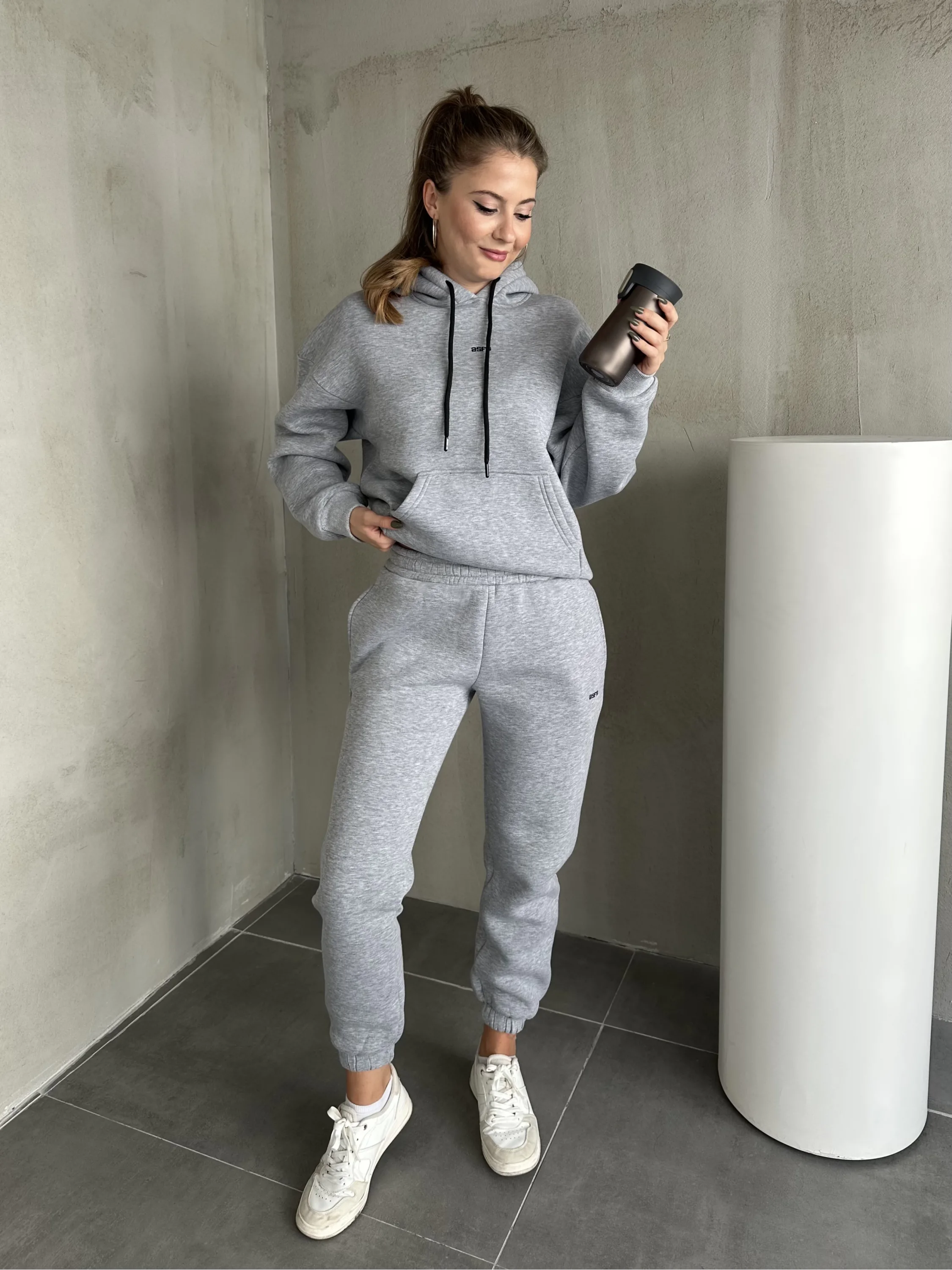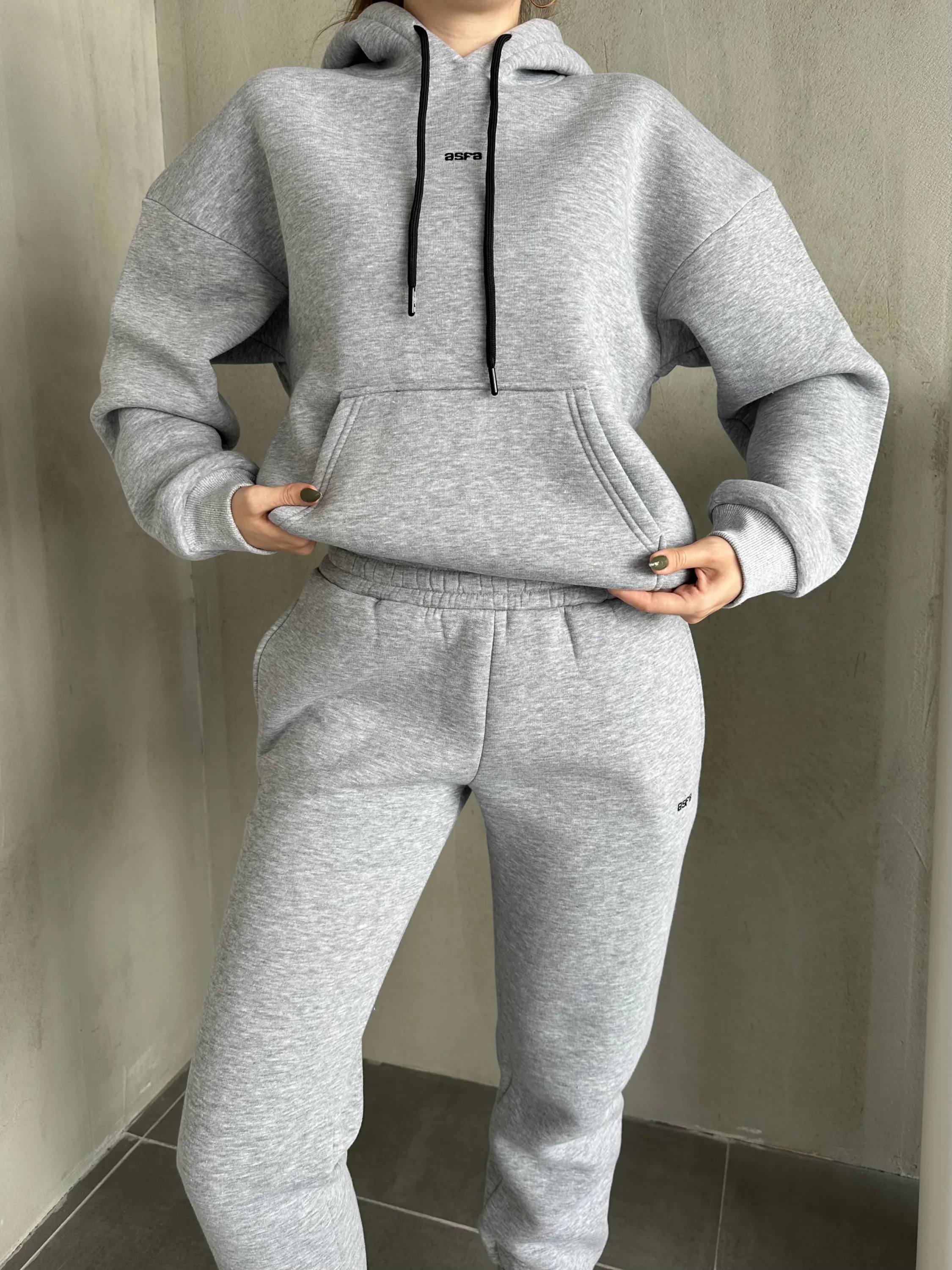 Gri melanj Üç İplik Şardonlu Kapşonlu Sweat Eşofman Takımı