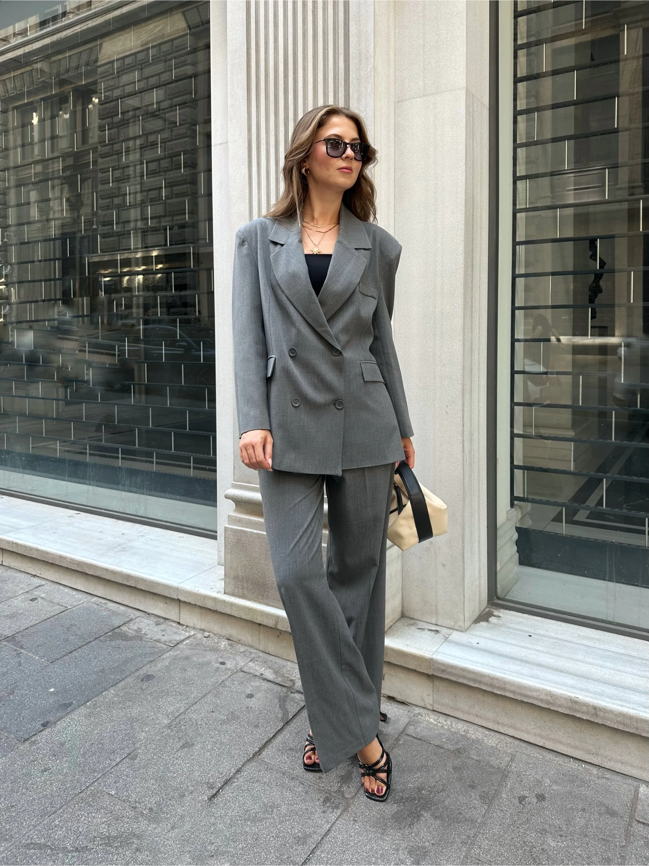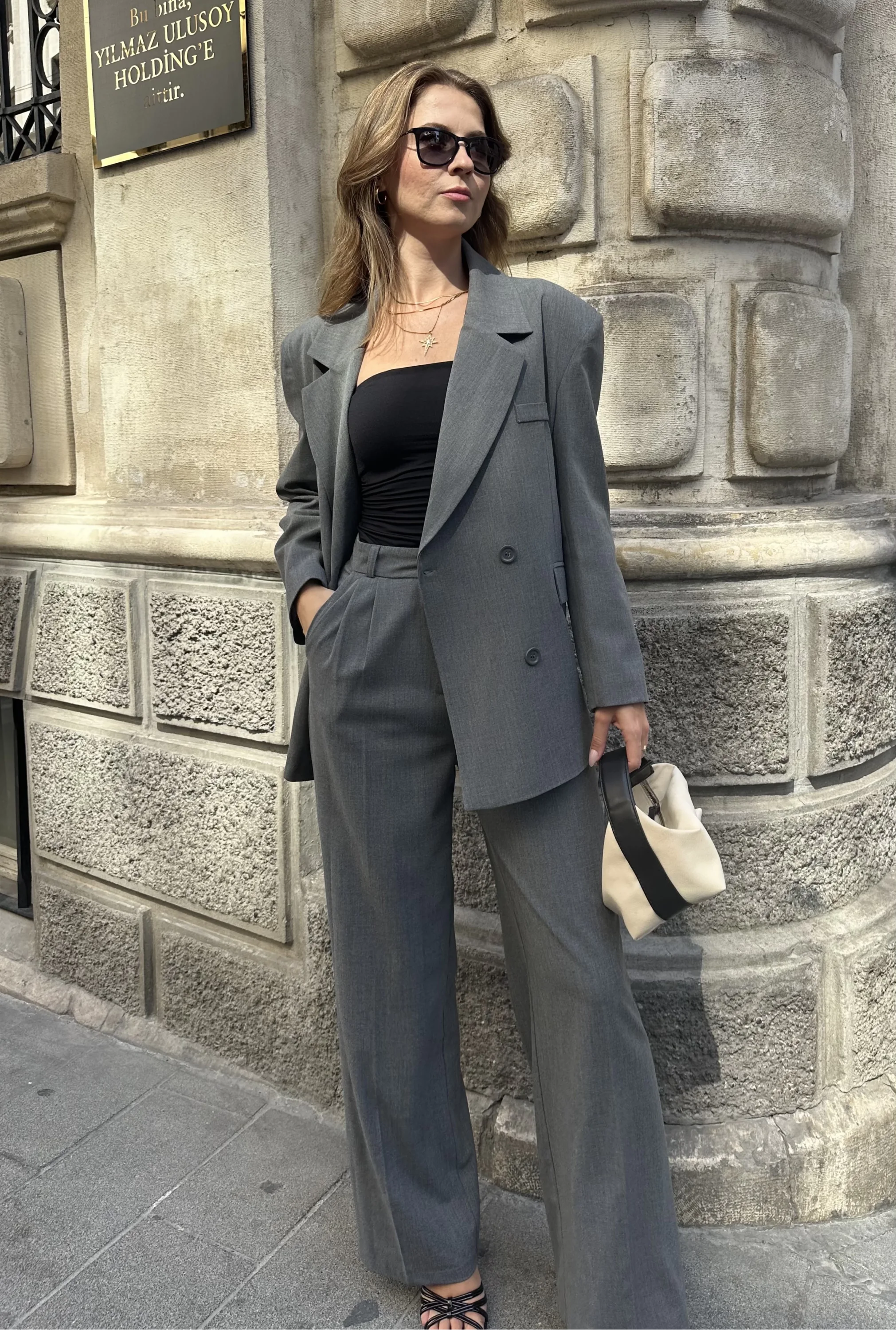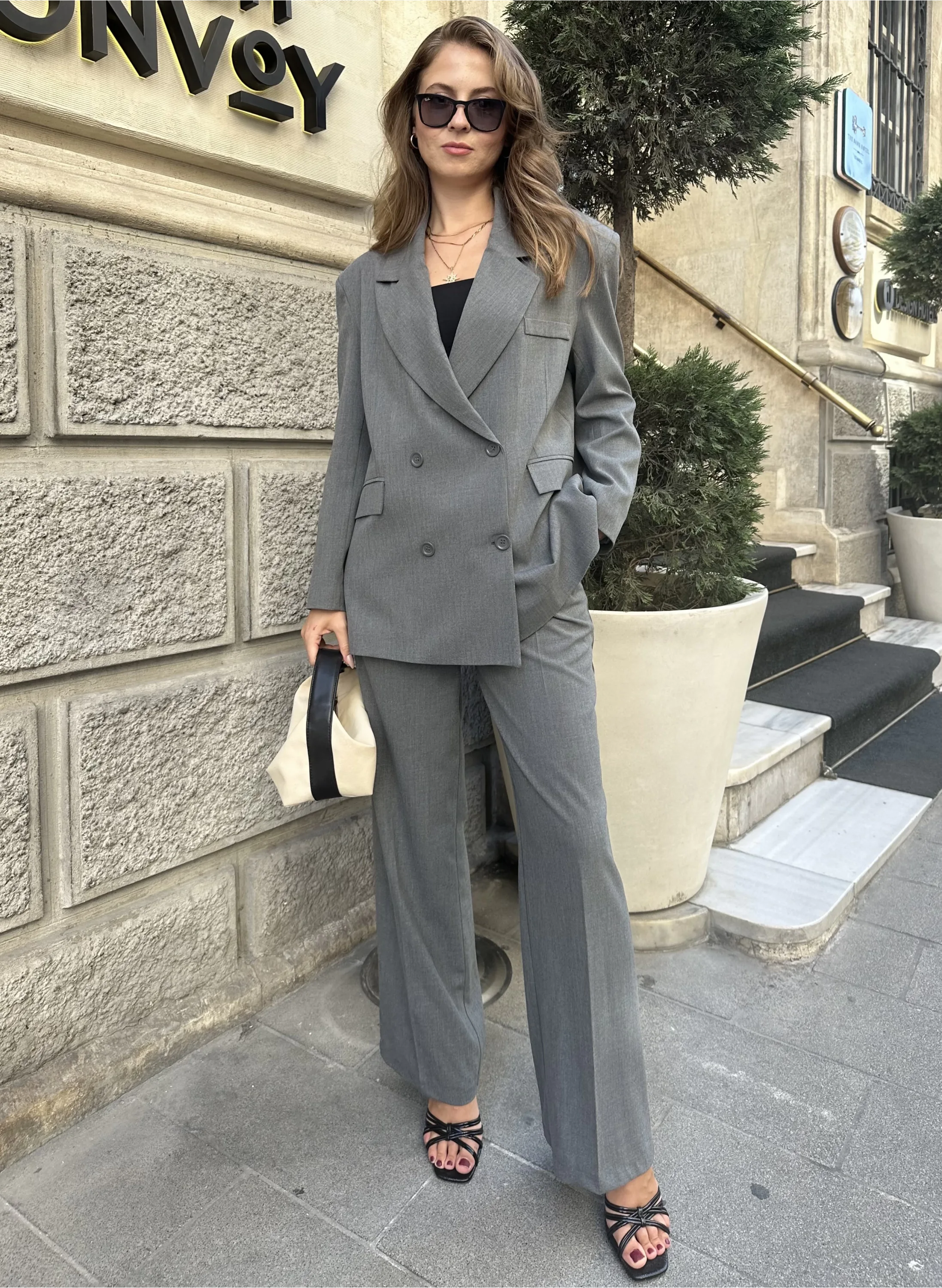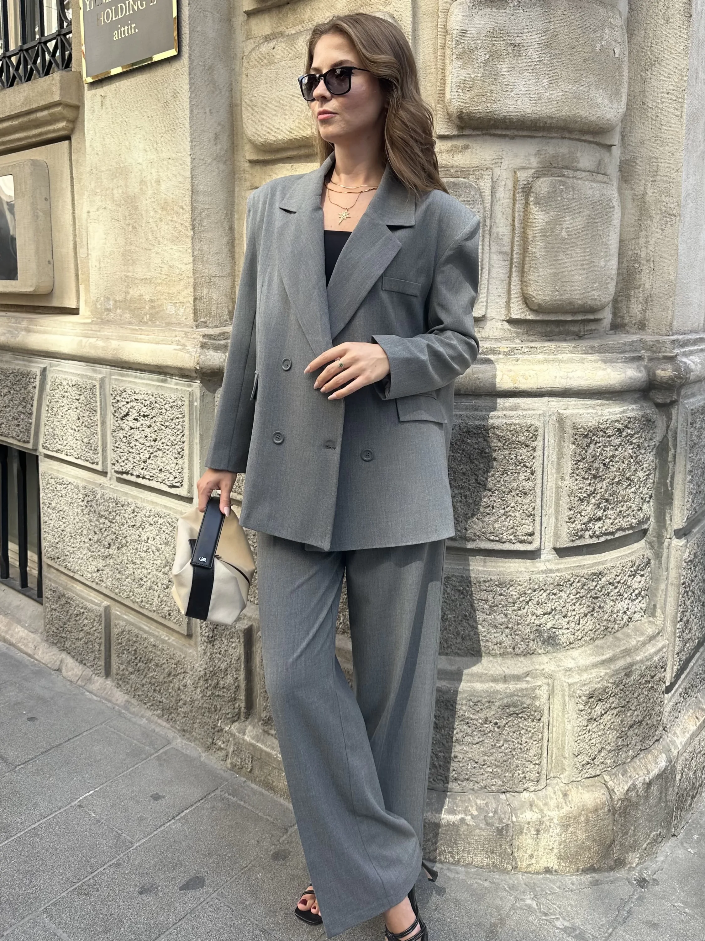 Gri Oversize Kruvaz Ceket Tam Kalıp Palazzo Pantolon Viskon Premium İkili Takım