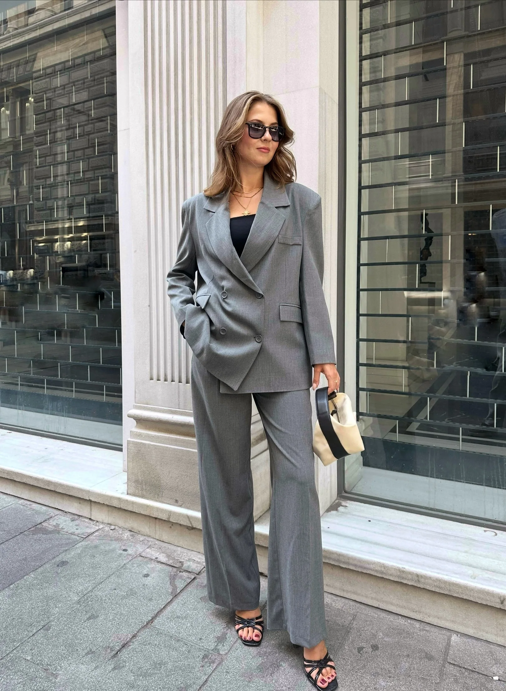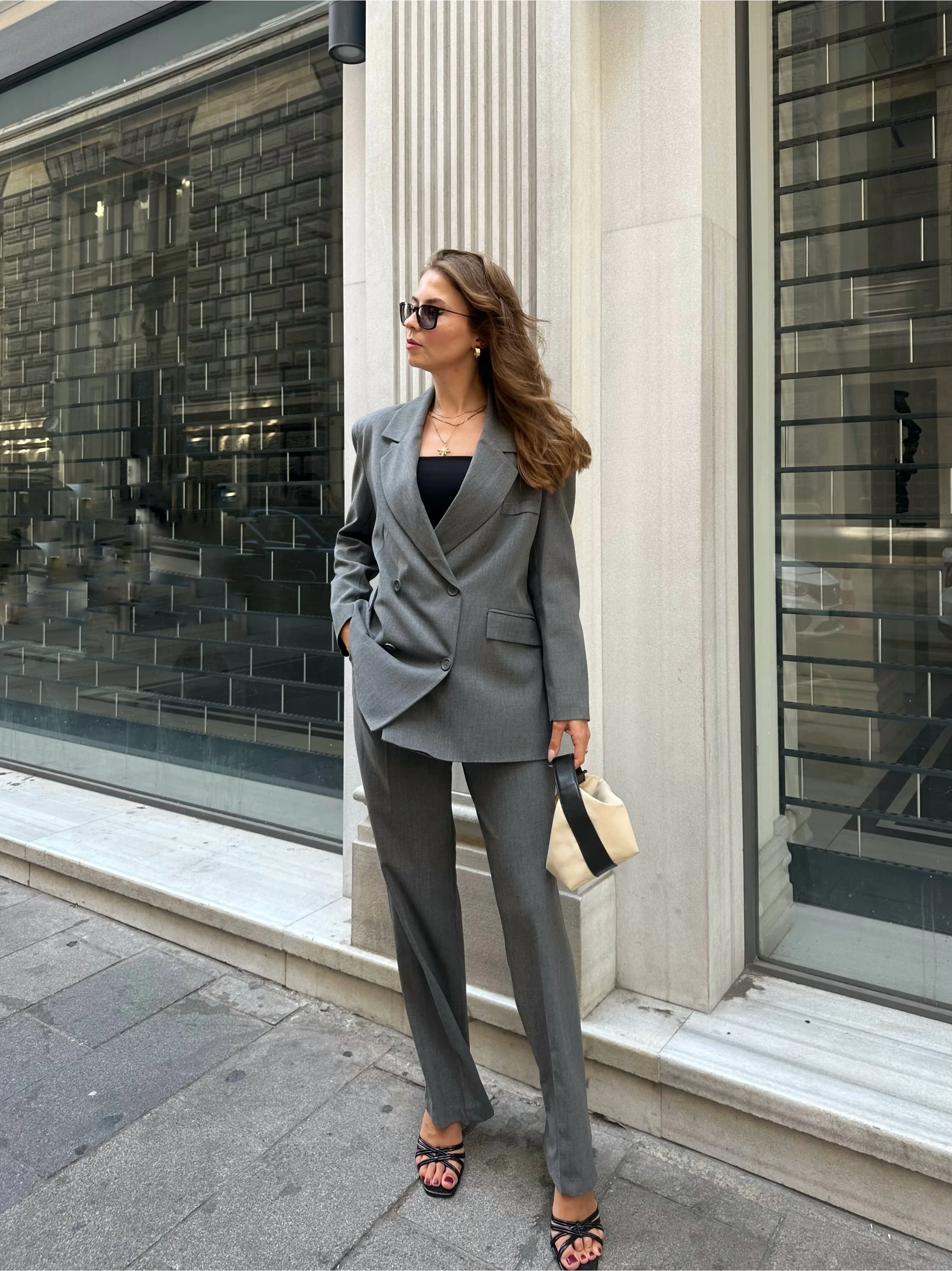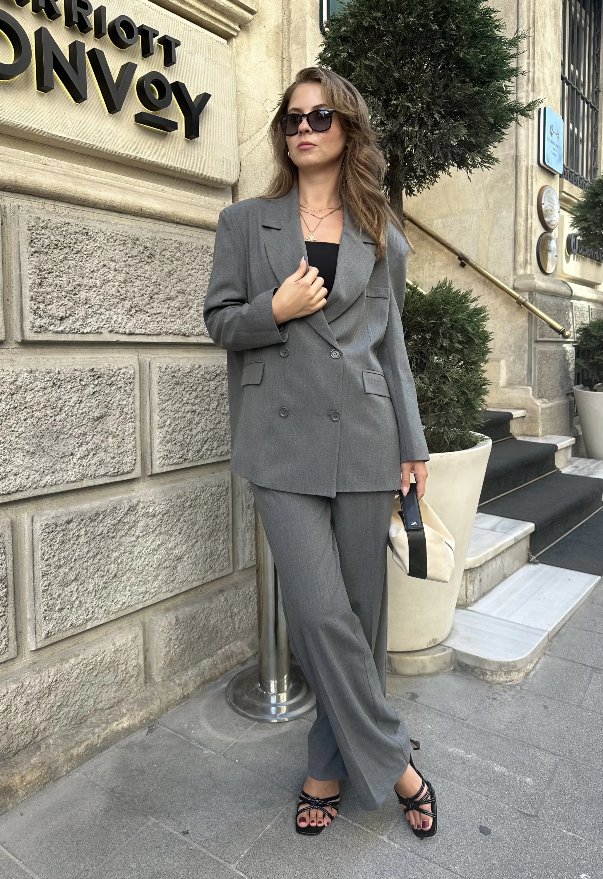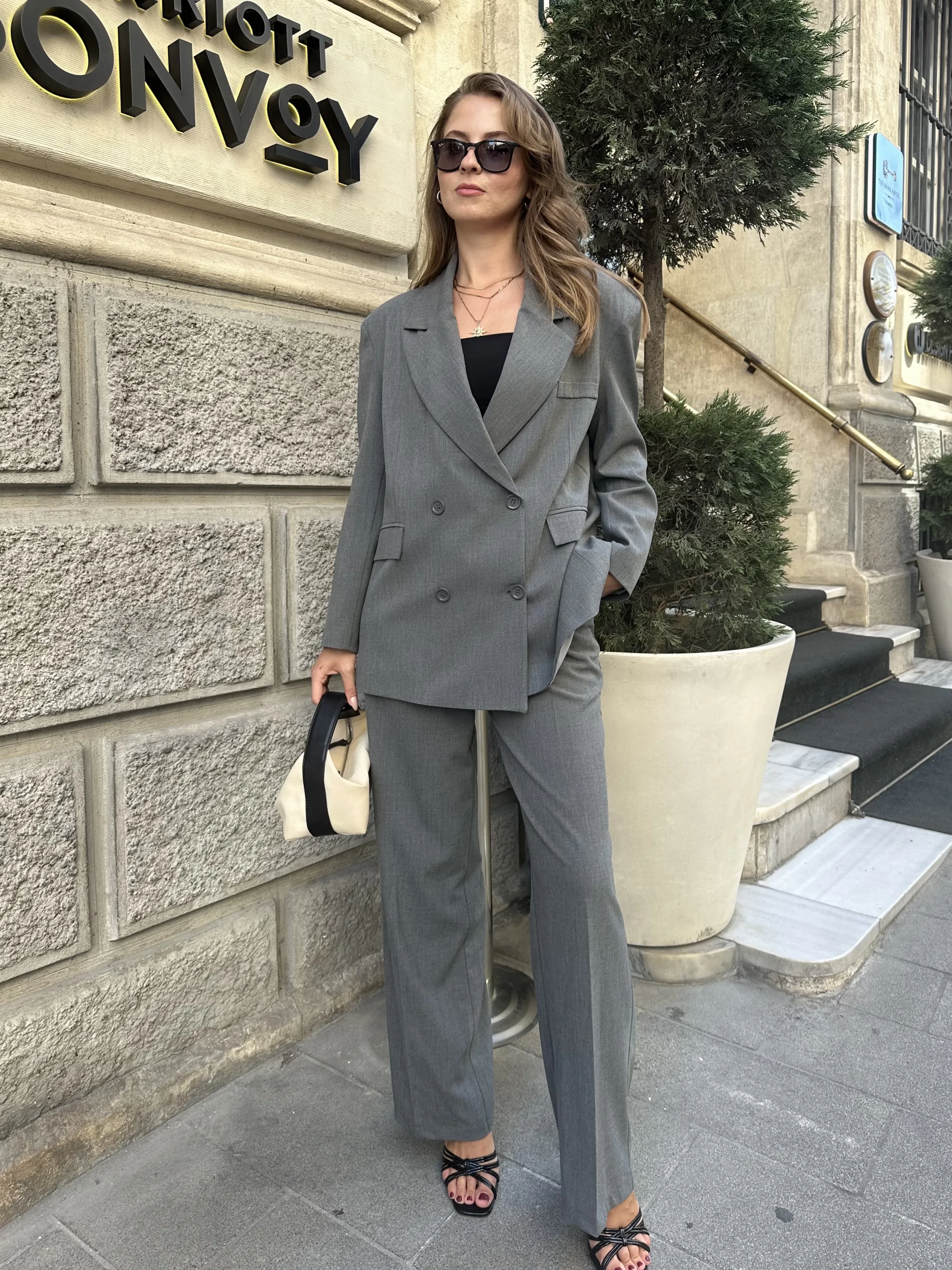 Gri Oversize Kruvaz Ceket Tam Kalıp Palazzo Pantolon Viskon Premium İkili Takım