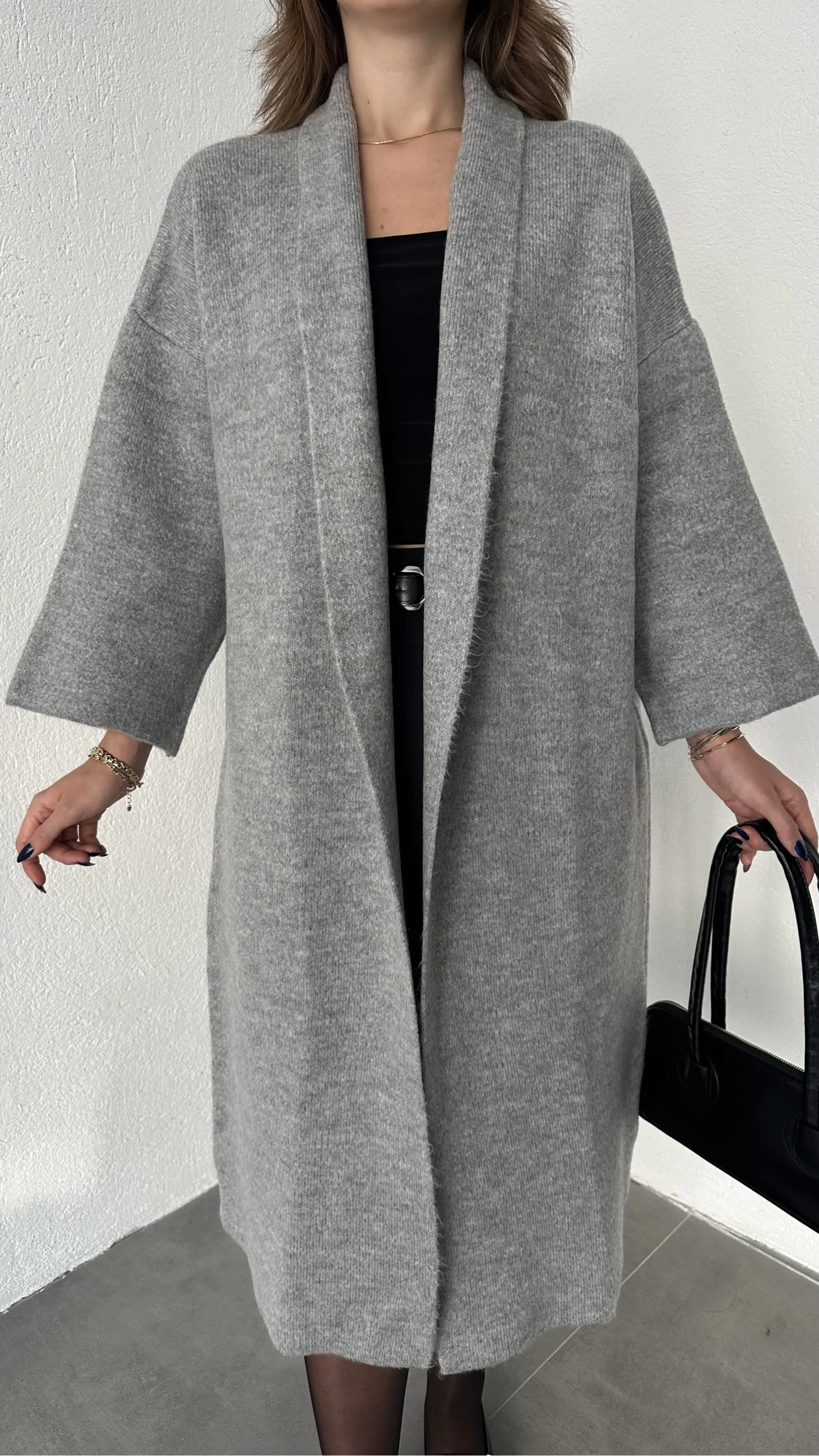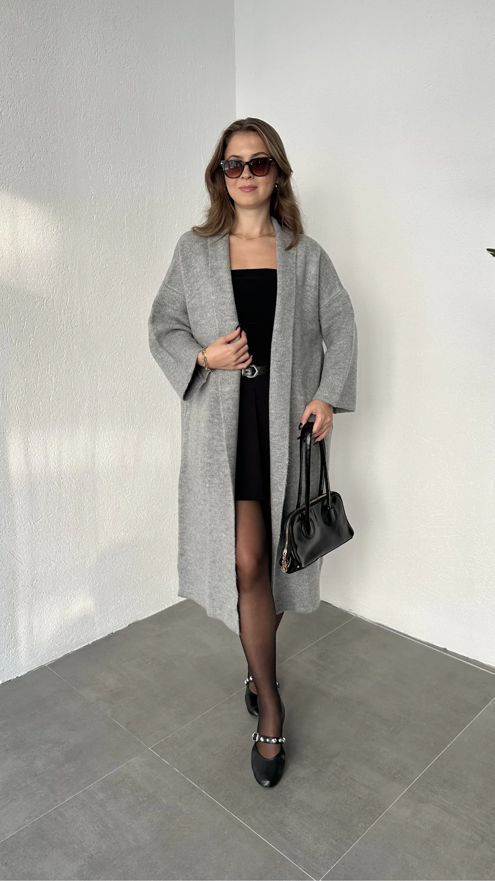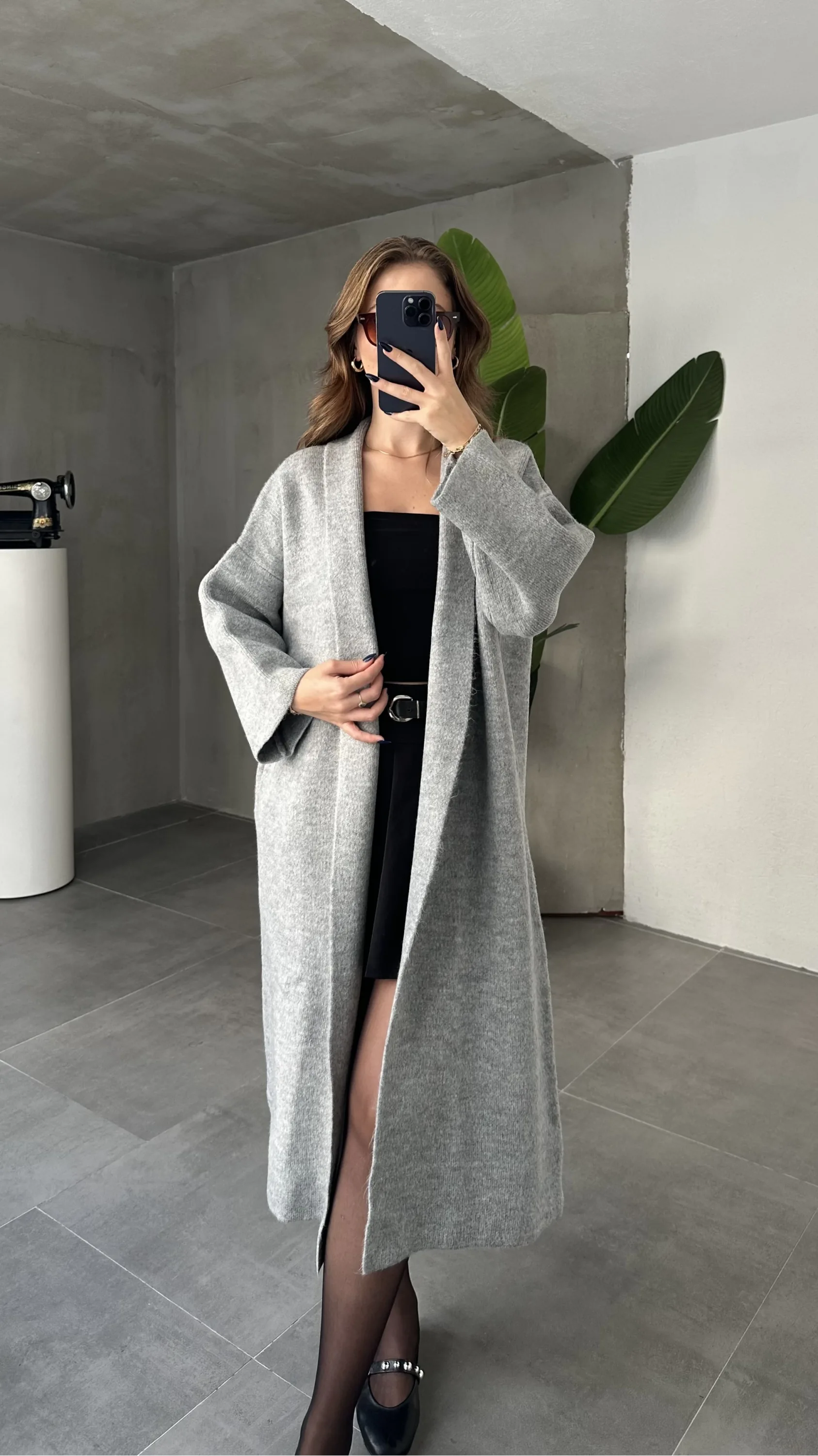 Gri Şal Yaka Tam Boy Uzun Salaş Oversize Triko Hırka