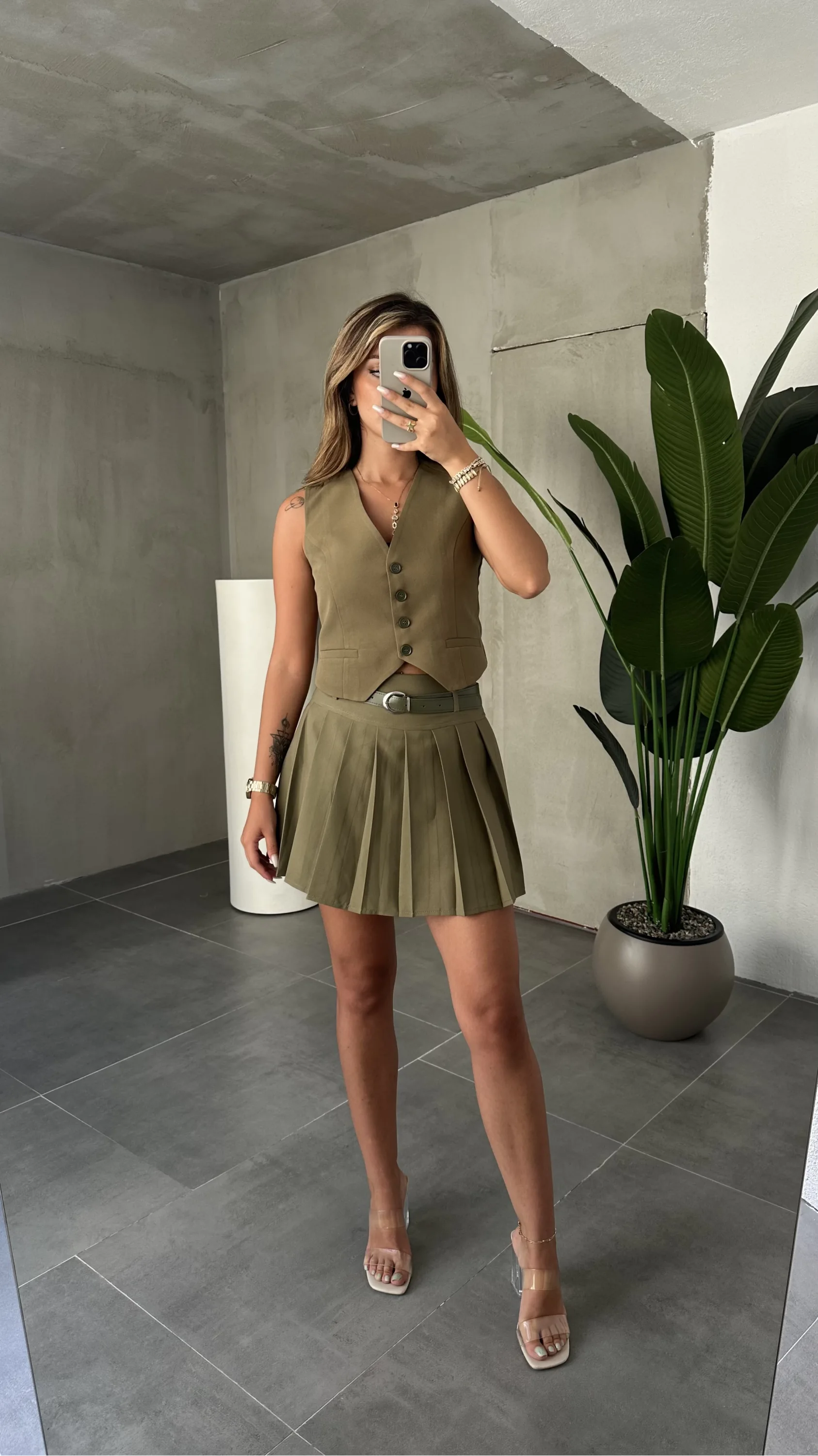 Haki Düğmeli Kolsuz Yelek&Astarlı Mini Şort Etek Alt Üst Takım