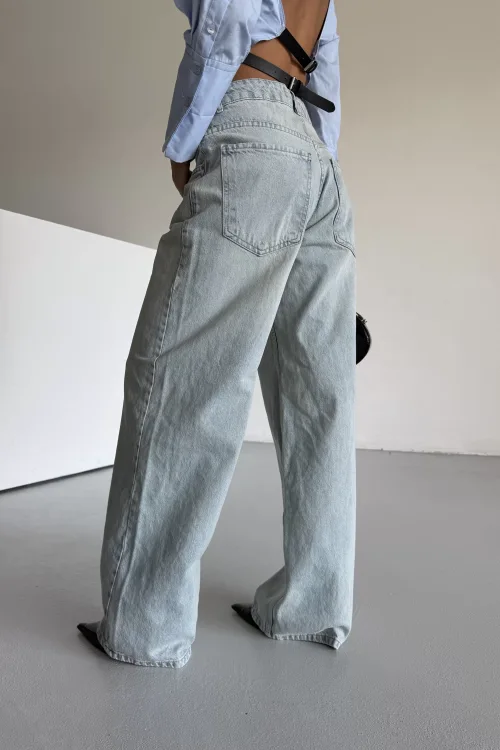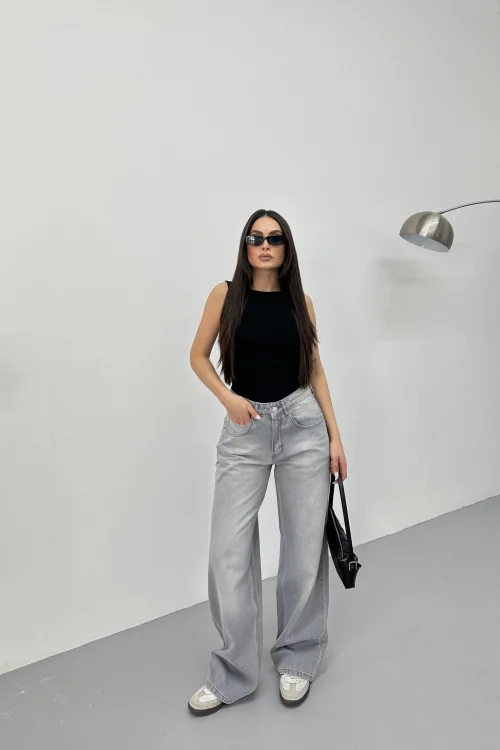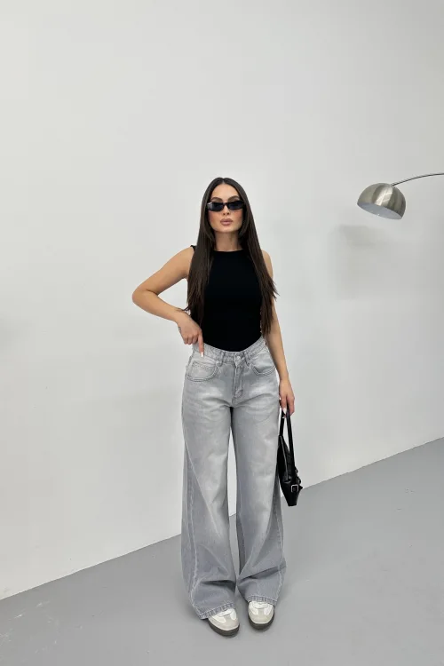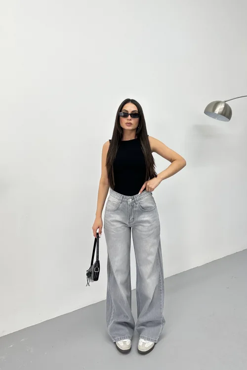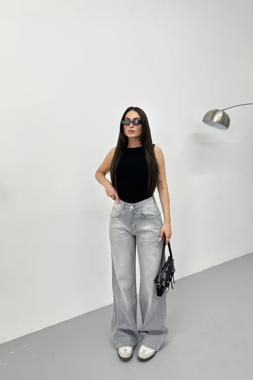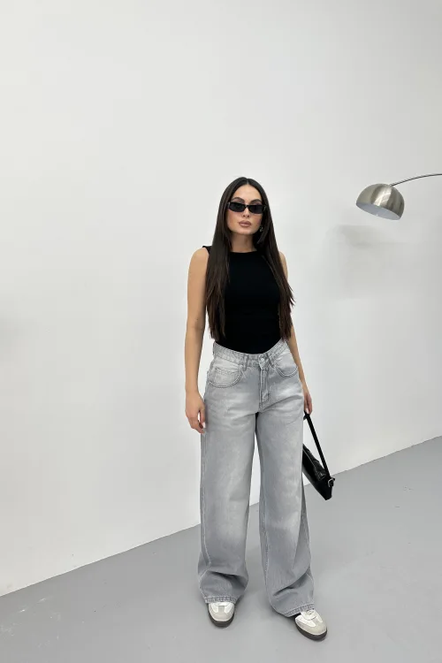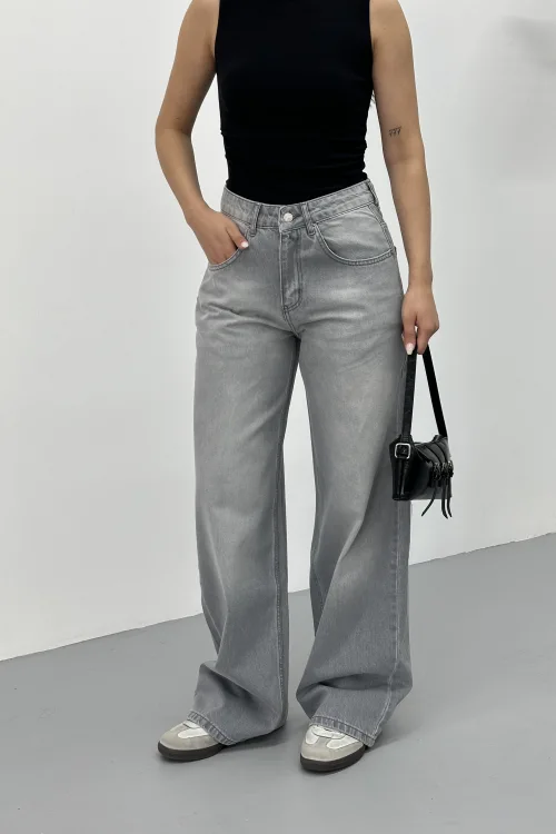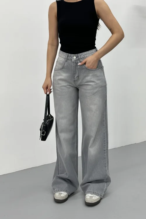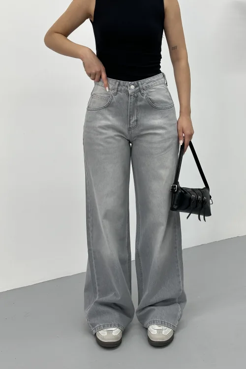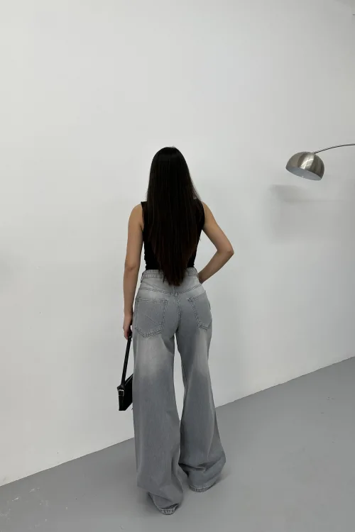 Açık Gri Yıkamalı Baggy Geniş Paça Yüksek Bel Oturtmalı Jean Kot Pantolon