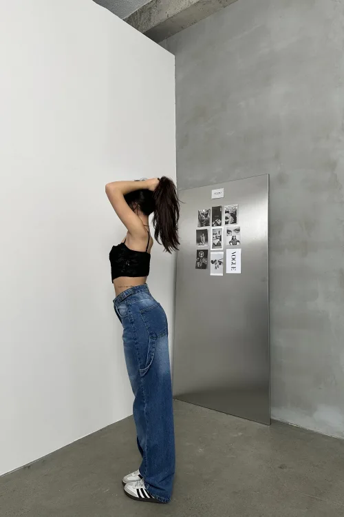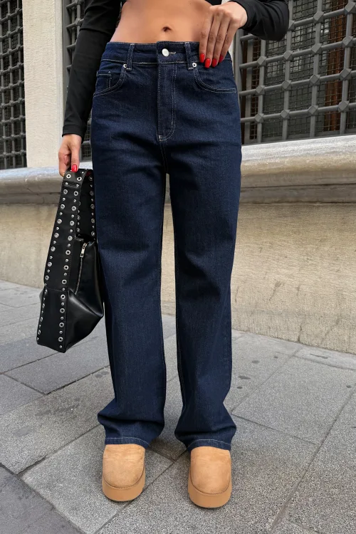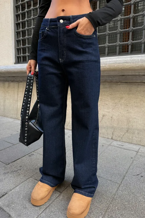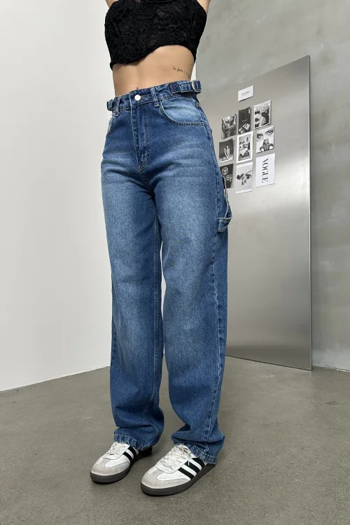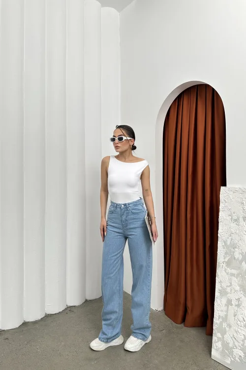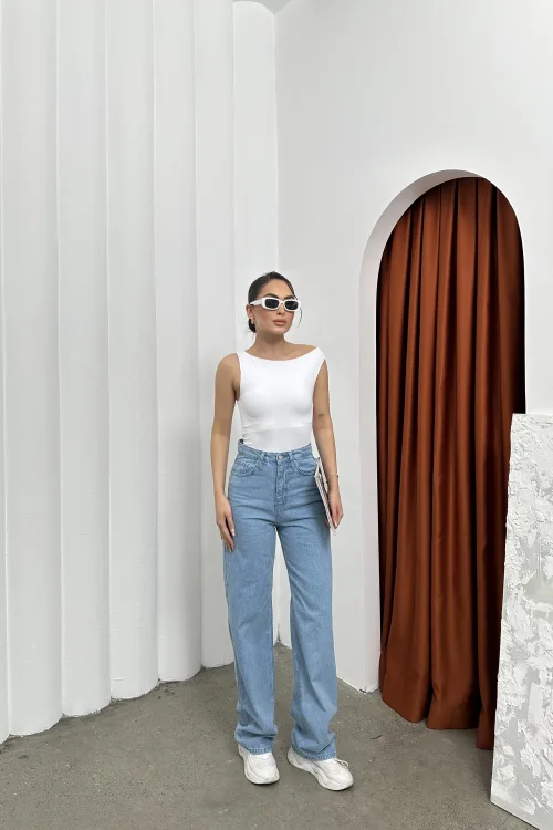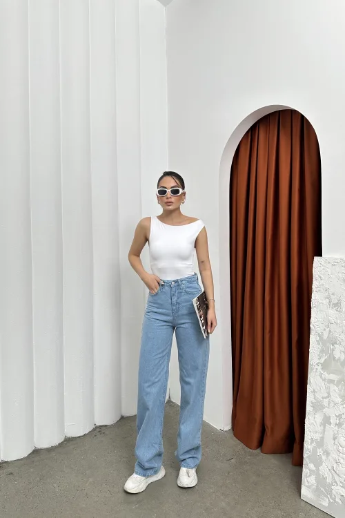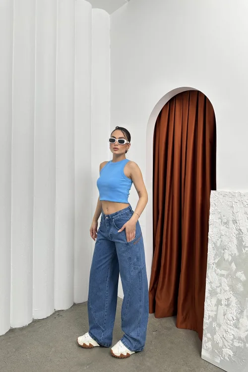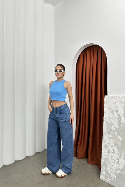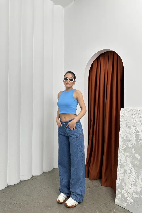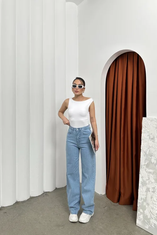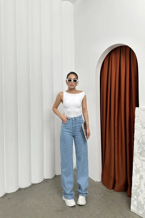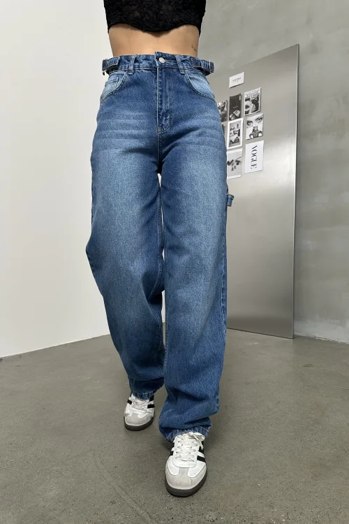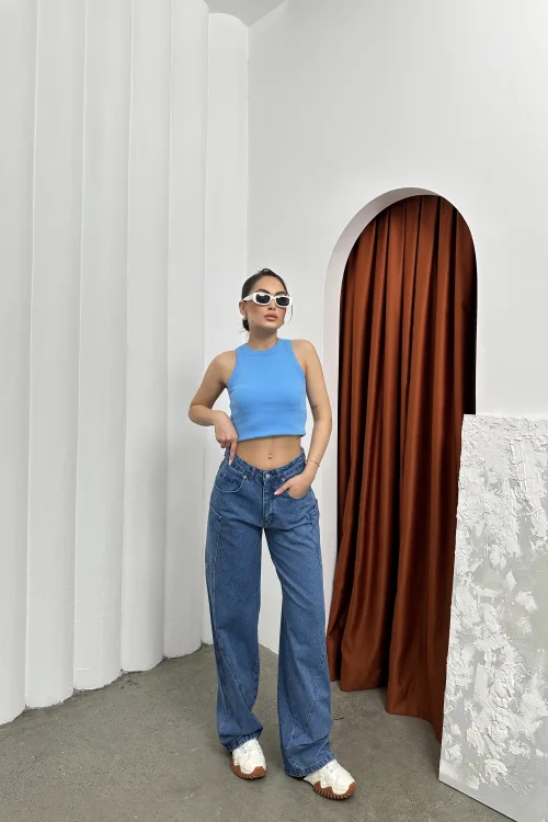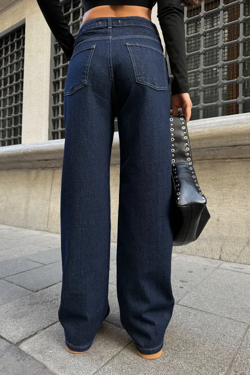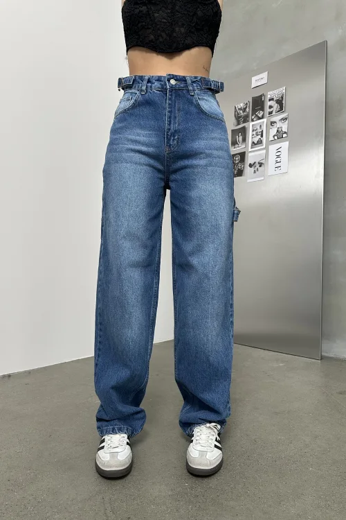 Sade Mavİ Rins Yıkamalı Yüksel Bel Bol Paça Baggy Jean Kot Pantolon