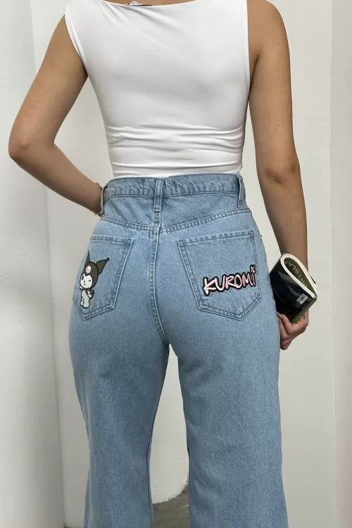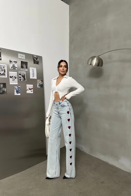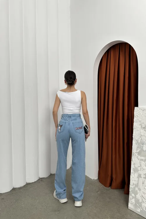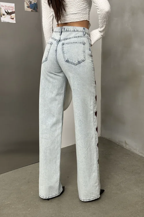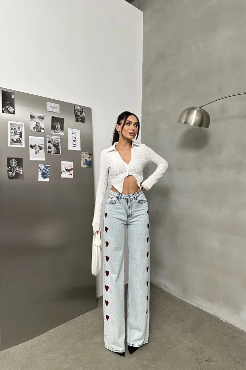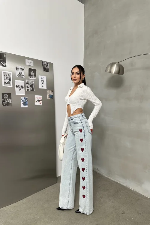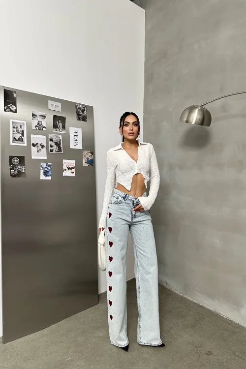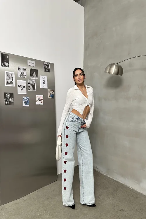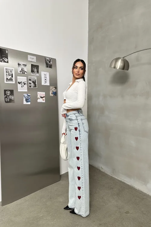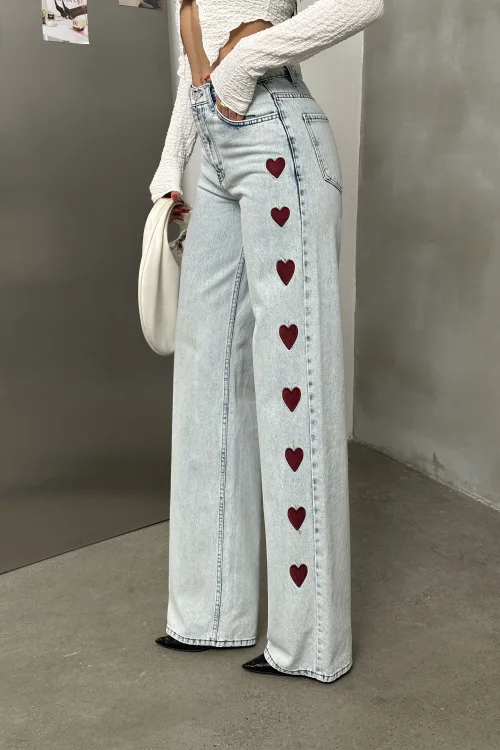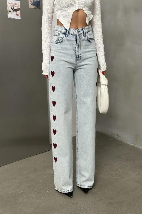 Açık Mavi Kalp İşlemeli Yıkamalı Baggy Geniş Paça Yüksek Bel Oturtmalı Jean Kot Pantolon
