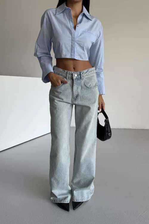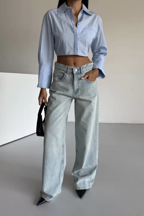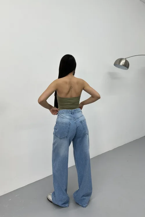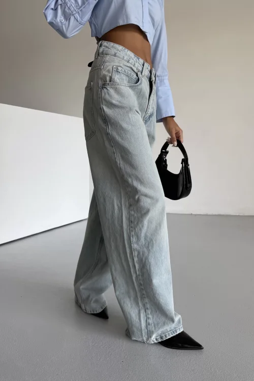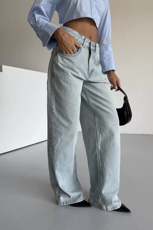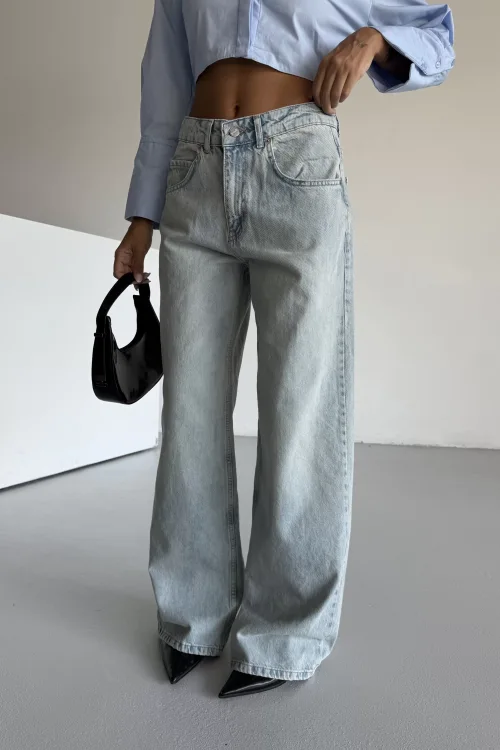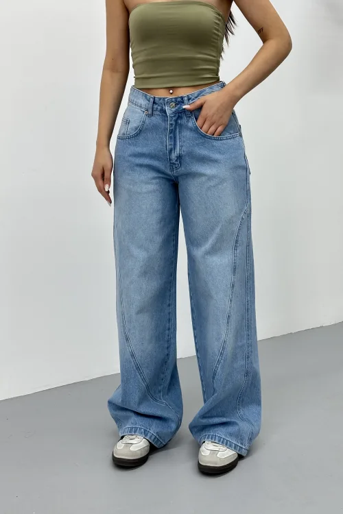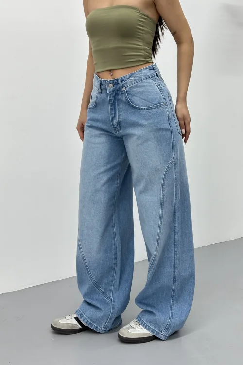 Açık Mavi Yıkamalı Baggy Geniş Paça Yüksel Bel Oturtmalı Jean Kot Pantolon