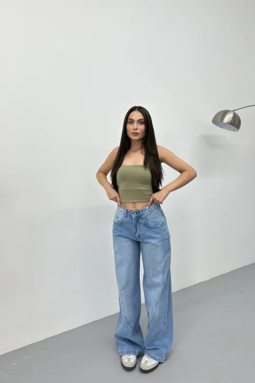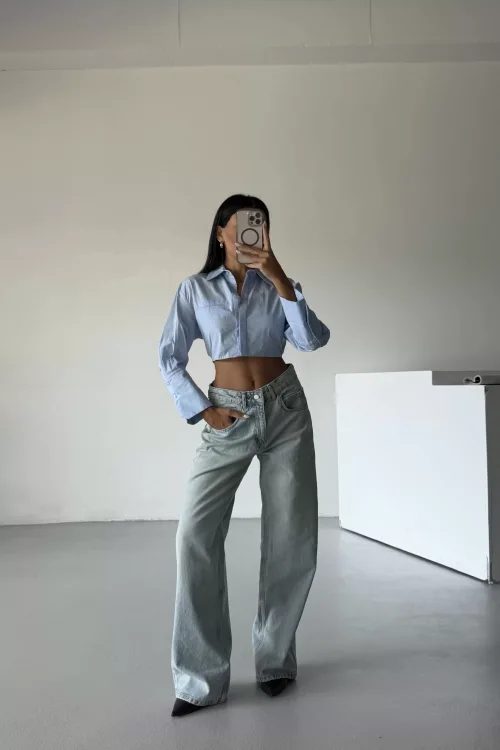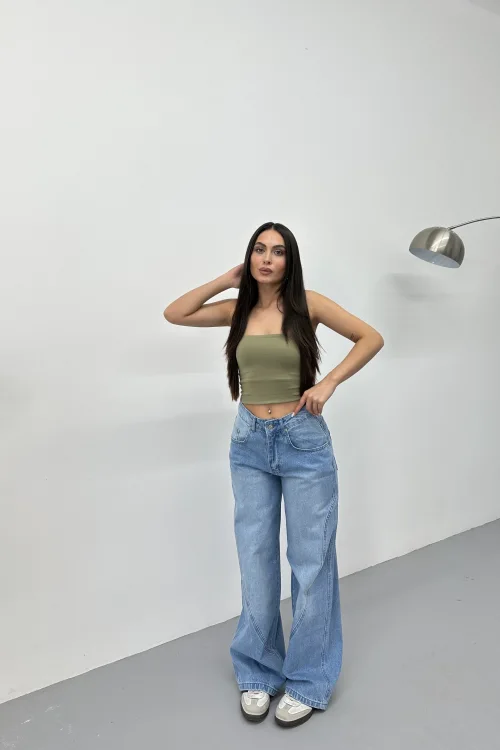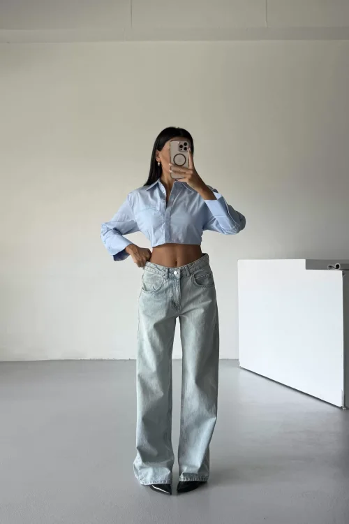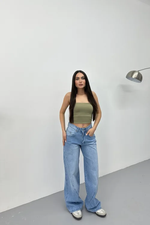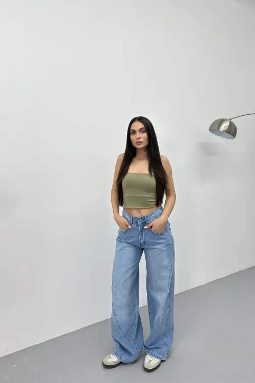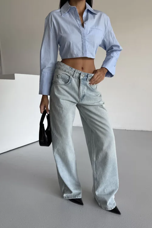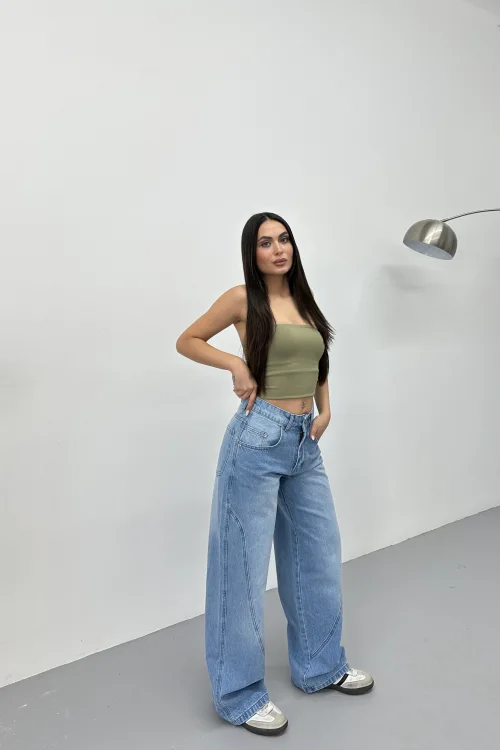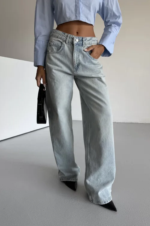 Açık Mavi Yıkamalı Baggy Geniş Paça Yüksel Bel Oturtmalı Jean Kot Pantolon