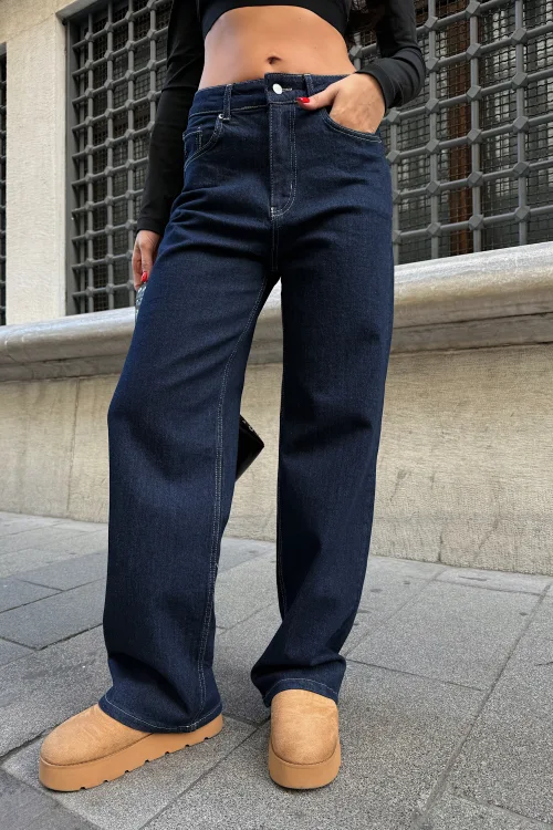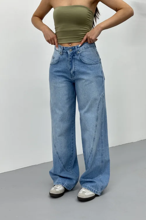 Mavi Dikiş Detaylı Yıkamalı Baggy Geniş Paça Yüksek Bel Oturtmalı Jean Kot Pantolon