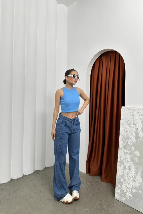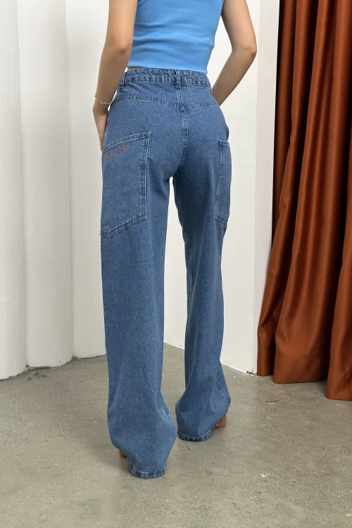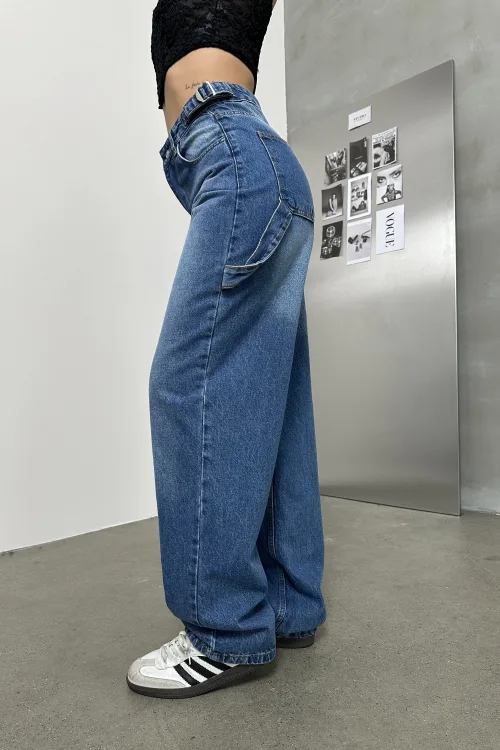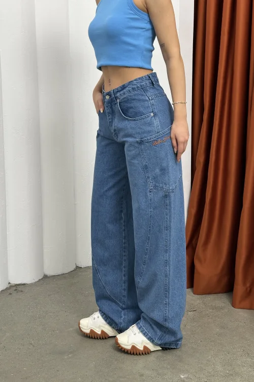 Mavi Retro Baggy Çok Cepli Geniş Kalıp Bel Oturtmalı Kot Jeans Pantolon