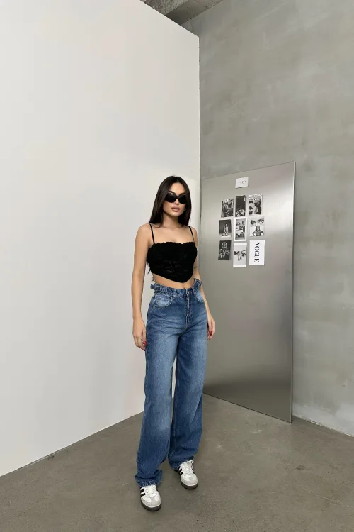 Mavi Palaska Tokalı Yıkamalı Baggy Geniş Paça Yüksek Bel Oturtmalı Jean Kot Pantolon