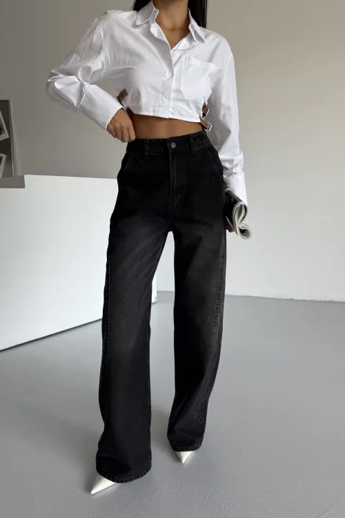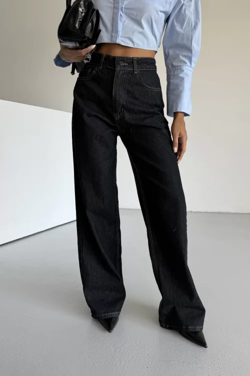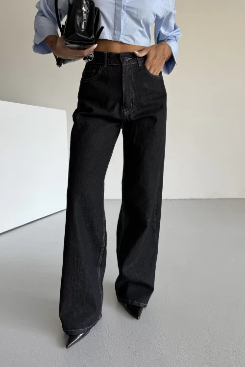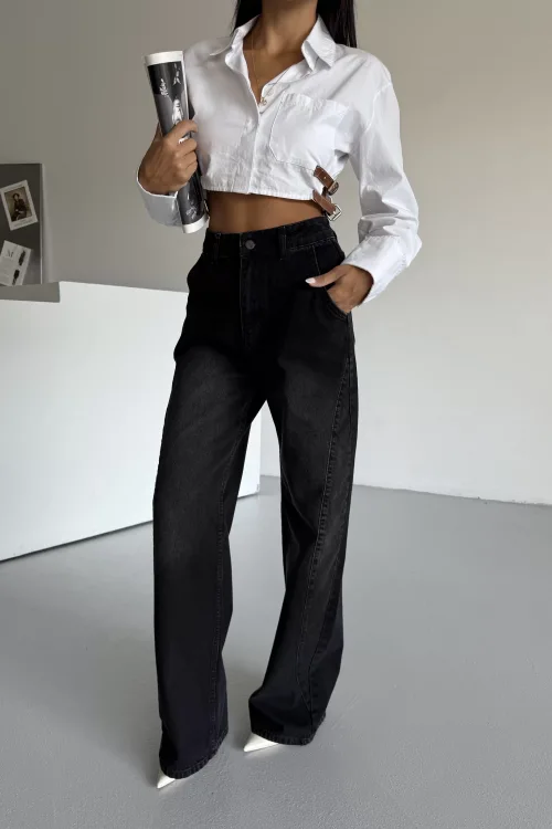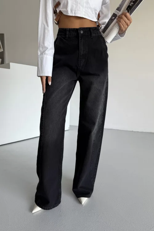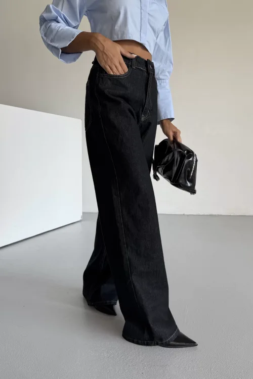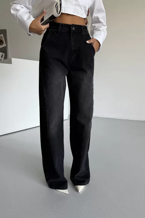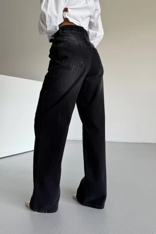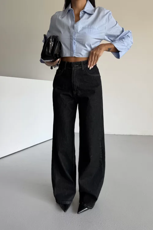 Sade Siyah Rins Yıkamalı Baggy Geniş Paça Yüksek Bel Oturtmalı Jean Kot Pantolon