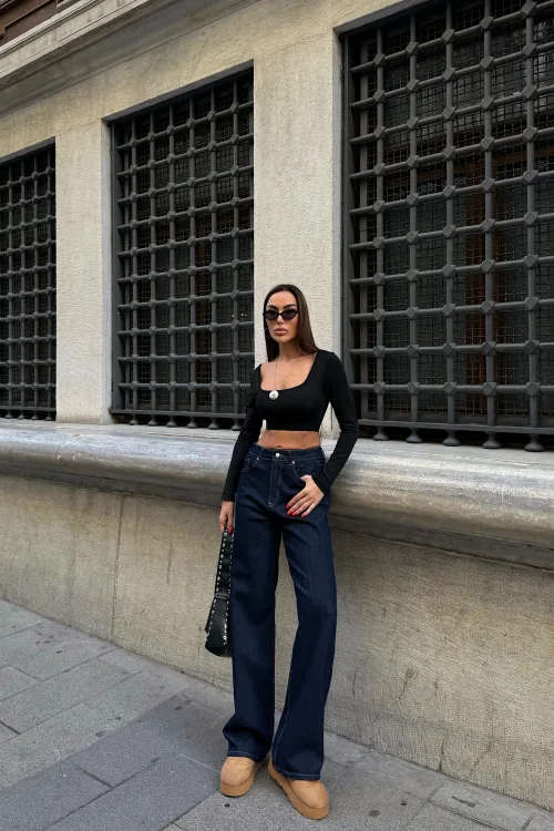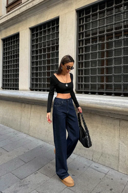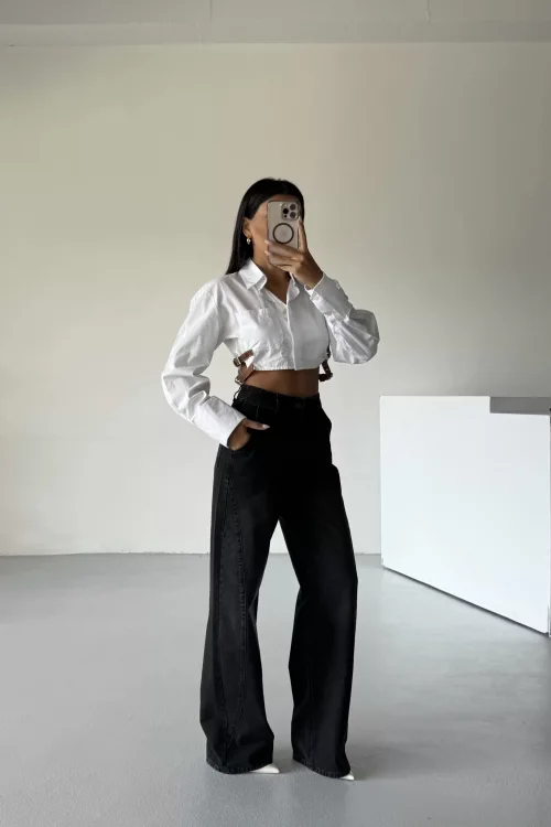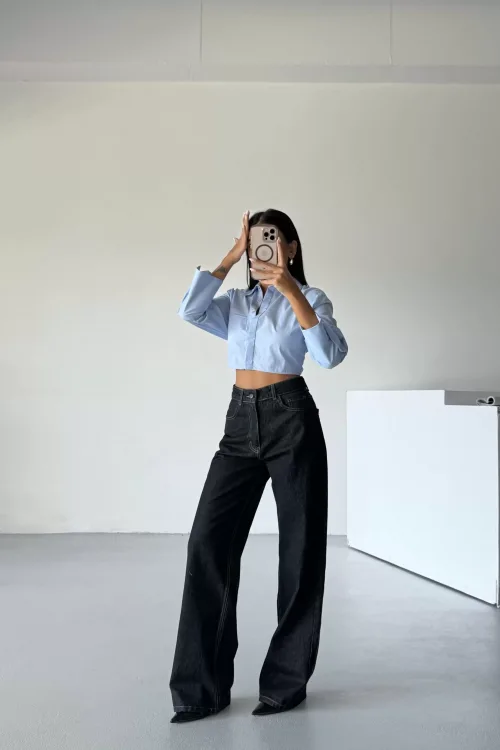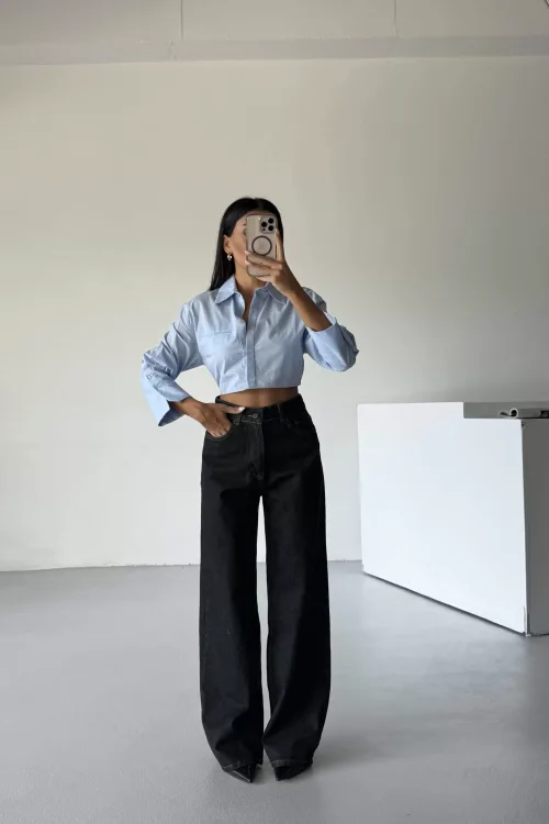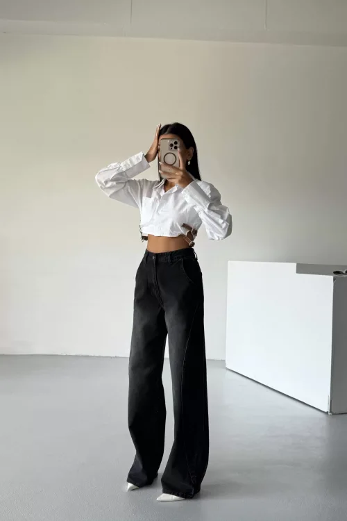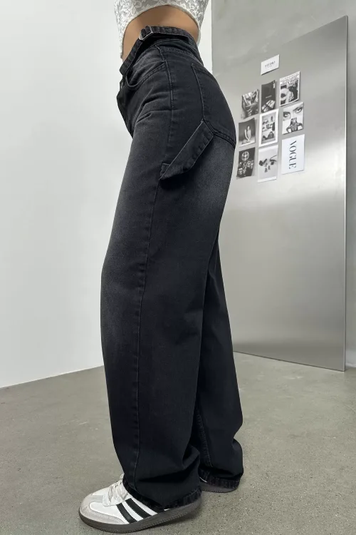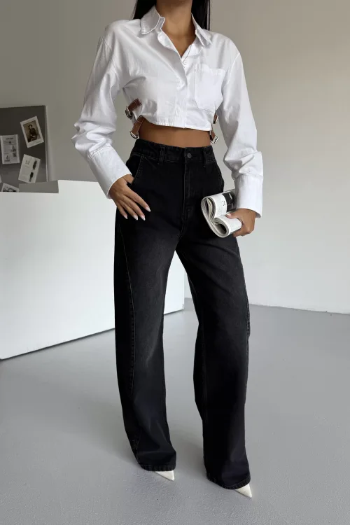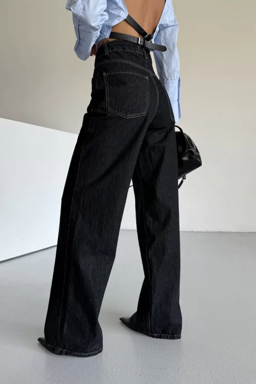 Sade Siyah Rins Yıkamalı Baggy Geniş Paça Yüksek Bel Oturtmalı Jean Kot Pantolon