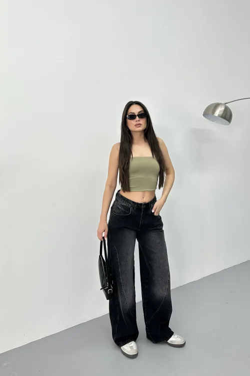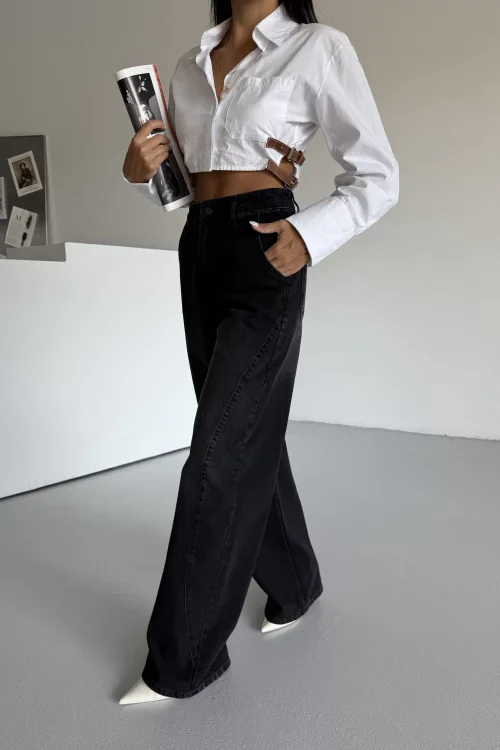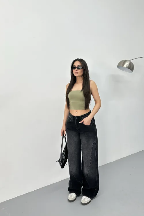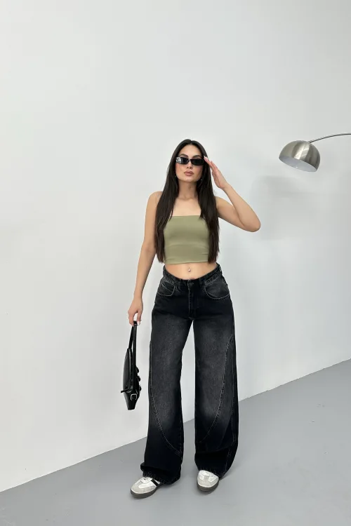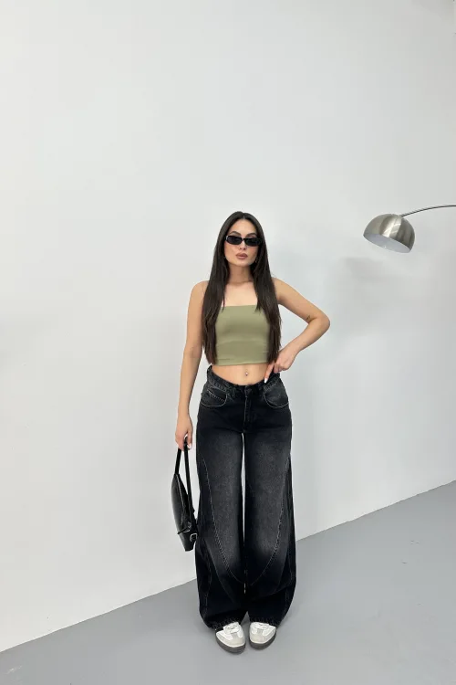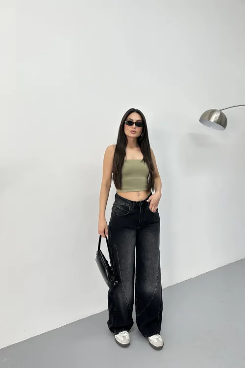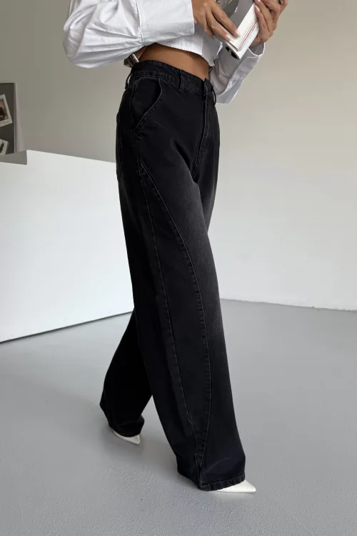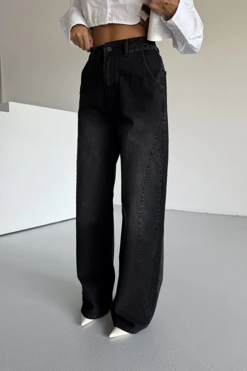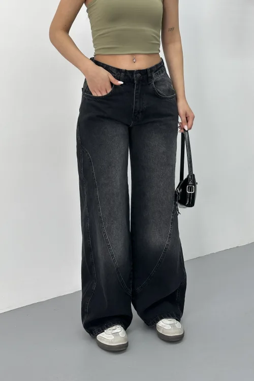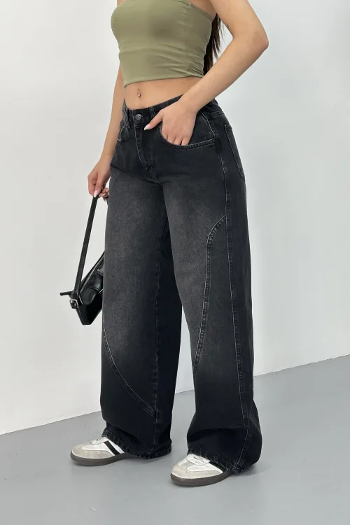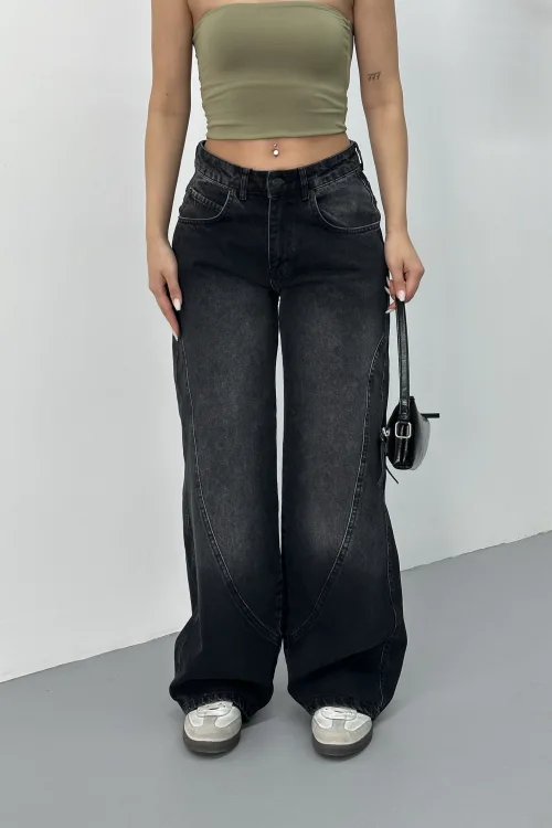 Siyah Dikiş Detaylı Yıkamalı Baggy Geniş Paça Yüksek Bel Oturtmalı Jean Kot Pantolon