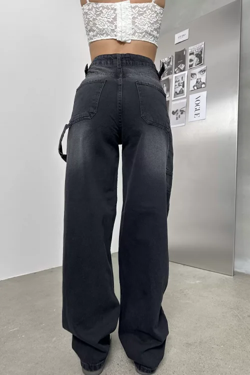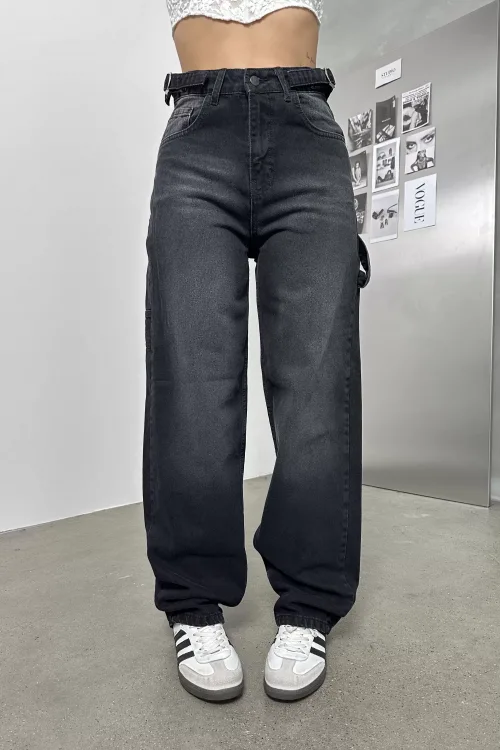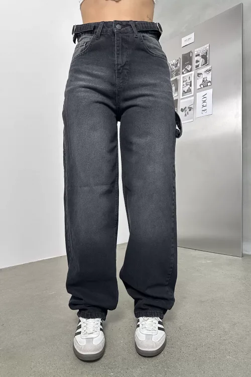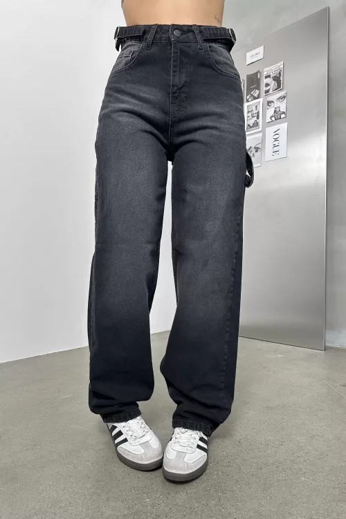 Siyah Palaska Tokalı Yıkamalı Baggy Geniş Paça Yüksek Bel Oturtmalı Jean Kot Pantolon