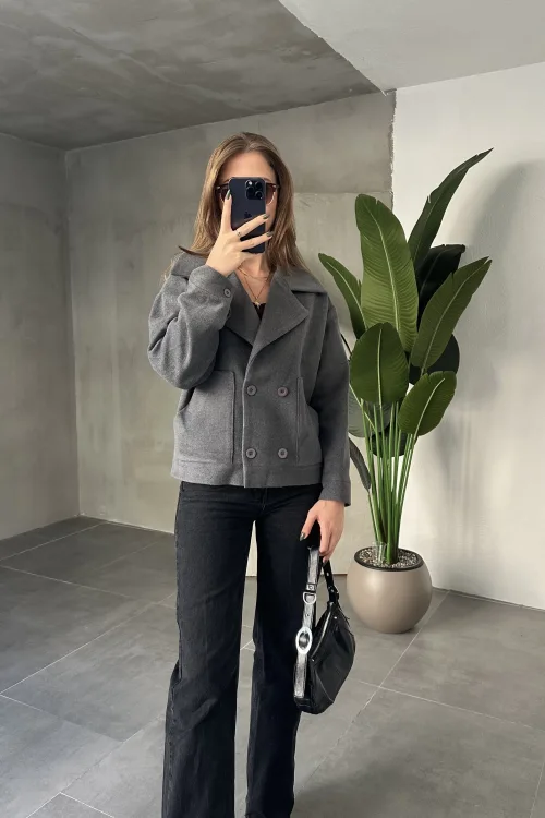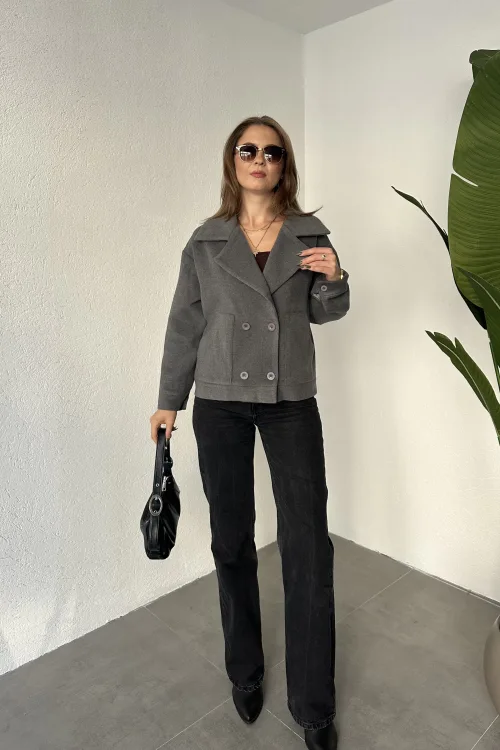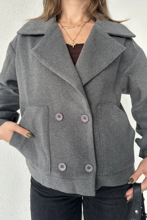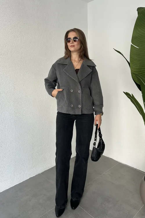 Antrasit Kısa Kruvaze Oversize Astarlı Cepli Kaşe Ceket Mont