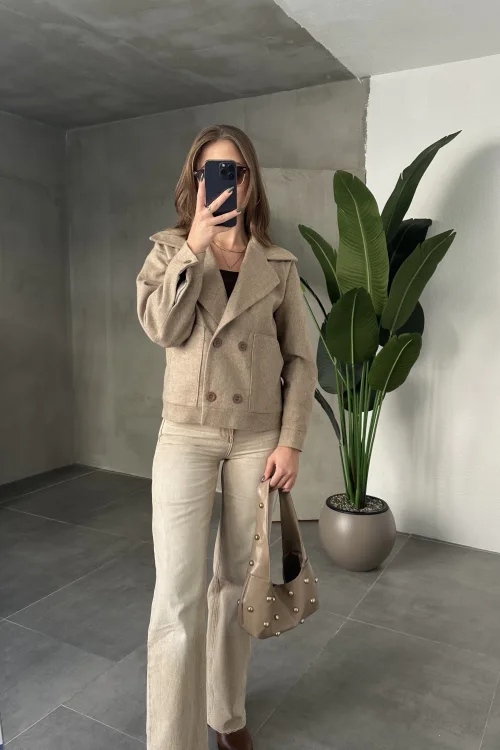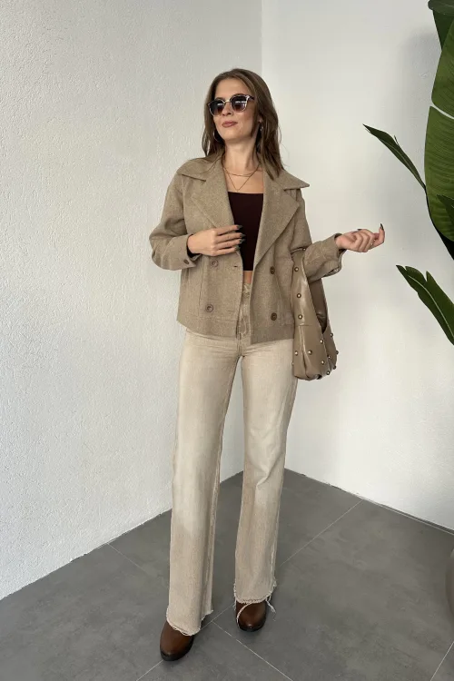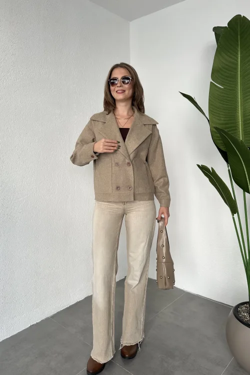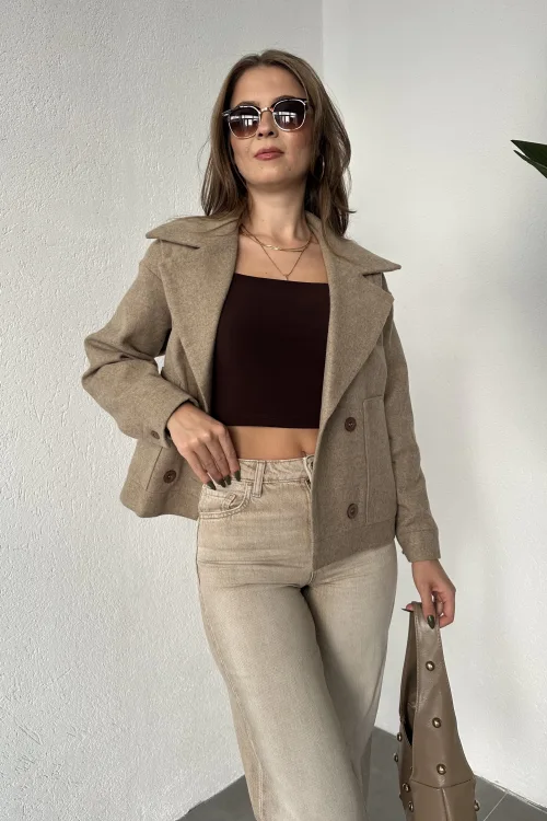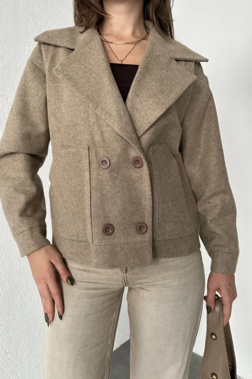 Vizon Kısa Kruvaze Oversize Astarlı Cepli Kaşe Ceket Mont
