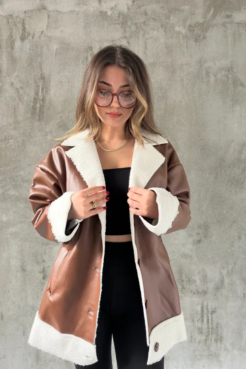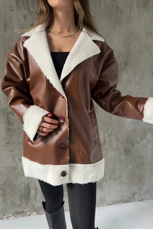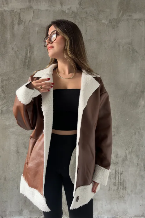Kahverengi İçi Kürklü Cepli Deri Peluş Kaban