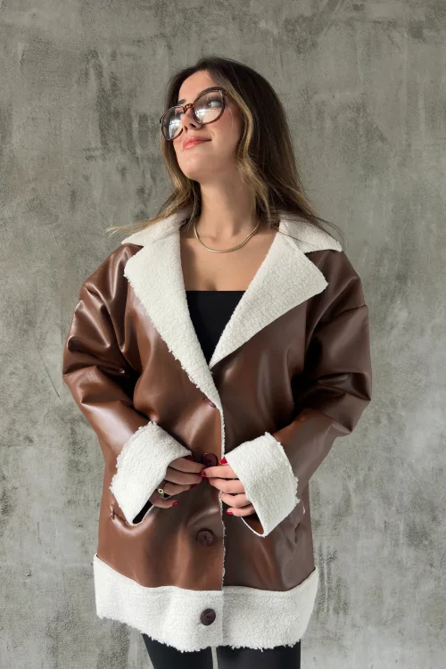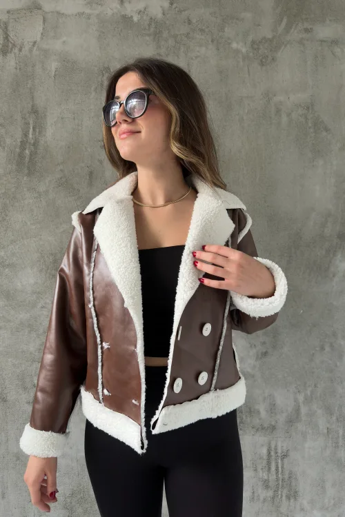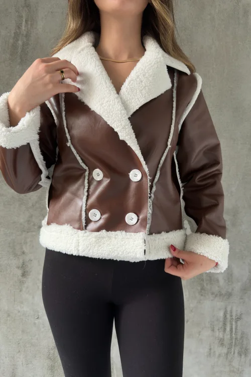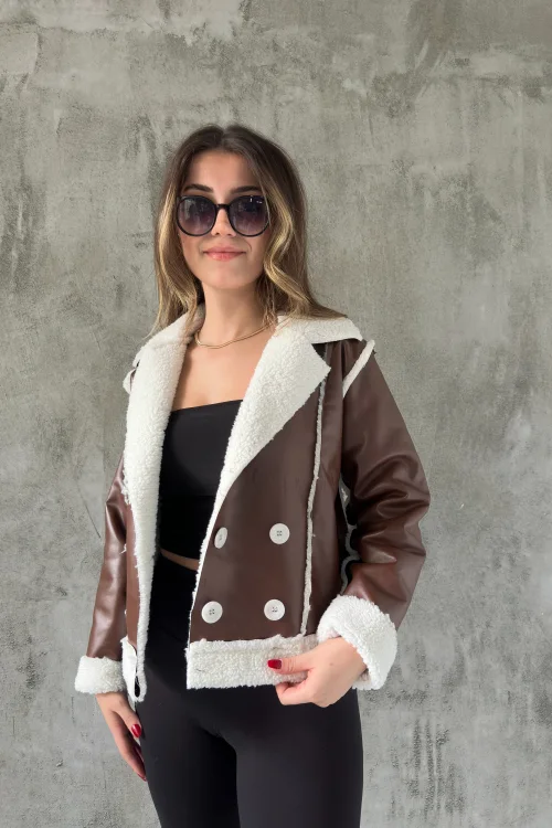 Kadın Kahverengi İçi Kürklü Kruvaze Deri Peluş Ceket Mont