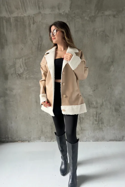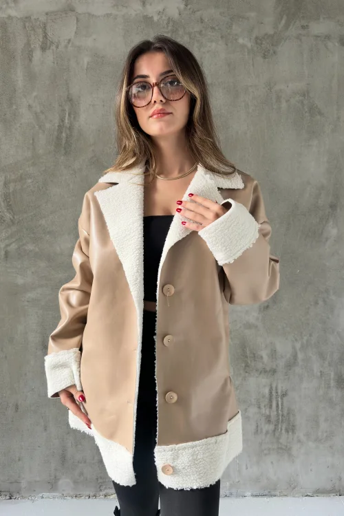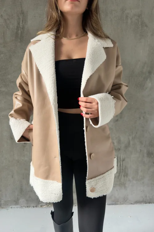 Krem İçi Kürklü Cepli Deri Peluş Kaban
