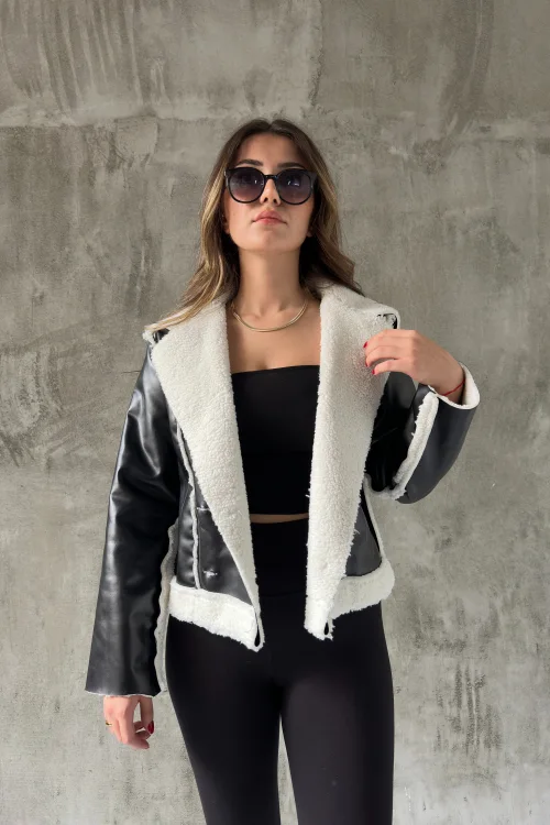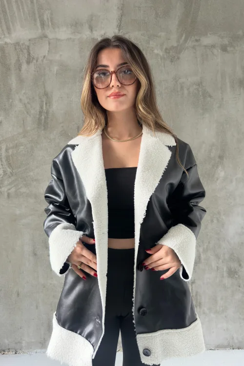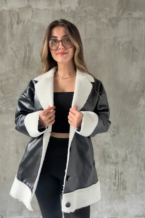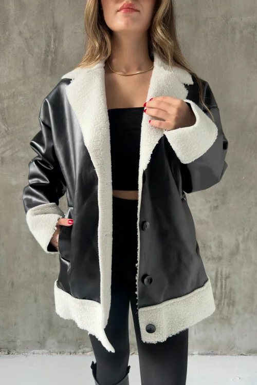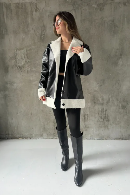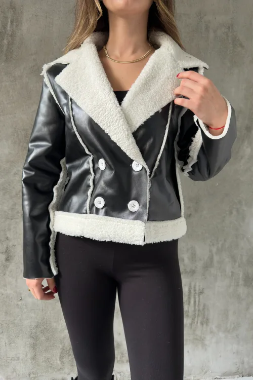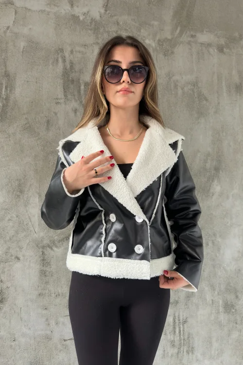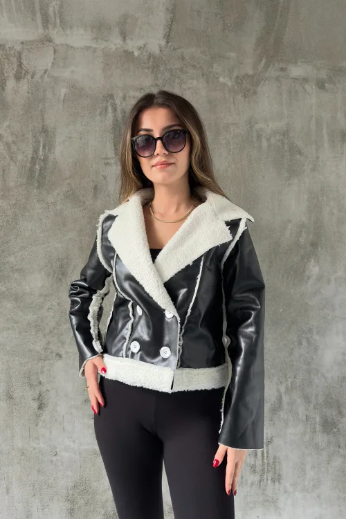 Siyah İçi Kürklü Kruvaze Deri Peluş Ceket Mont