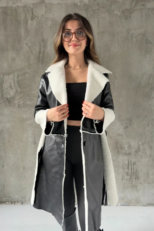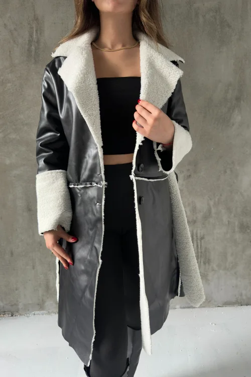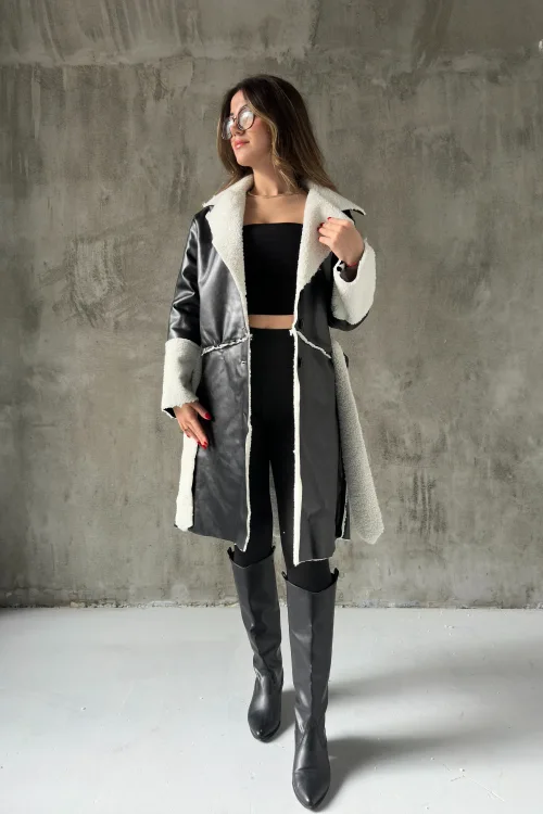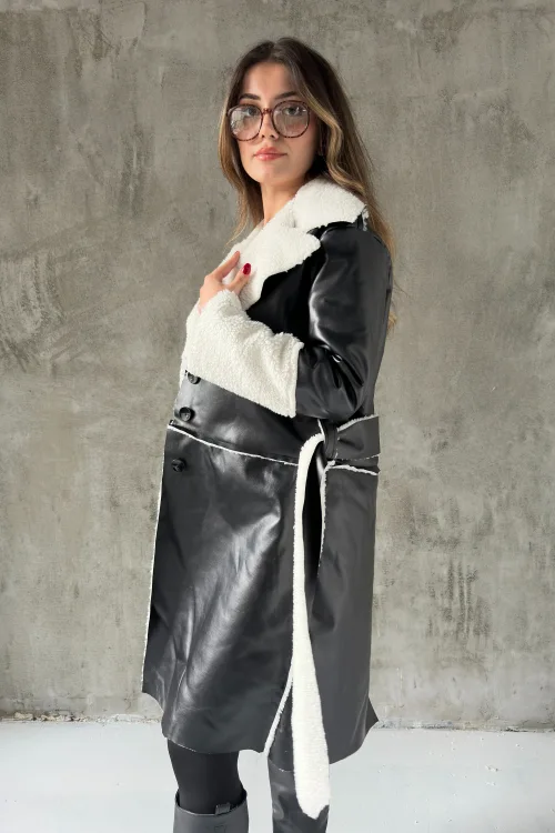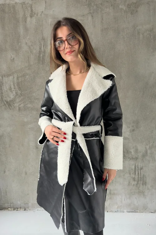 Siyah İçi Kürklü Kuşaklı Deri Peluş Kaban