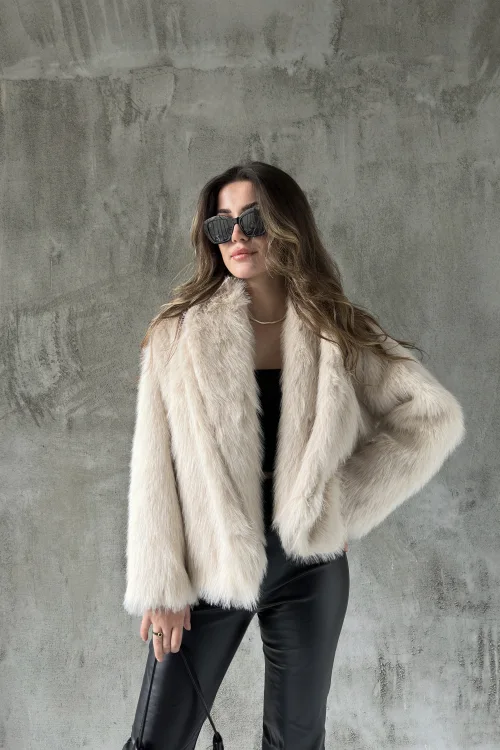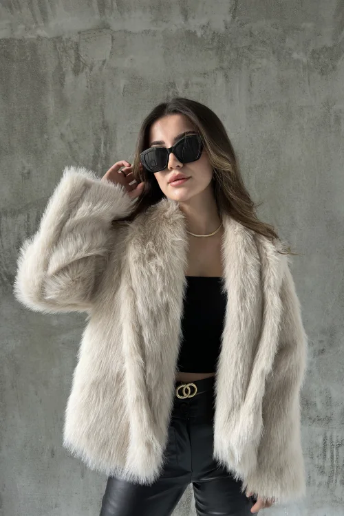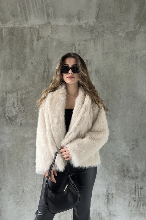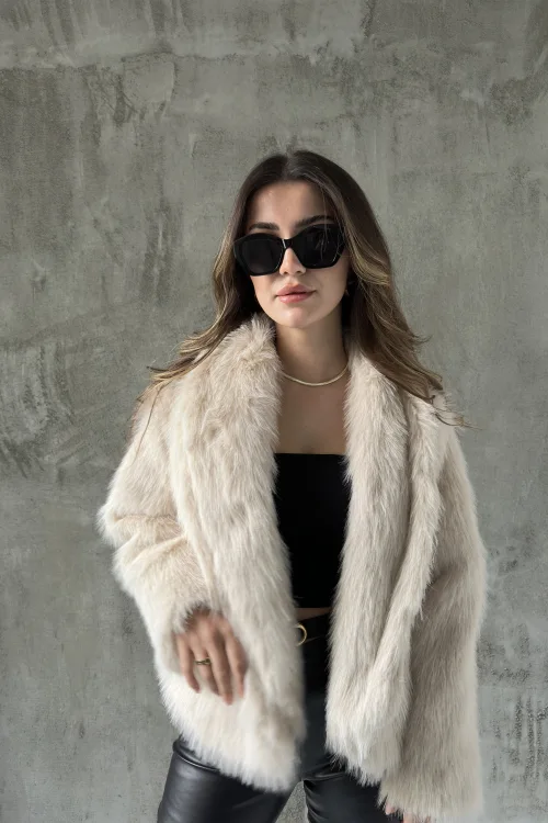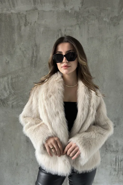 Bej Şal Yaka Astarlı Premium Suni Kürk Mont