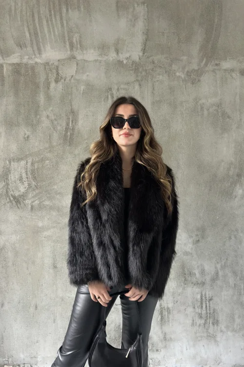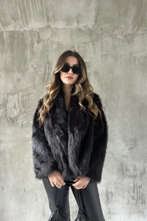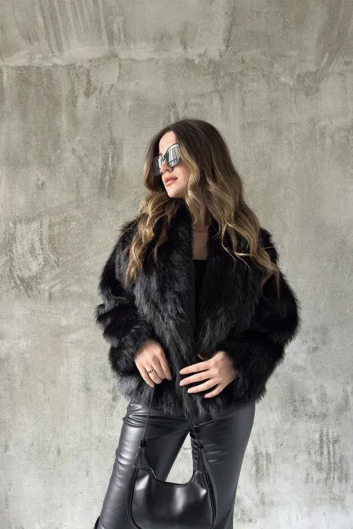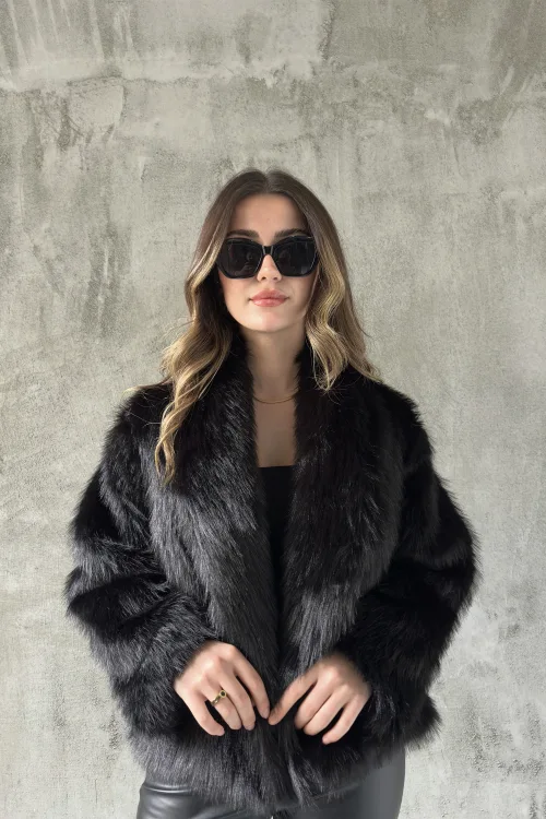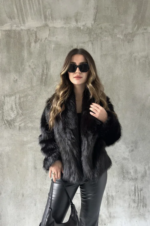 Siyah Şal Yaka Astarlı Premium Suni Kürk Mont