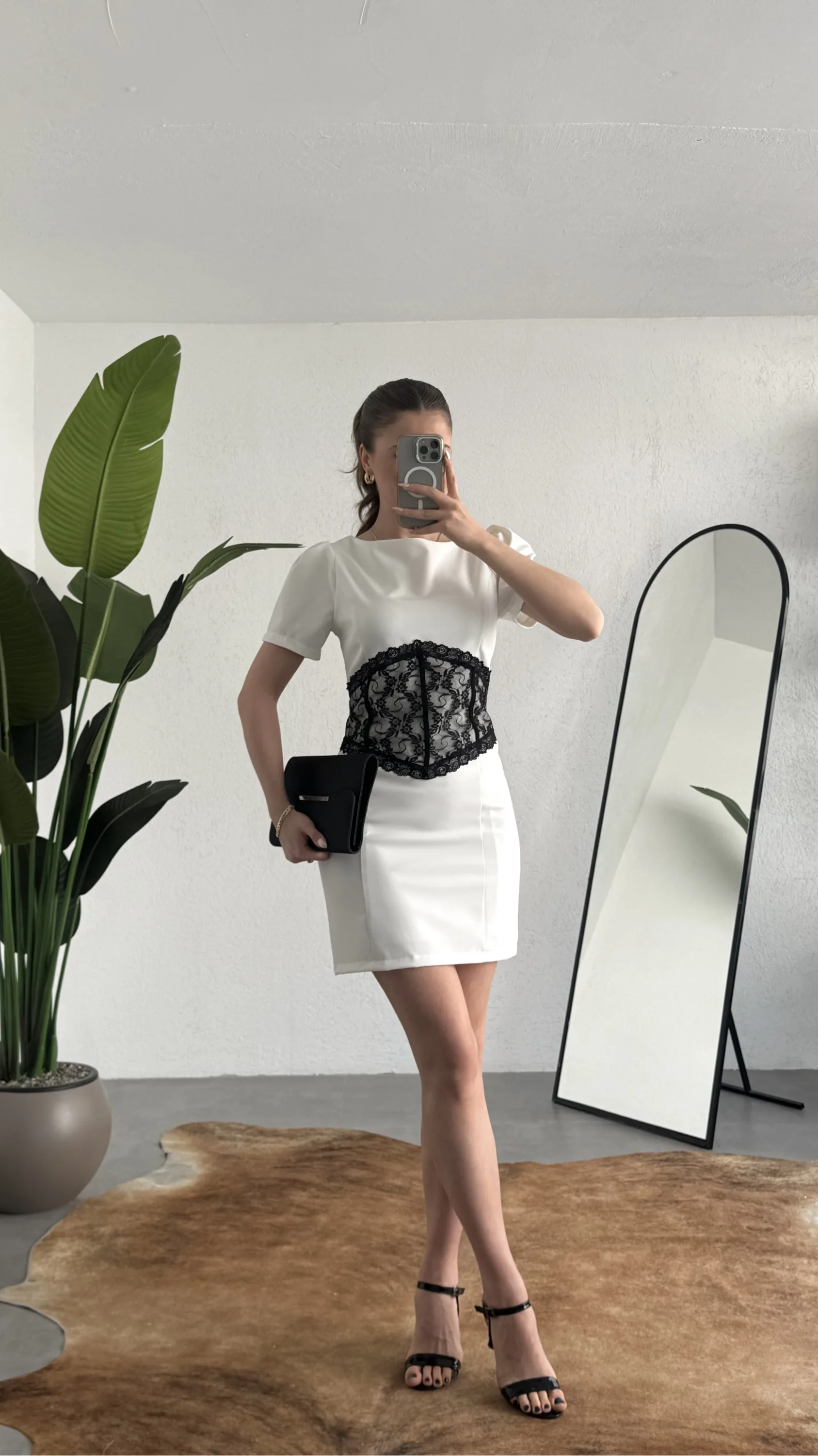 Minimal siyah üst form, zamansız bir zarafet sunarken; bel kısmındaki dantel korse detayı silueti net bir şekilde şekillendirir ve feminen duruşu ön plana çıkarır. Kısa kollu tasarımı ile dengeli bir görünüm sunarken, mini boy kesimi modern ve iddialı bir stil oluşturur.