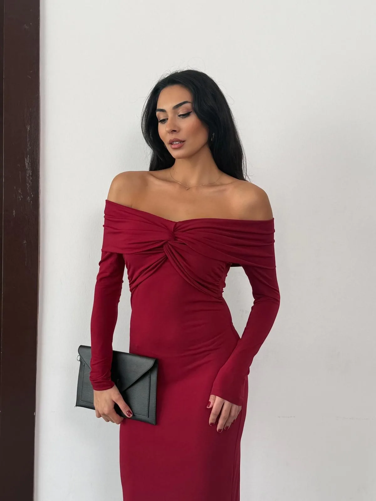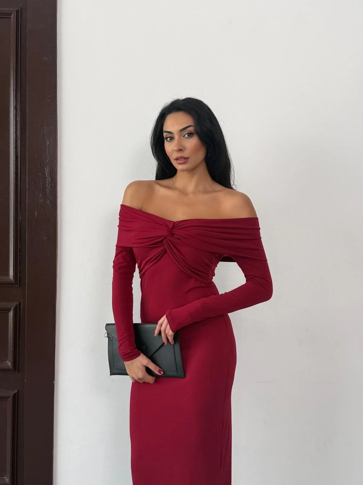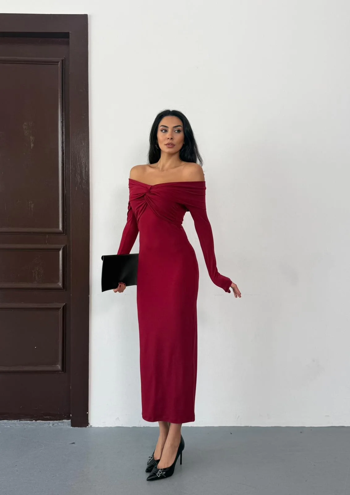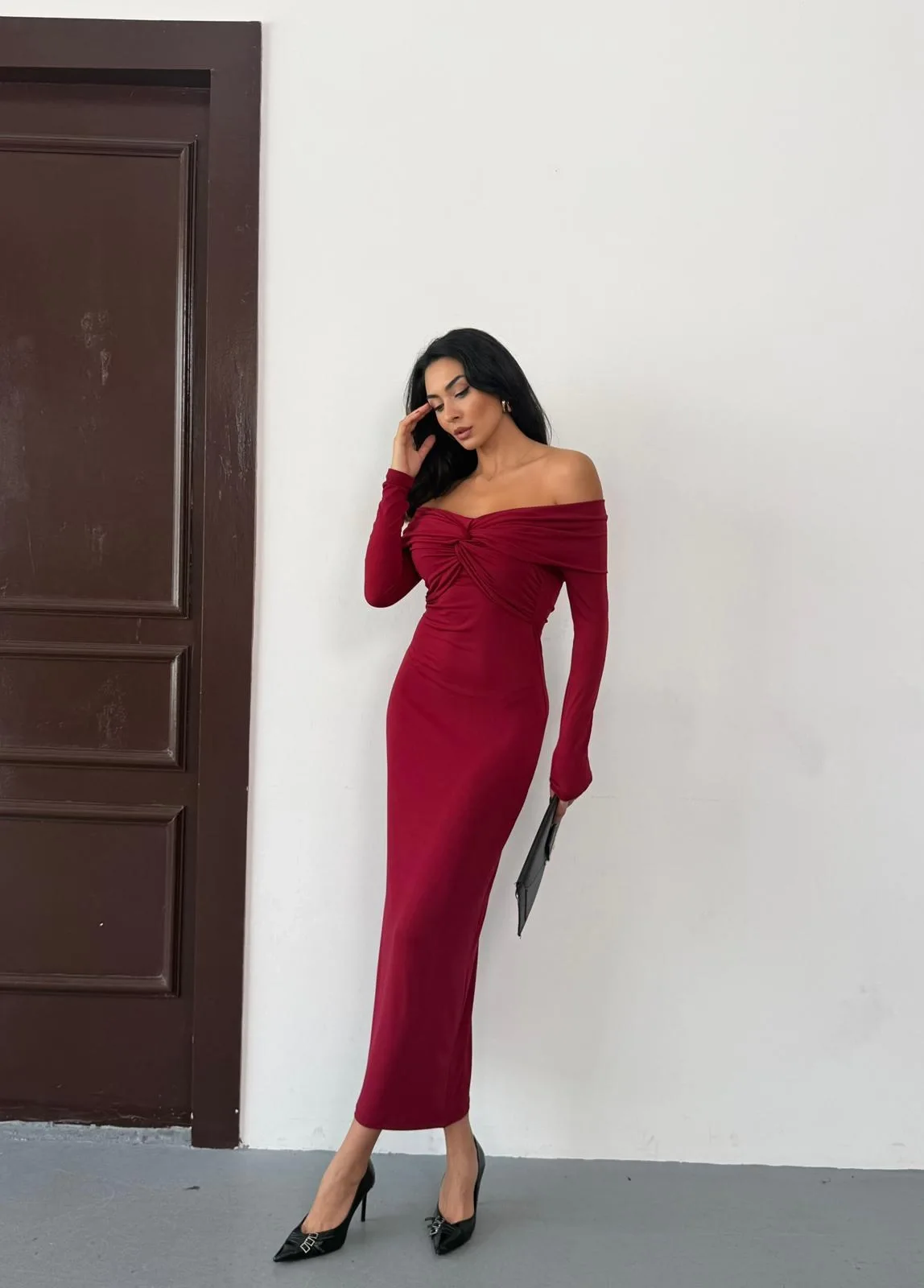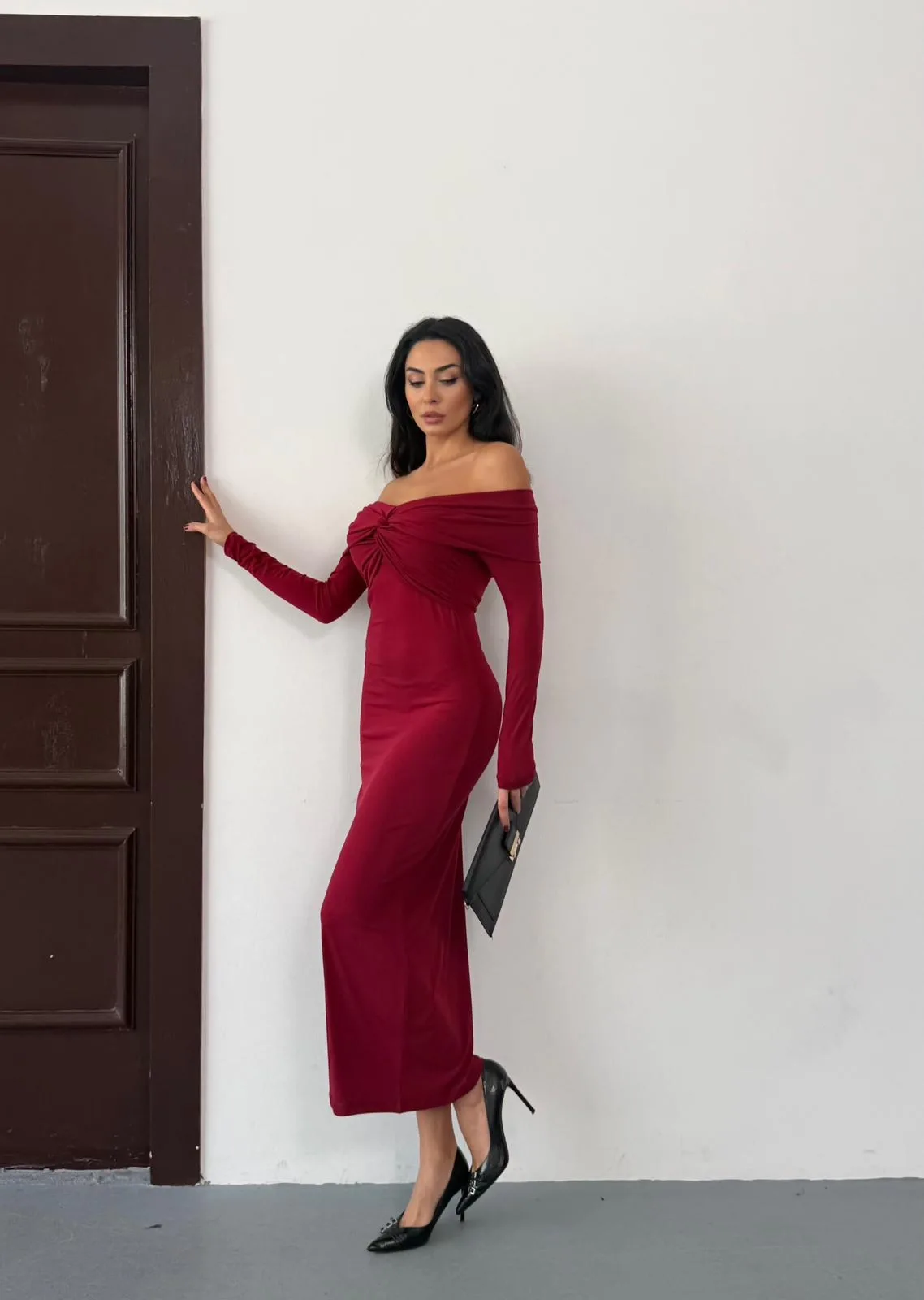 Kadın Bordo Madonna Yaka Düğümlü Uzun Kollu Midi Boy Elbise