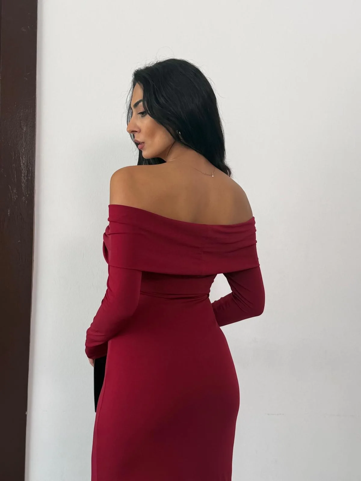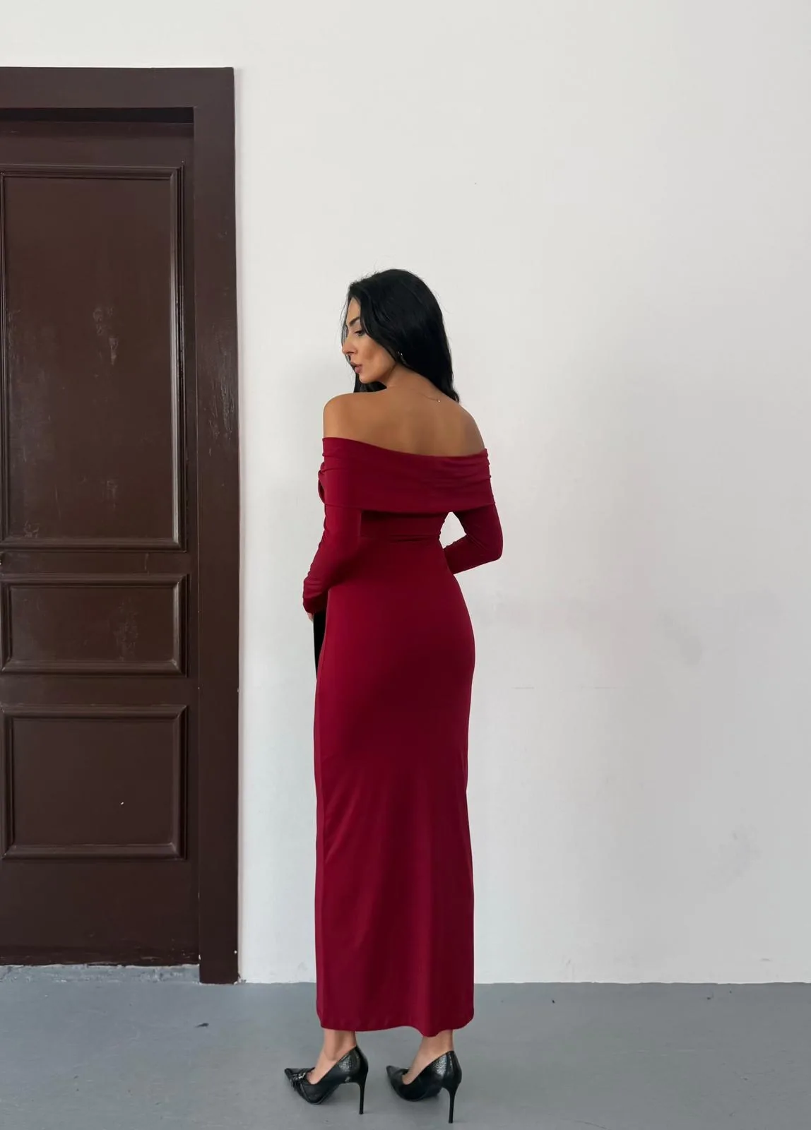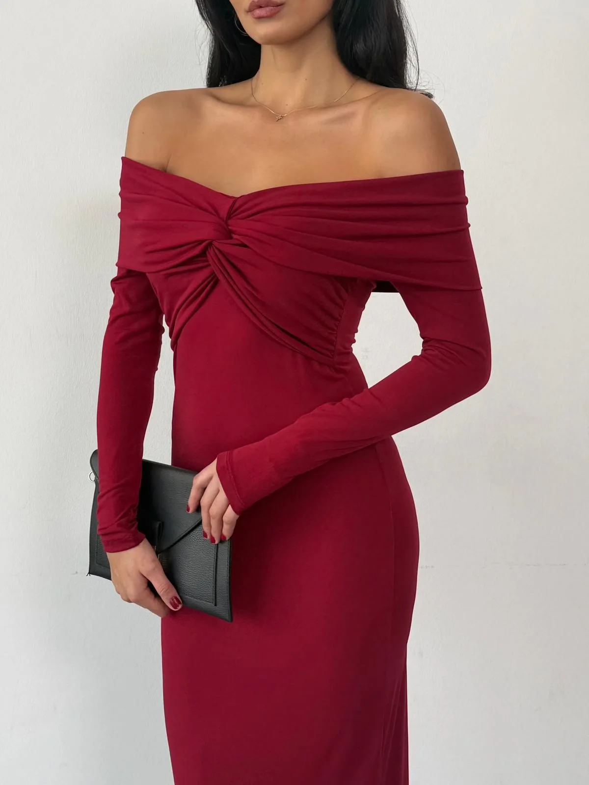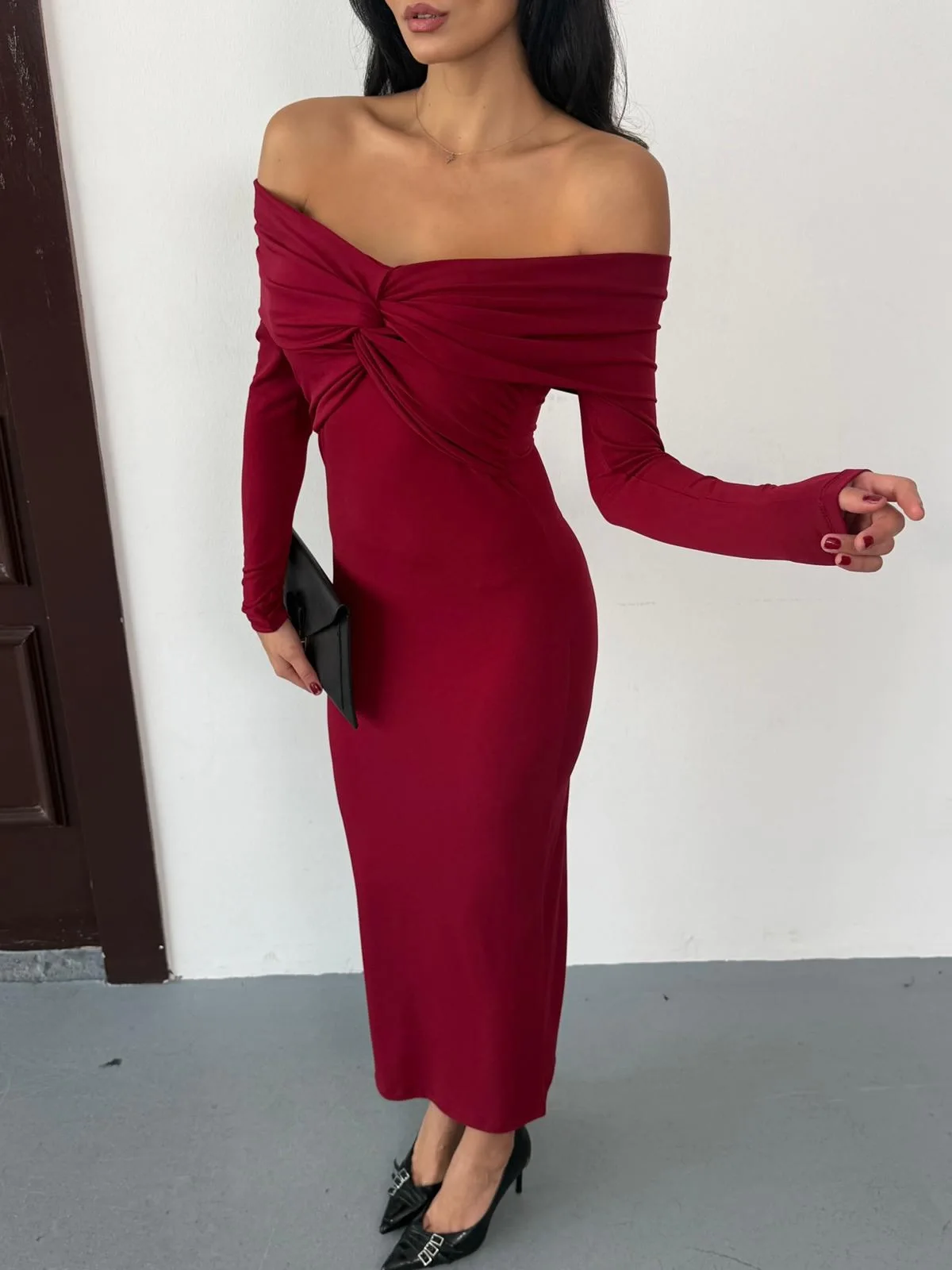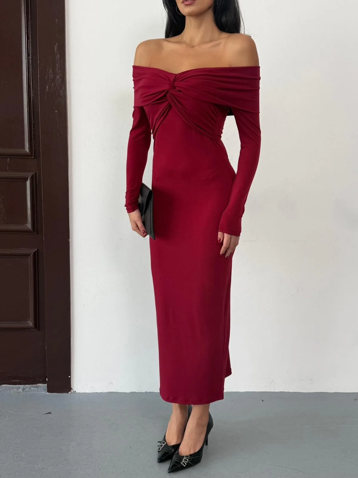 Kadın Bordo Madonna Yaka Düğümlü Uzun Kollu Midi Boy Elbise