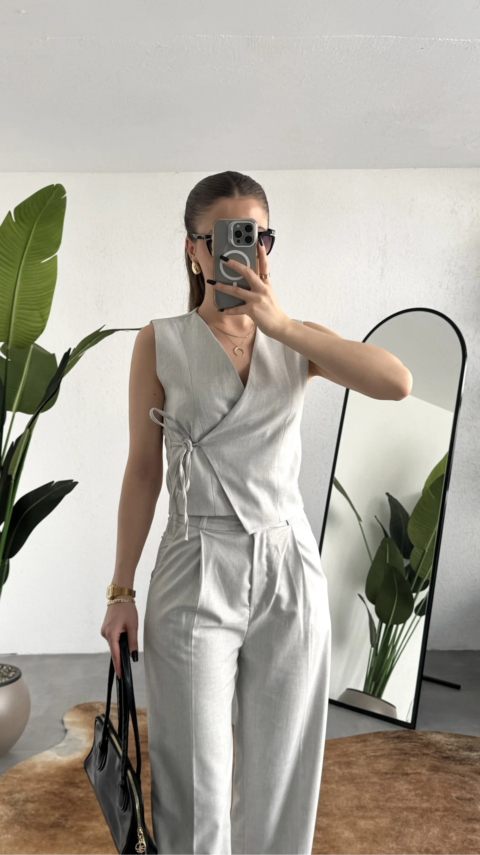 Kruvaze bağlama detaylı yelek tasarımı, vücut hatlarını zarif şekilde vurgularken; yüksek bel ve geniş paça pantolon, dengeli ve güçlü bir siluet oluşturur. Minimal ama karakterli duruşu sayesinde zamansız bir şıklık sağlar.