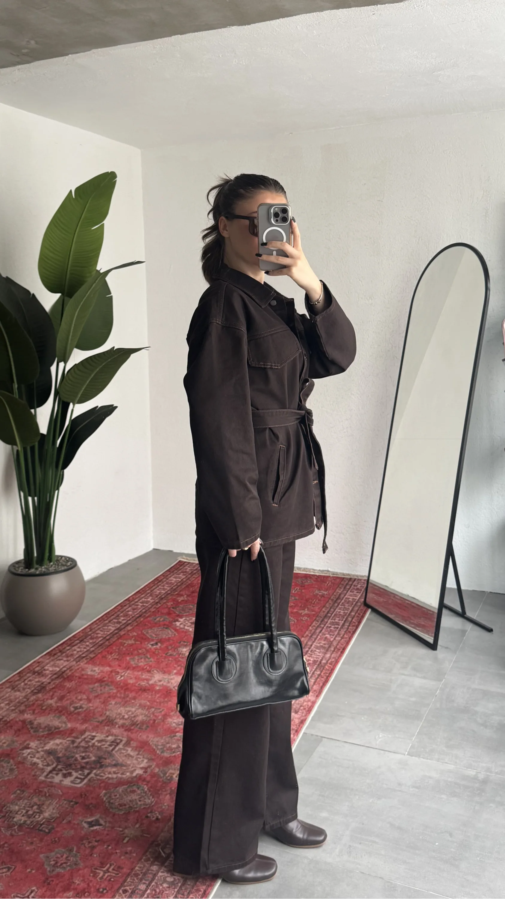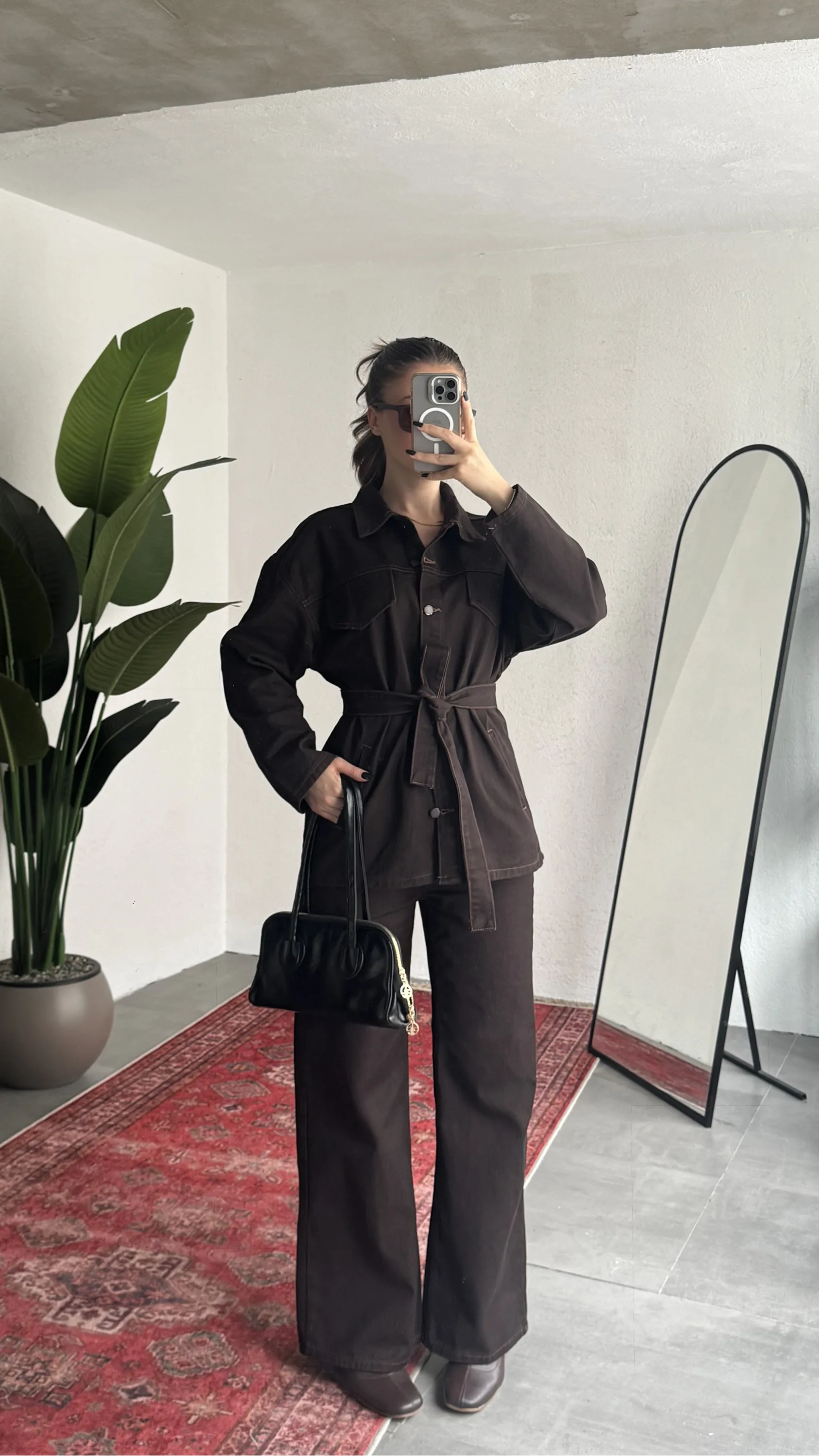 Yüksek bel wide leg pantolon bacak boyunu daha uzun gösterirken, oversize üst parça modern ve trend bir hava katar.