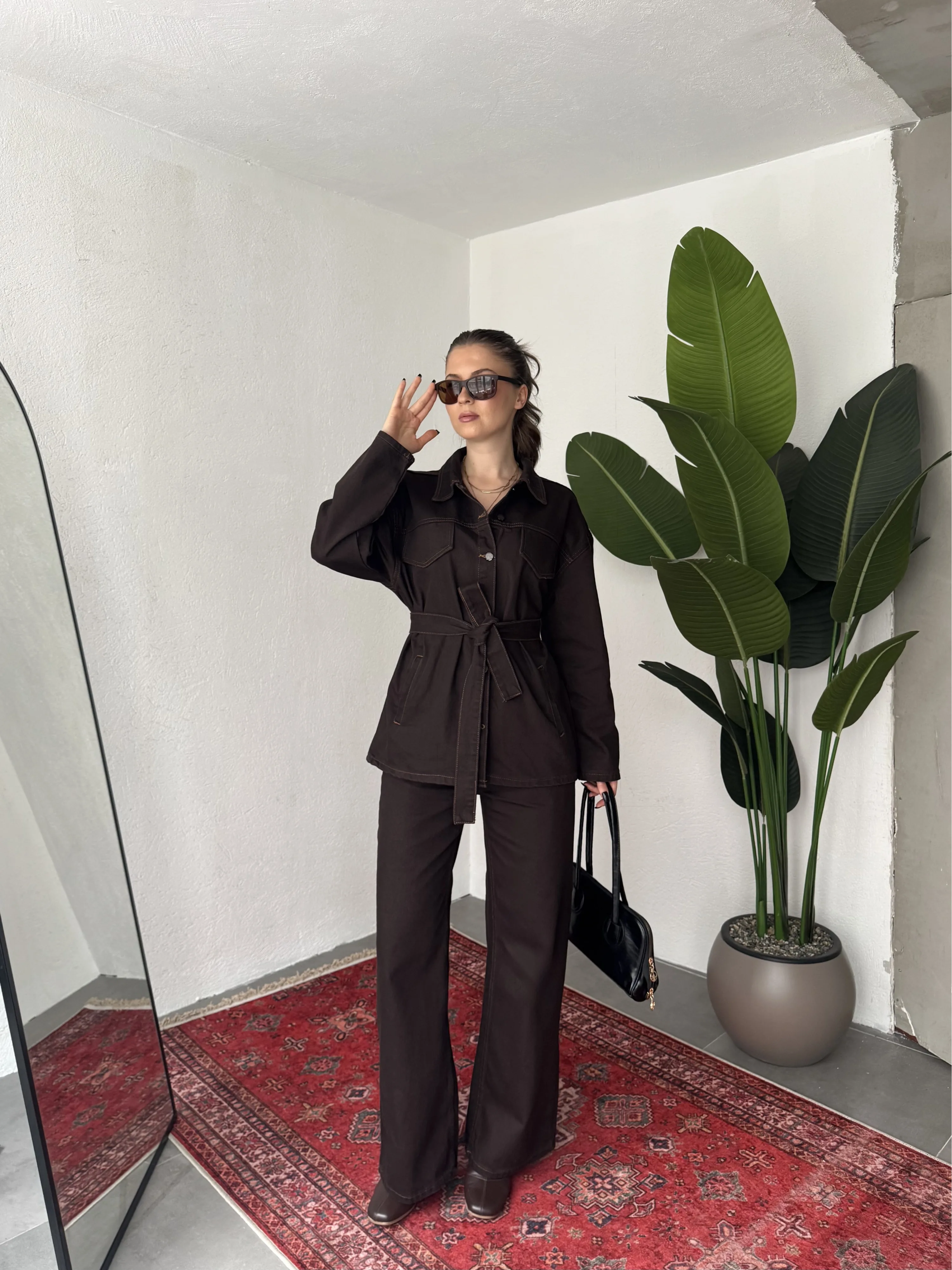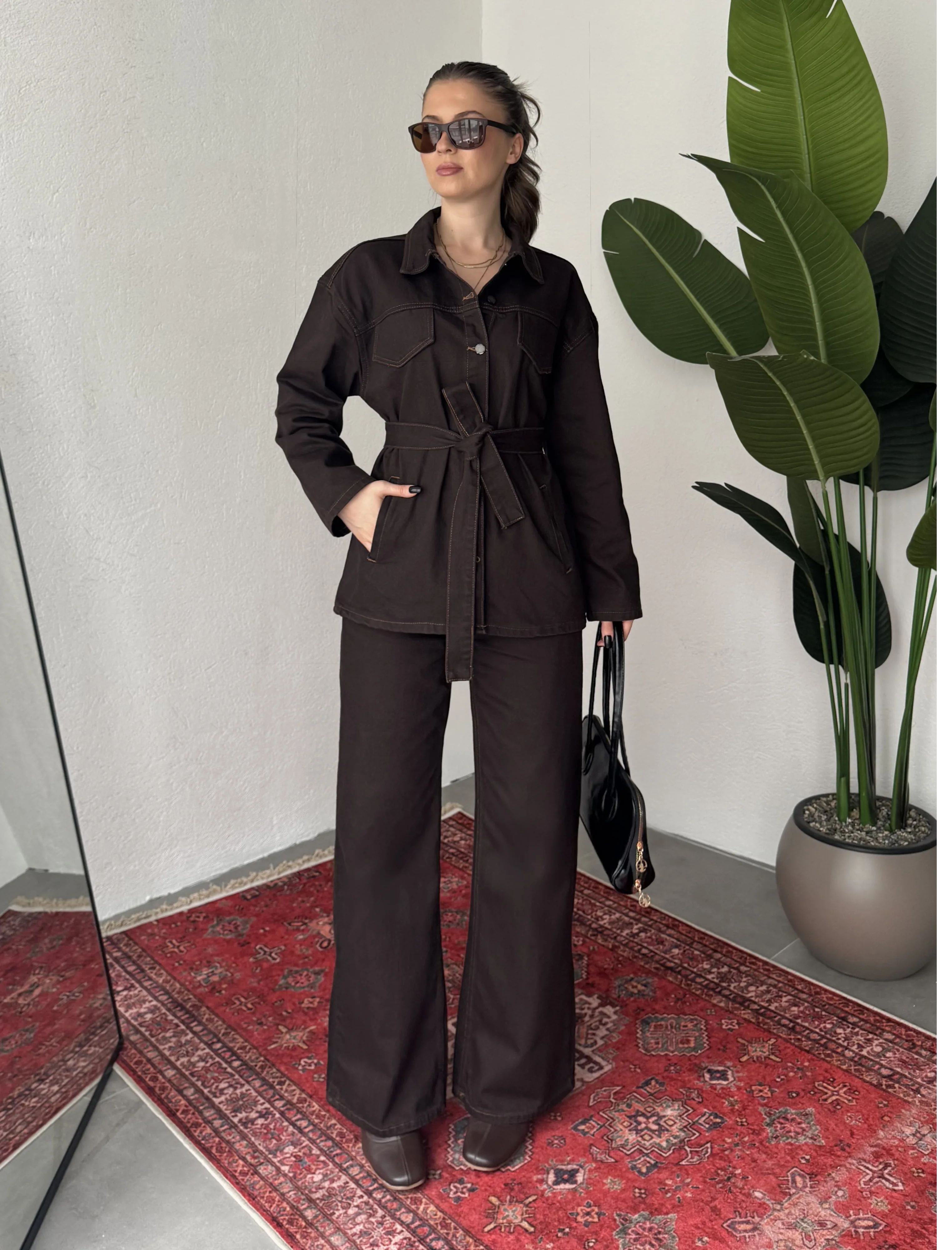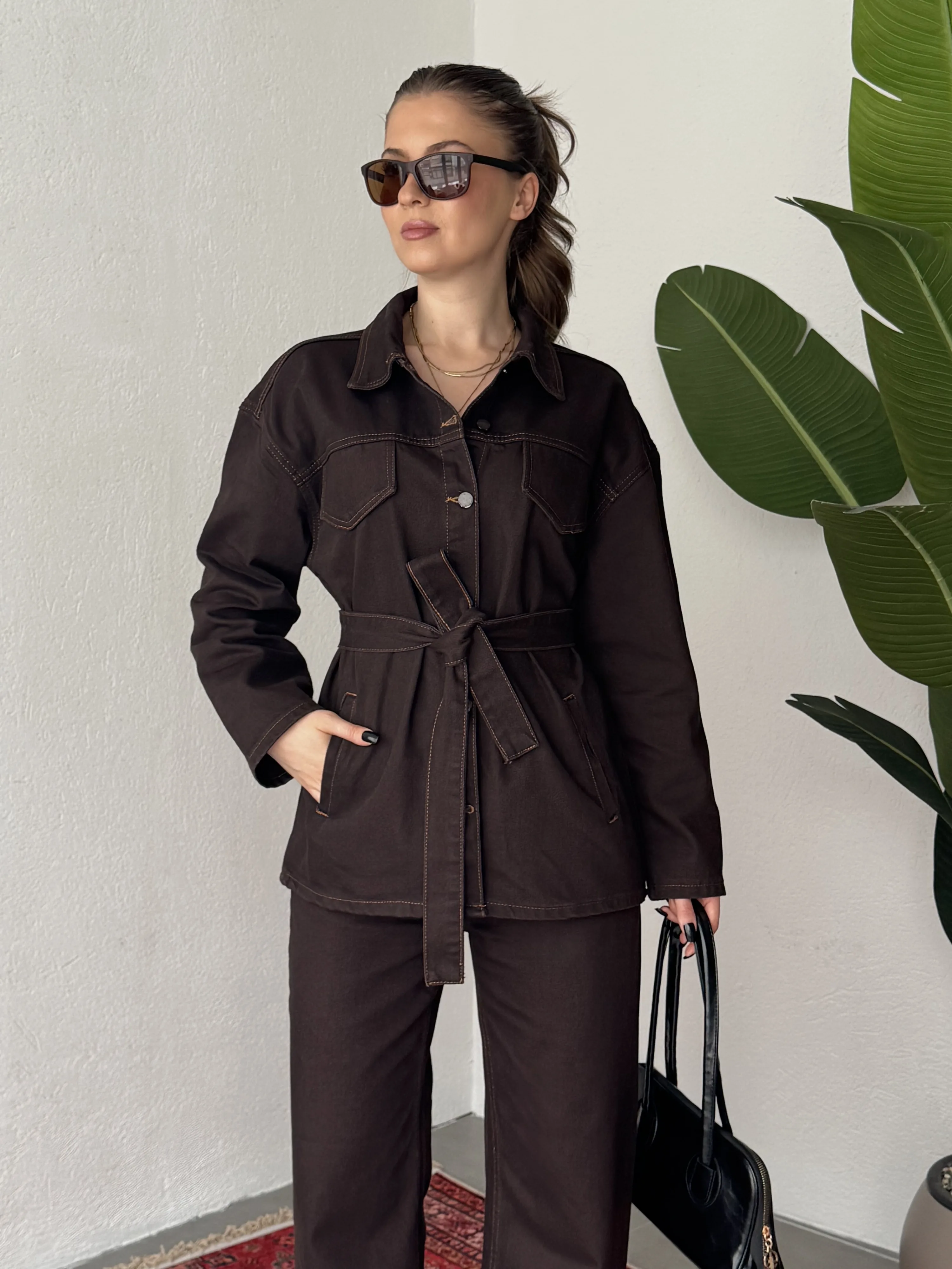 Oversize kesim kot gömlek ve wide leg bol paça pantolondan oluşan bu kadın denim takım, zahmetsiz şıklık sunar. Bel kısmındaki kemer detayı sayesinde vücut formunu dengeler ve daha feminen bir siluet oluşturur.
