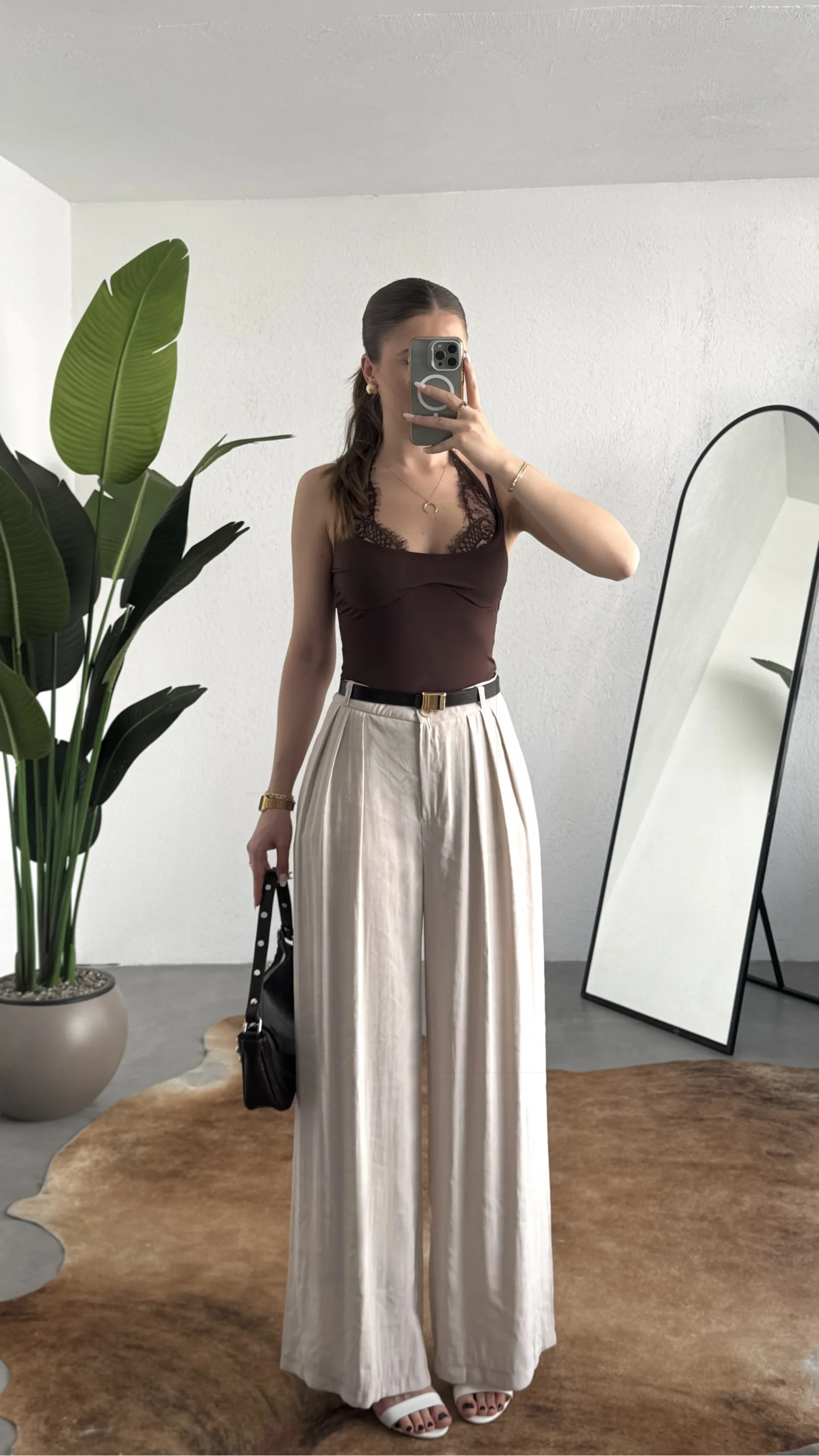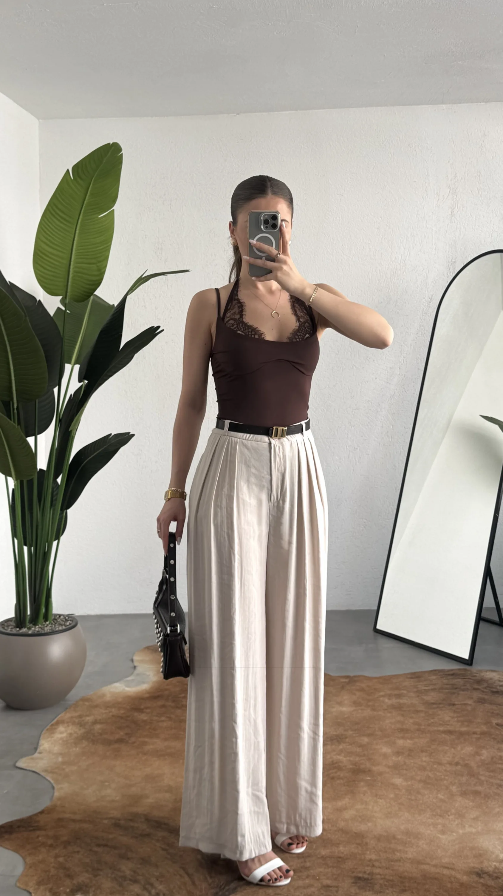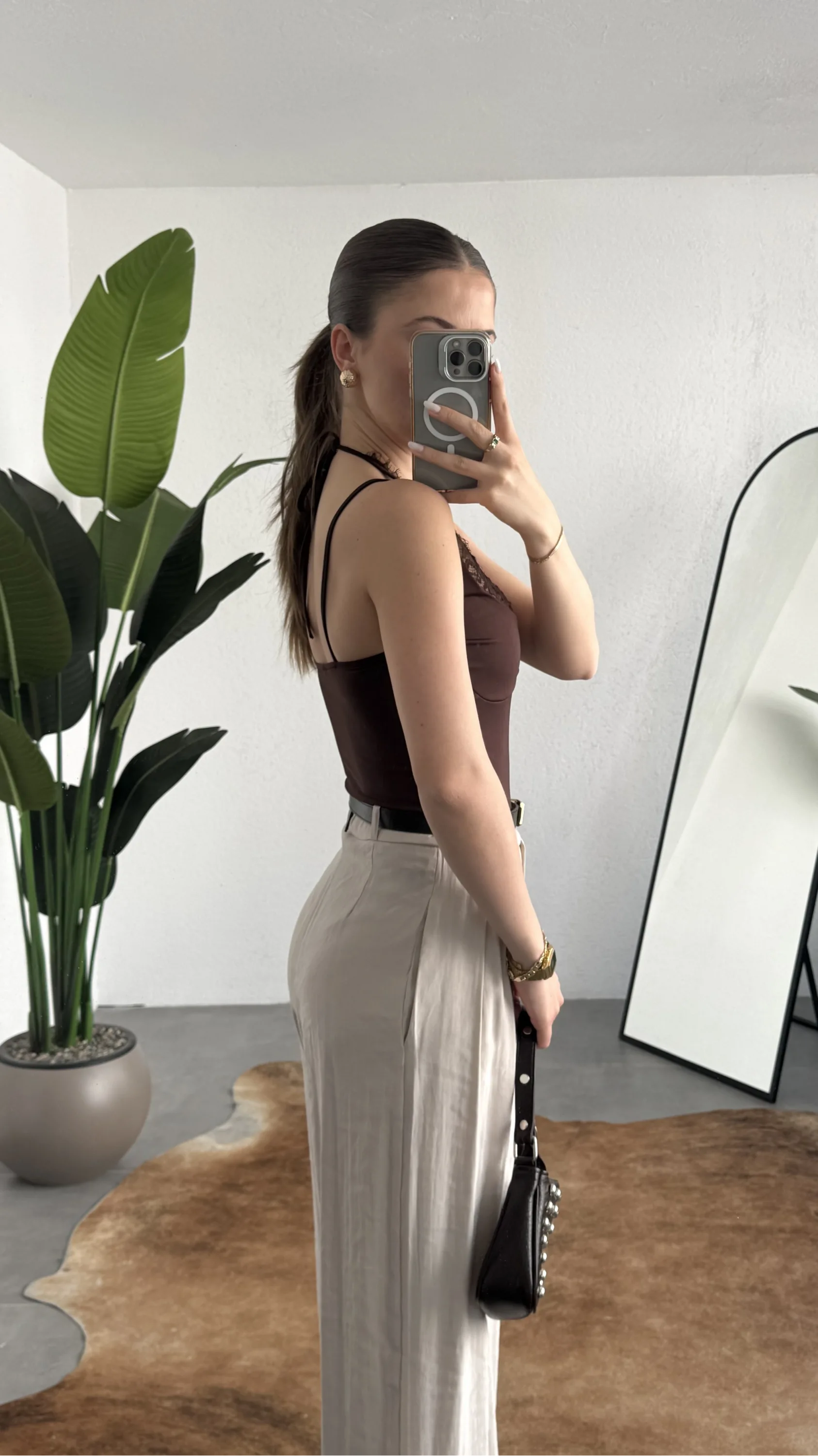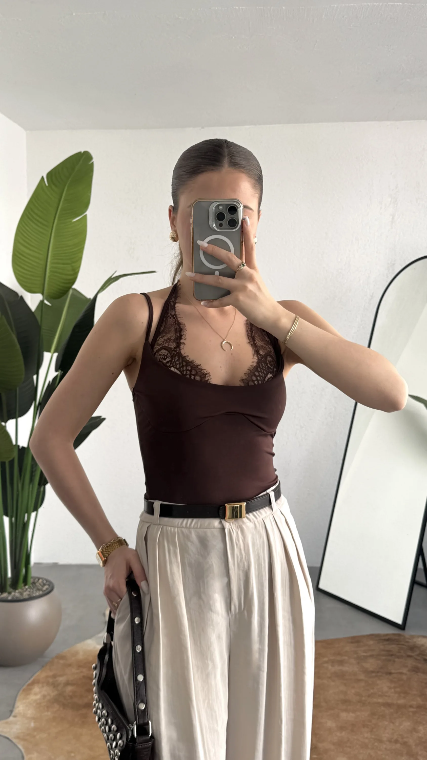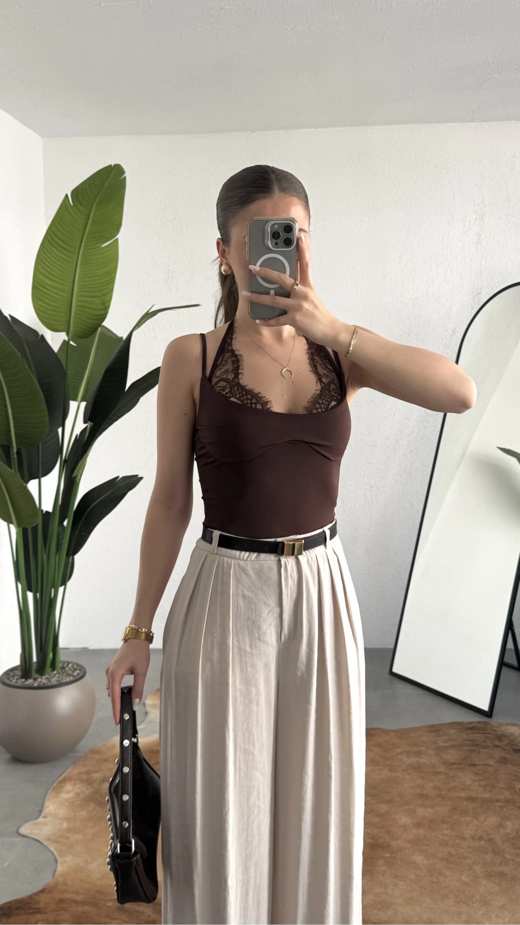 Stil, detayların doğru kullanımıyla fark yaratır. Bu kahverengi dantel detaylı bodysuit, minimal formu güçlü dokunuşlarla birleştirerek modern kadının stil ihtiyacına net bir cevap sunar.