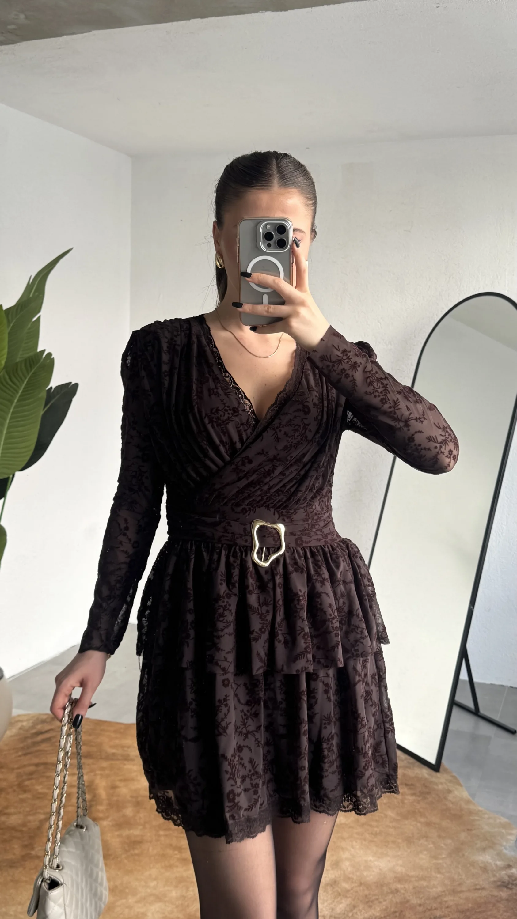 Kruvaze yaka kesimi ve zarif dantel dokusuyla öne çıkan bu mini elbise, hem şık hem dikkat çekici bir görünüm sunar.