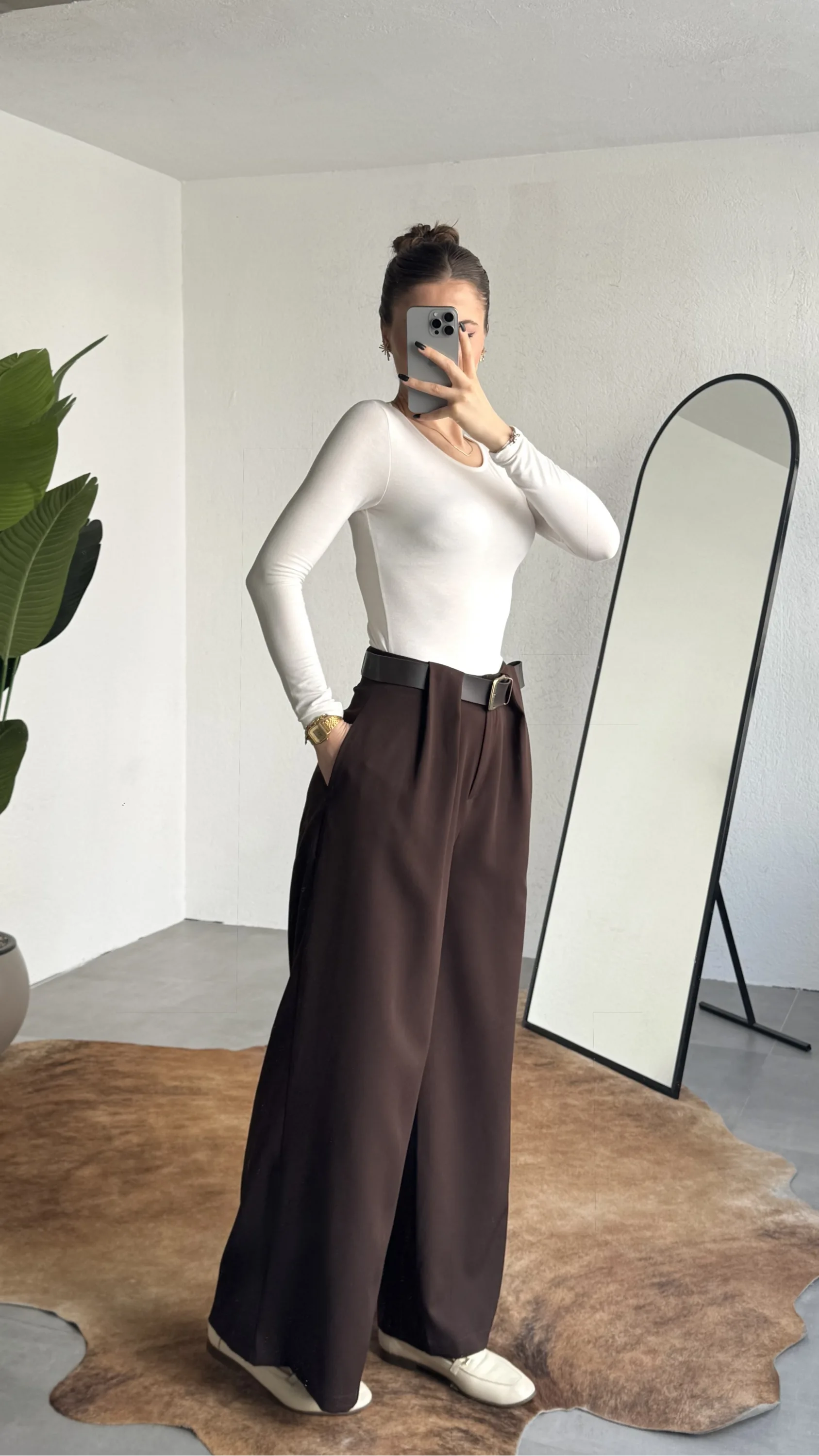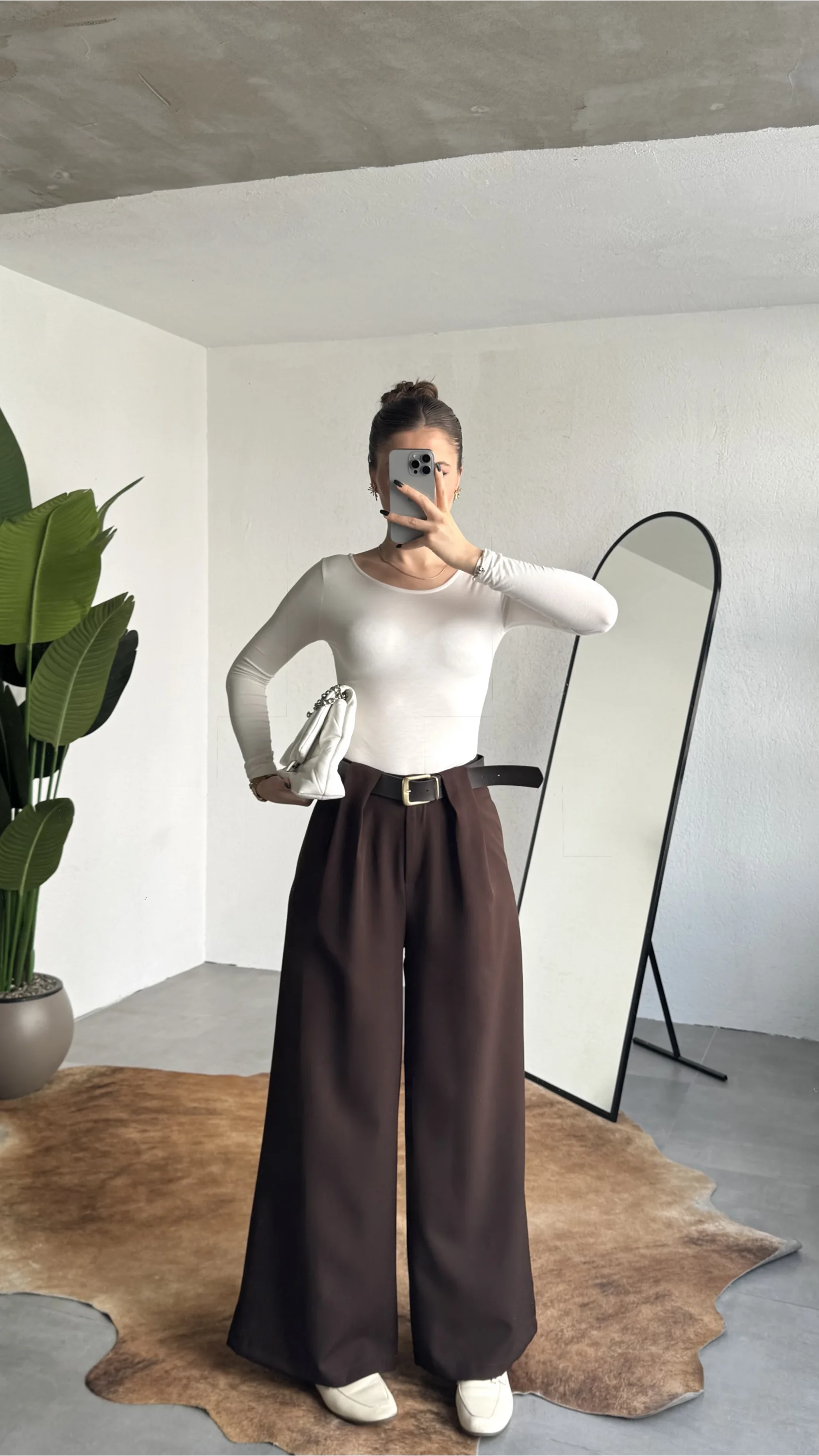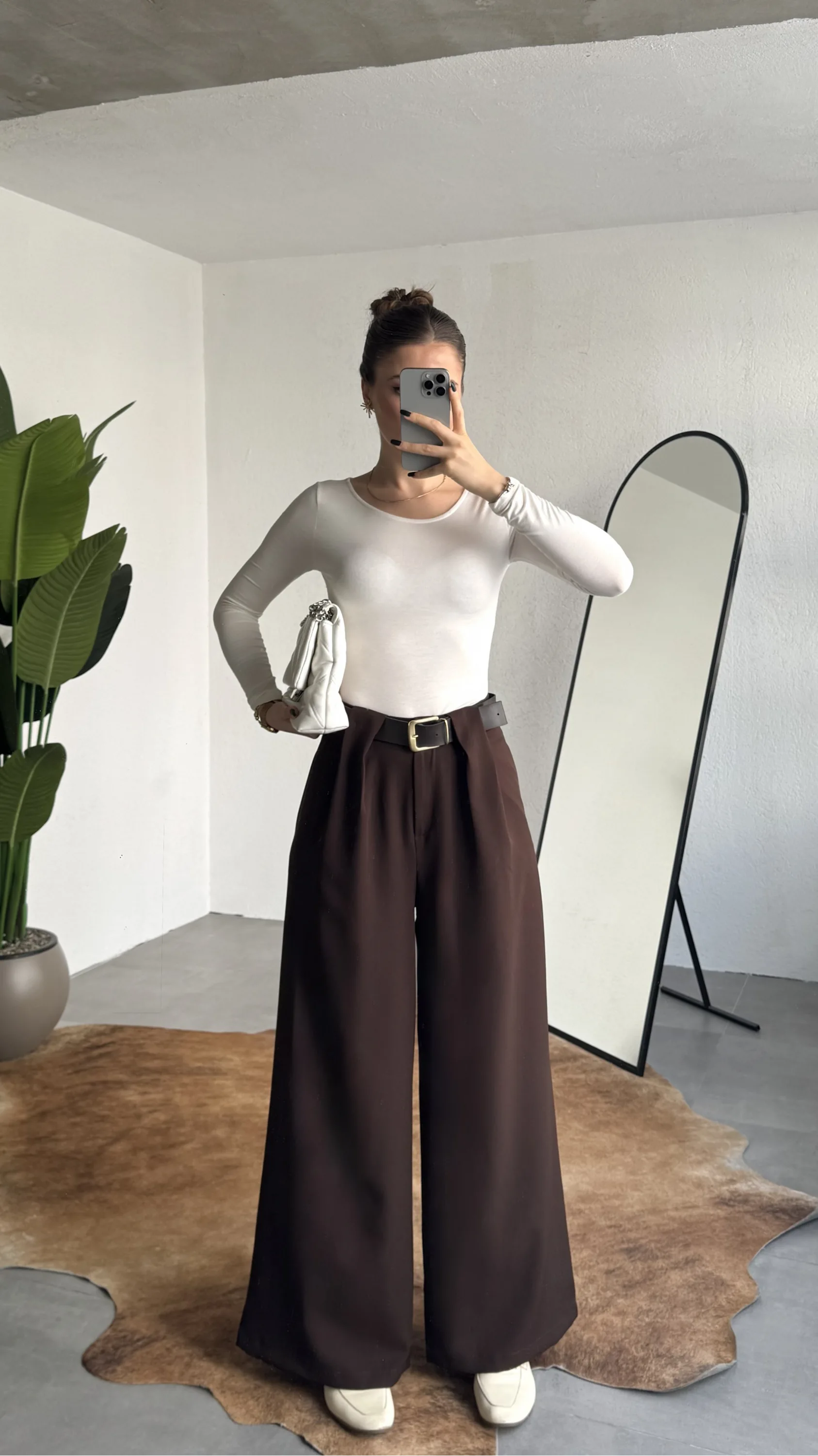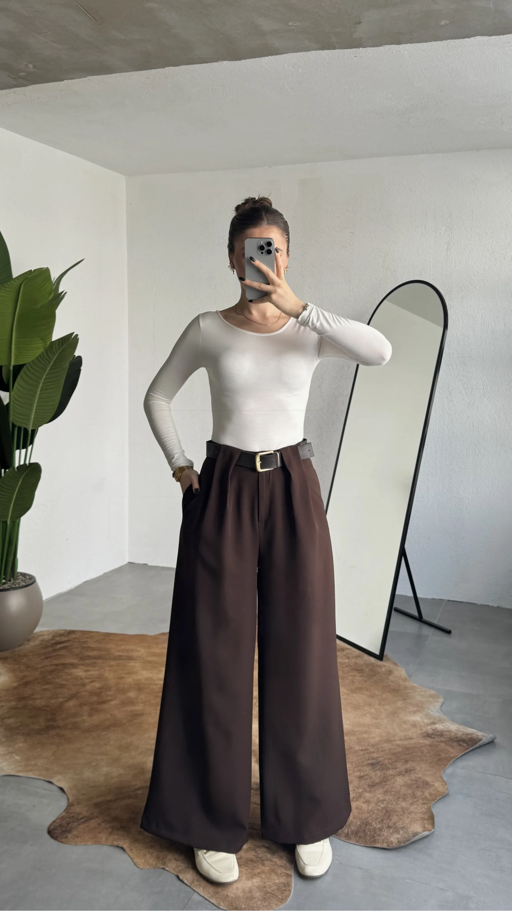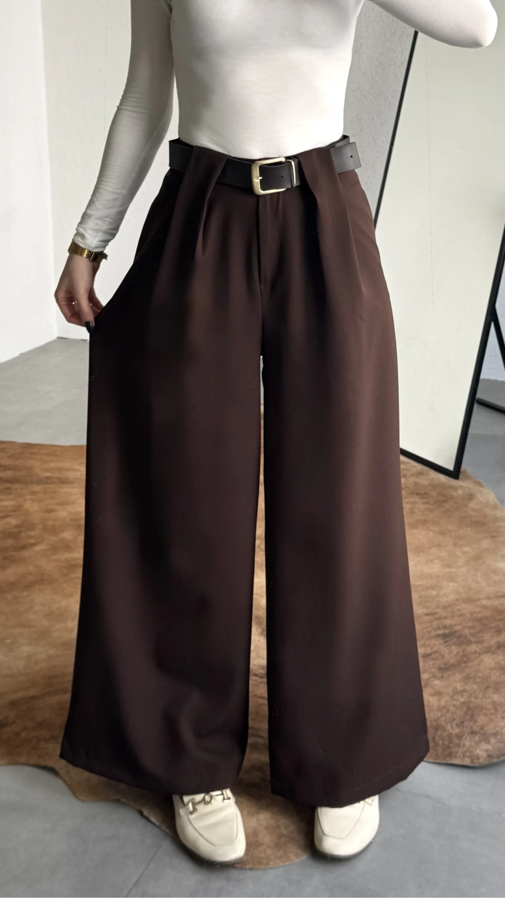 Bel kısmındaki kemer detayı ve yüksek bel formu vücut hatlarını dengeli şekilde vurgularken, geniş paça kesimi bacak boyunu daha uzun ve zarif gösterir. Akışkan kumaşı sayesinde gün boyu rahat bir kullanım sağlar.