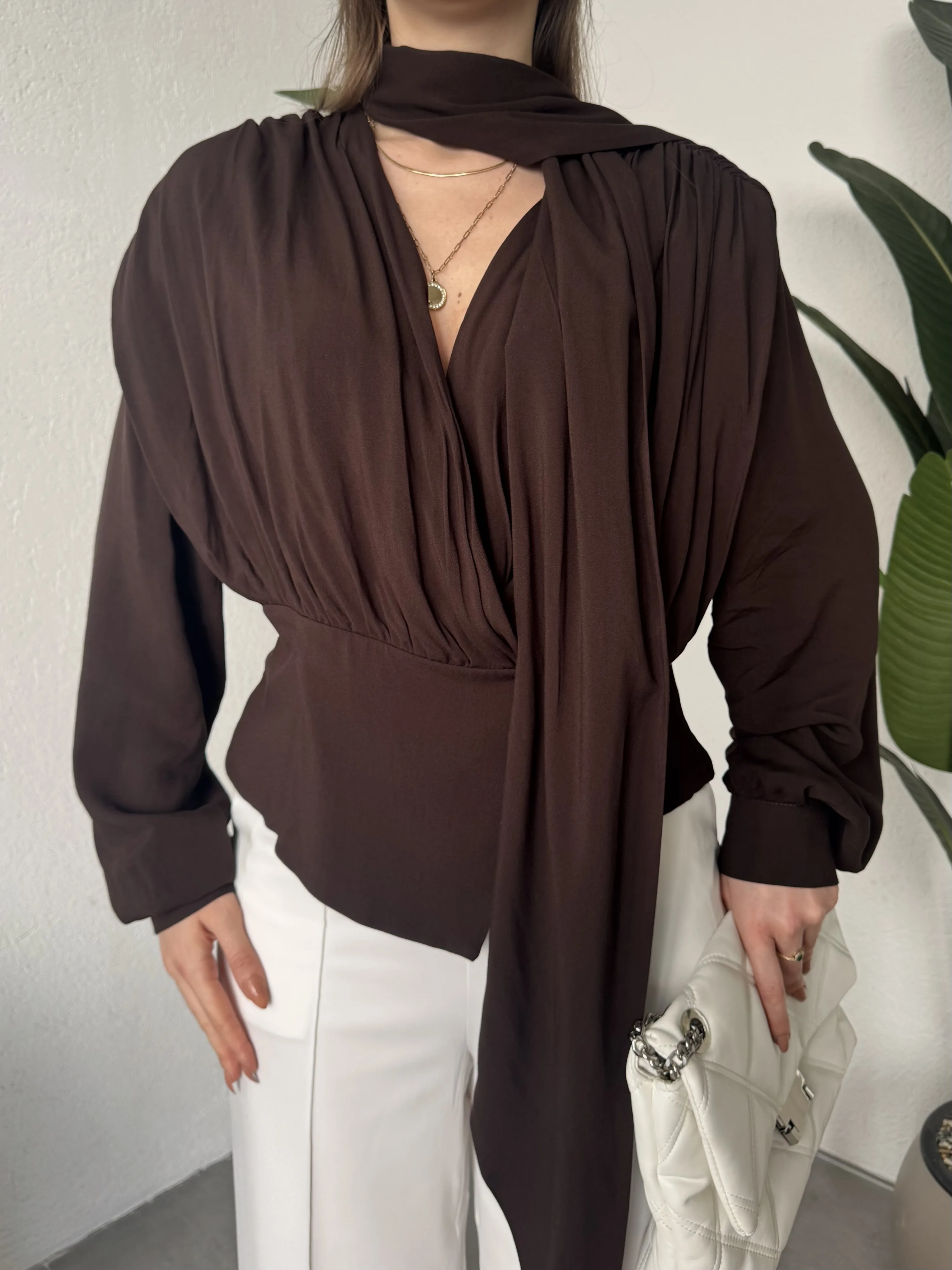 Şal yaka detayı ve akışkan drape formu ile tasarlanan bu kadın bluz, modern şıklığı zamansız bir tasarımla buluşturur.
