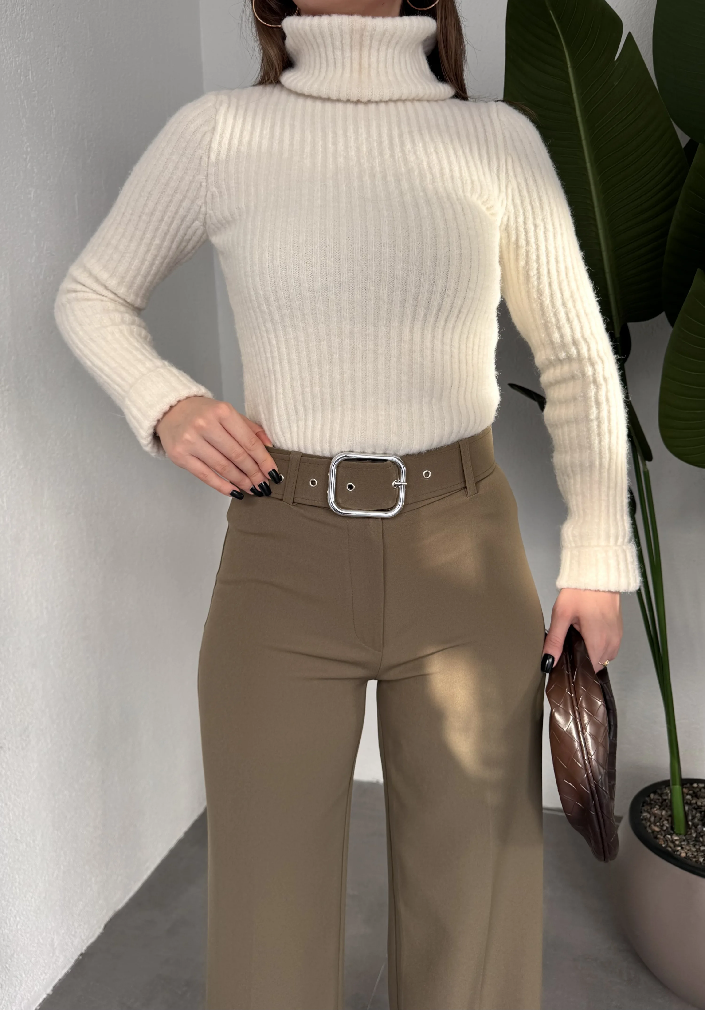 Şıklığı ve konforu bir arada sunan kadın yüksek bel geniş paça kumaş pantolon, modern kesimiyle günlük ve klasik kombinler için ideal bir tercihtir. Yüksek bel yapısı, beli toparlayarak daha fit bir görünüm sunarken geniş paça kesimi bacak boyunu daha uzun gösterir.