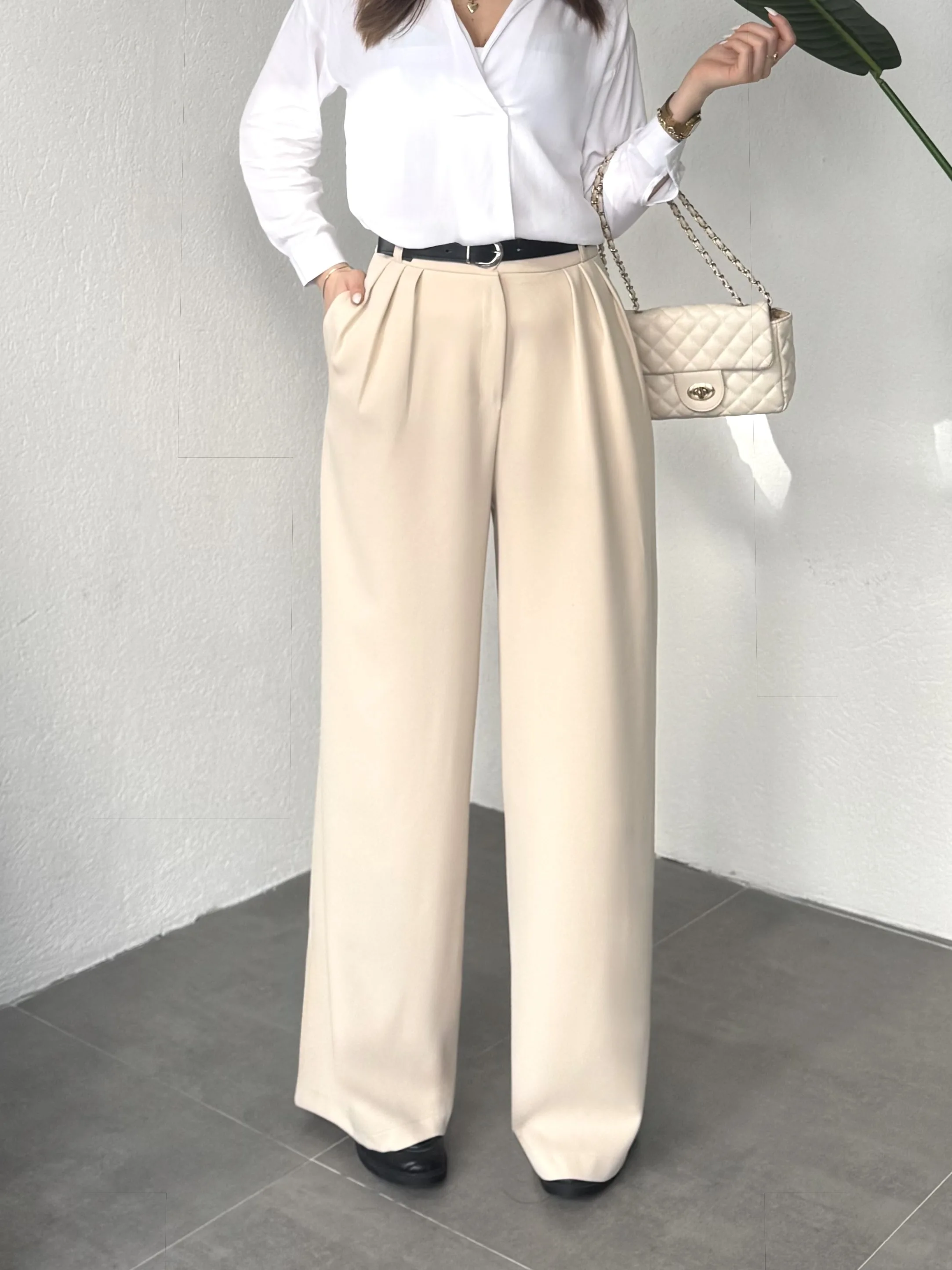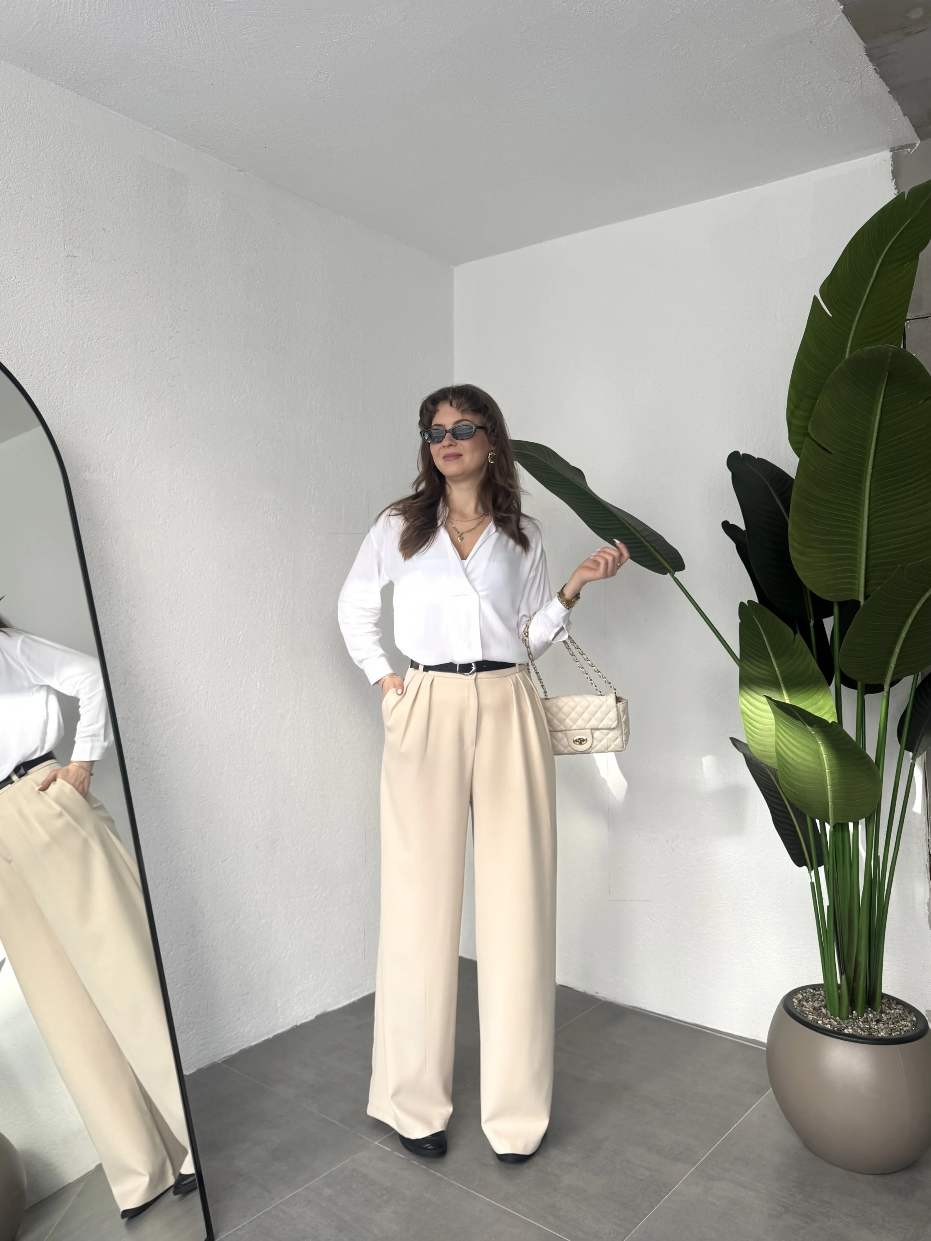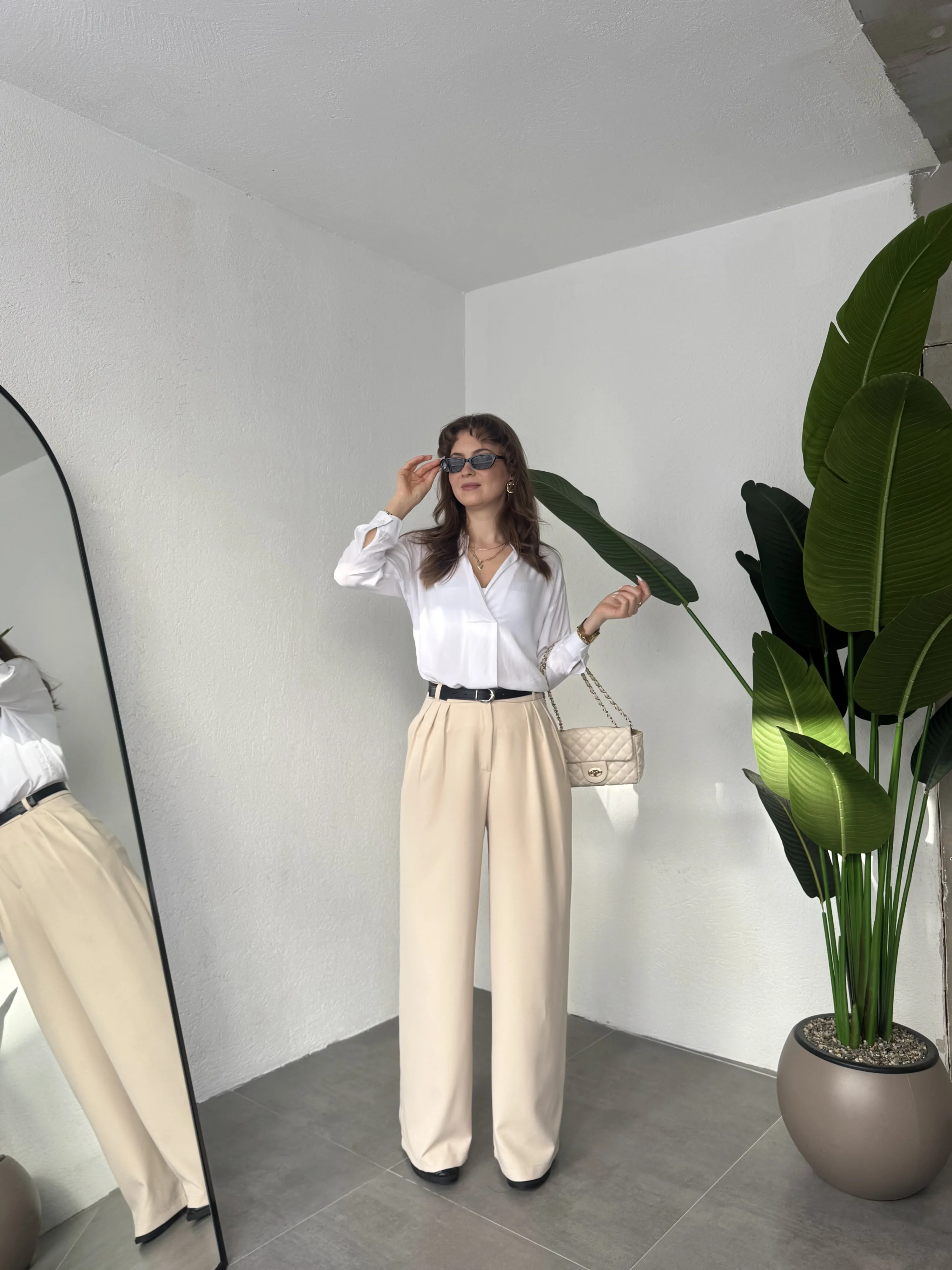 Minimal ve kurtarıcı bir parça arayanlar için tasarlanan bu pantolon, en çok tercih edilen yüksek bel bol paça pantolon modelleri arasında yer almaktadır.