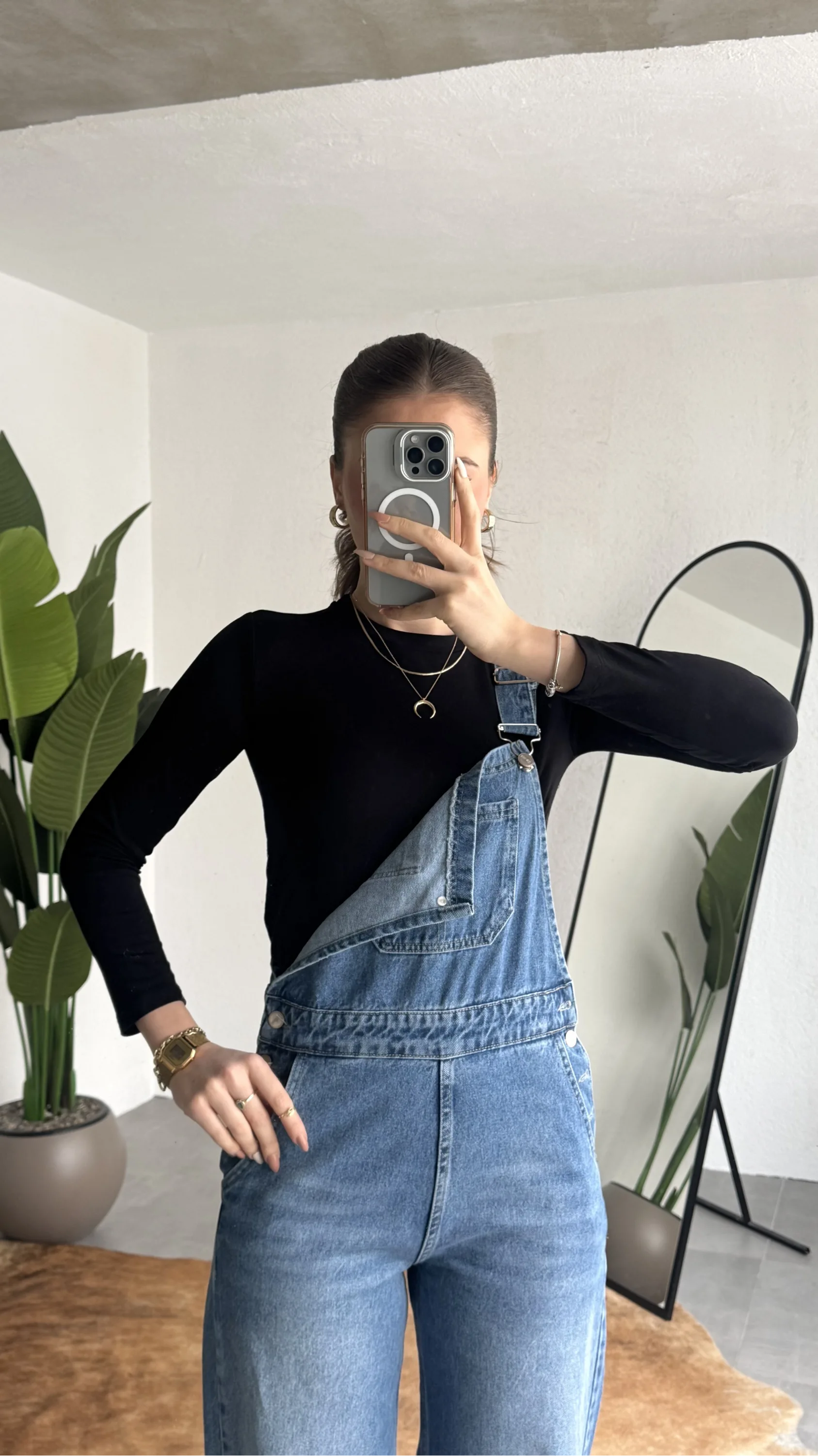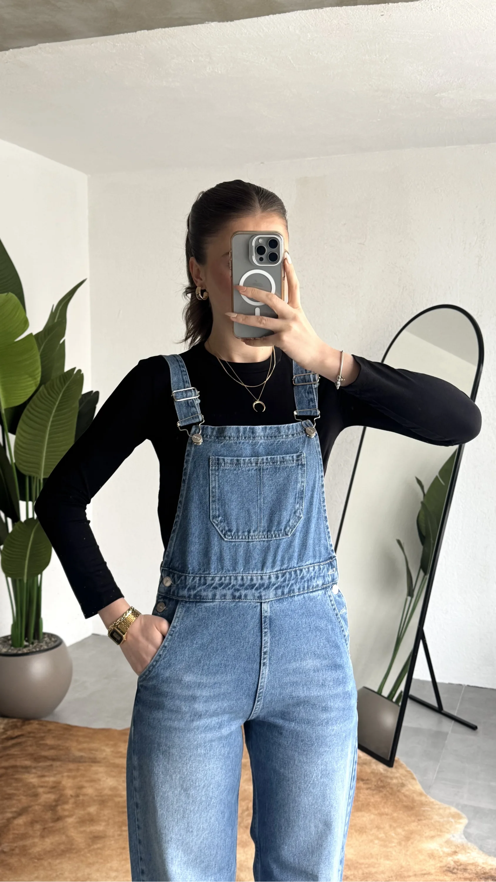 Zamansız denim şıklığını modern bir dokunuşla buluşturan askılı jean tulum, günlük stilinize cool ve rahat bir hava katar. Yumuşak ve dayanıklı kot kumaşı sayesinde gün boyu konfor sunarken, vücuda oturan üst formu ve düz paça kesimi ile dengeli bir siluet oluşturur.
