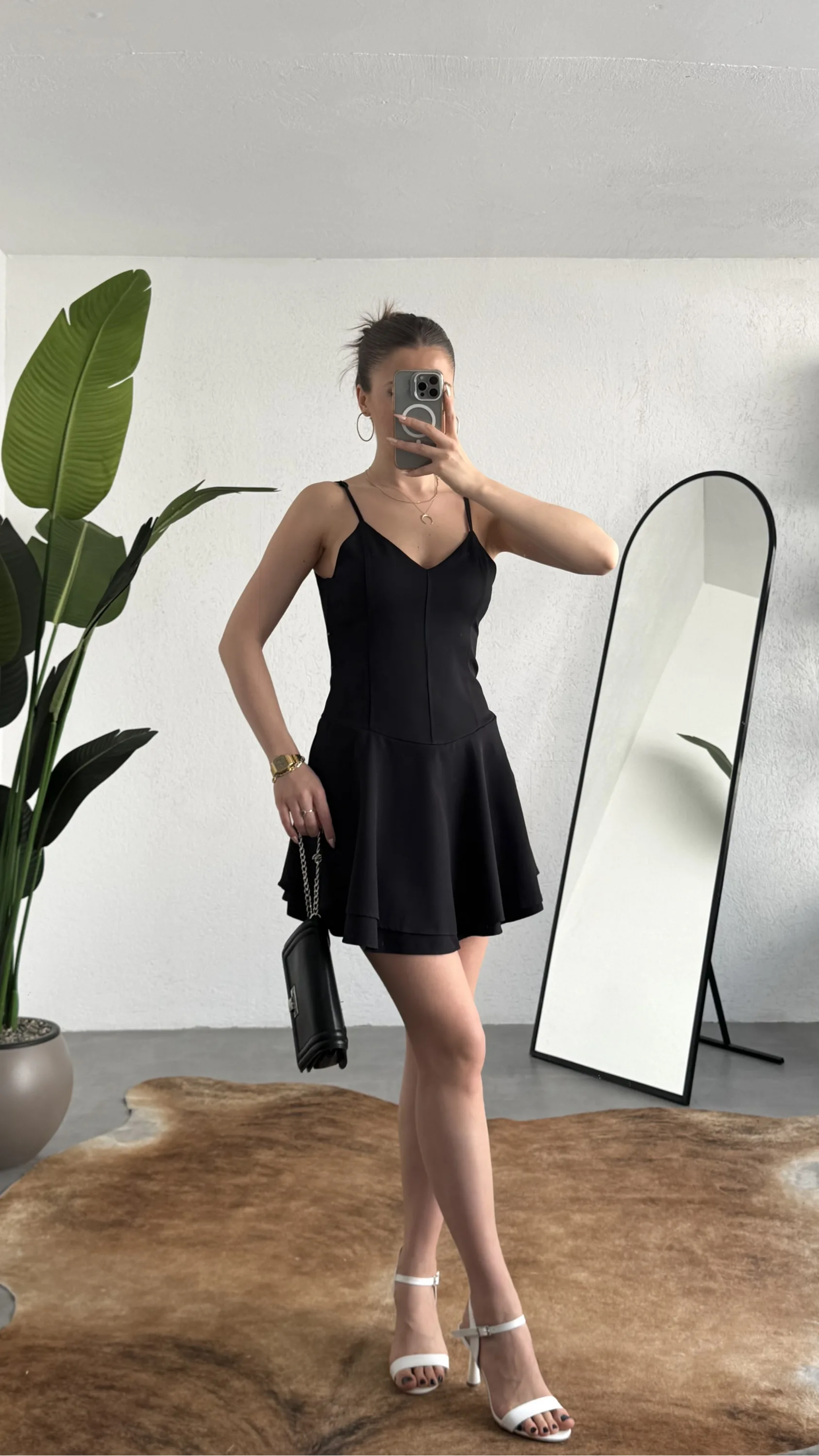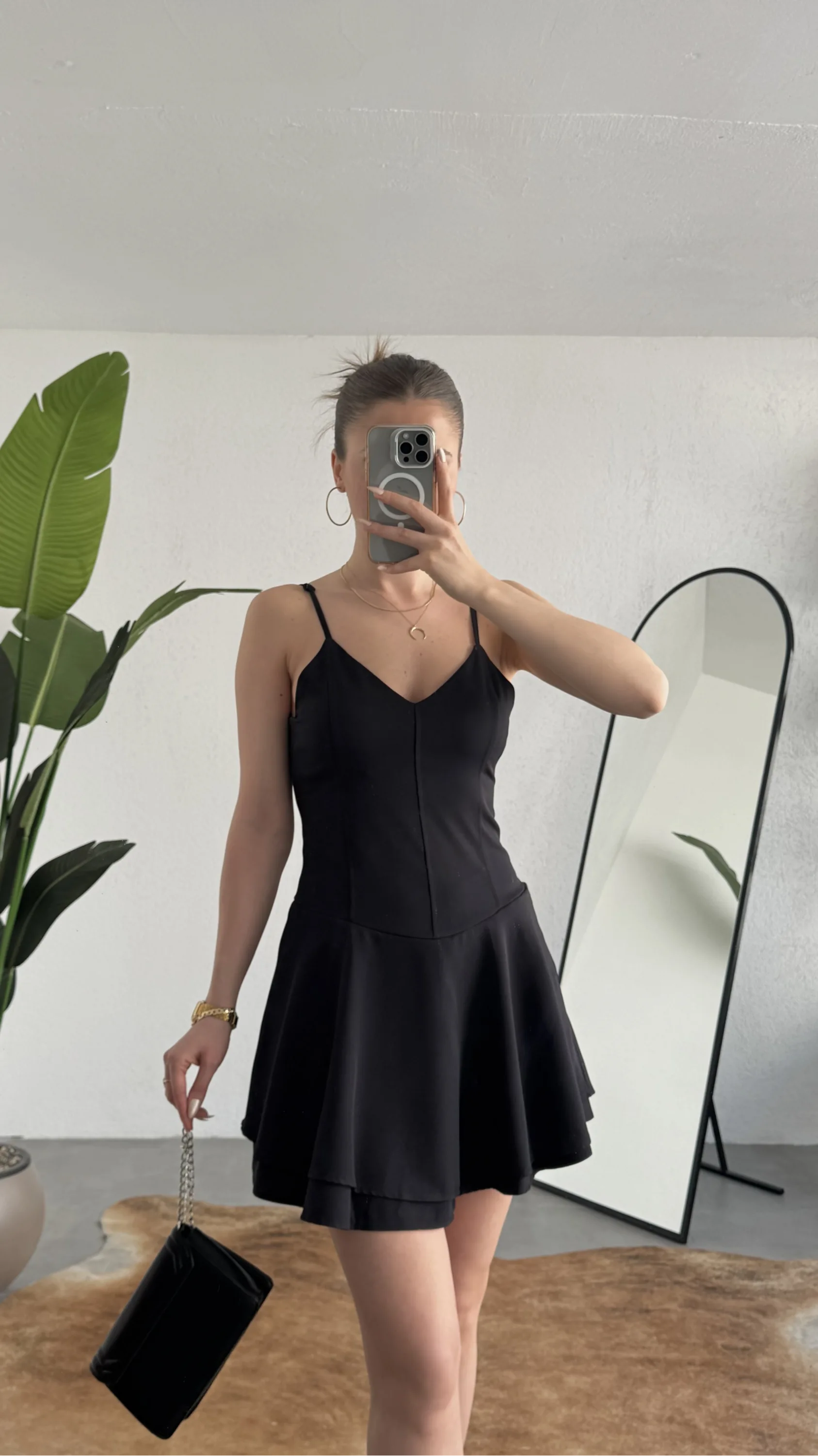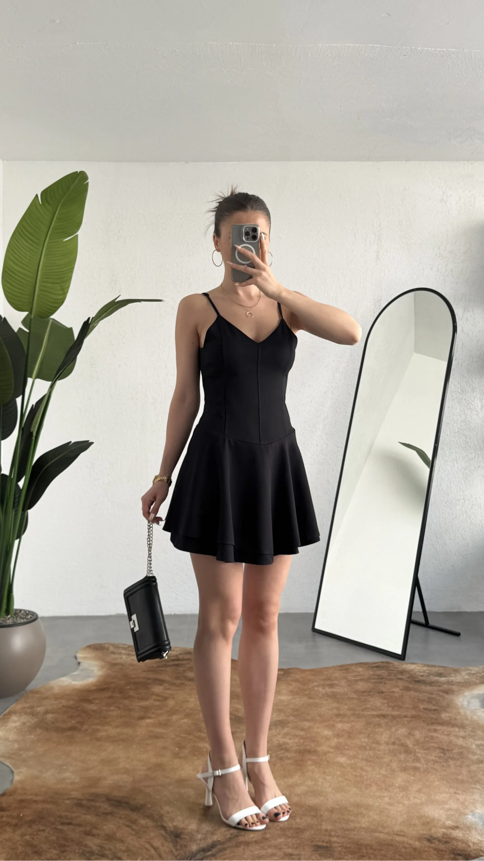 Korse formundan ilham alan üst yapı, vücut hatlarını dengeli şekilde şekillendirirken; ince askı ve V yaka detayı zarif bir duruş sunar. Hareketli volanlı etek kesimi ise dinamizm katarak genç, enerjik ve dikkat çekici bir siluet oluşturur.