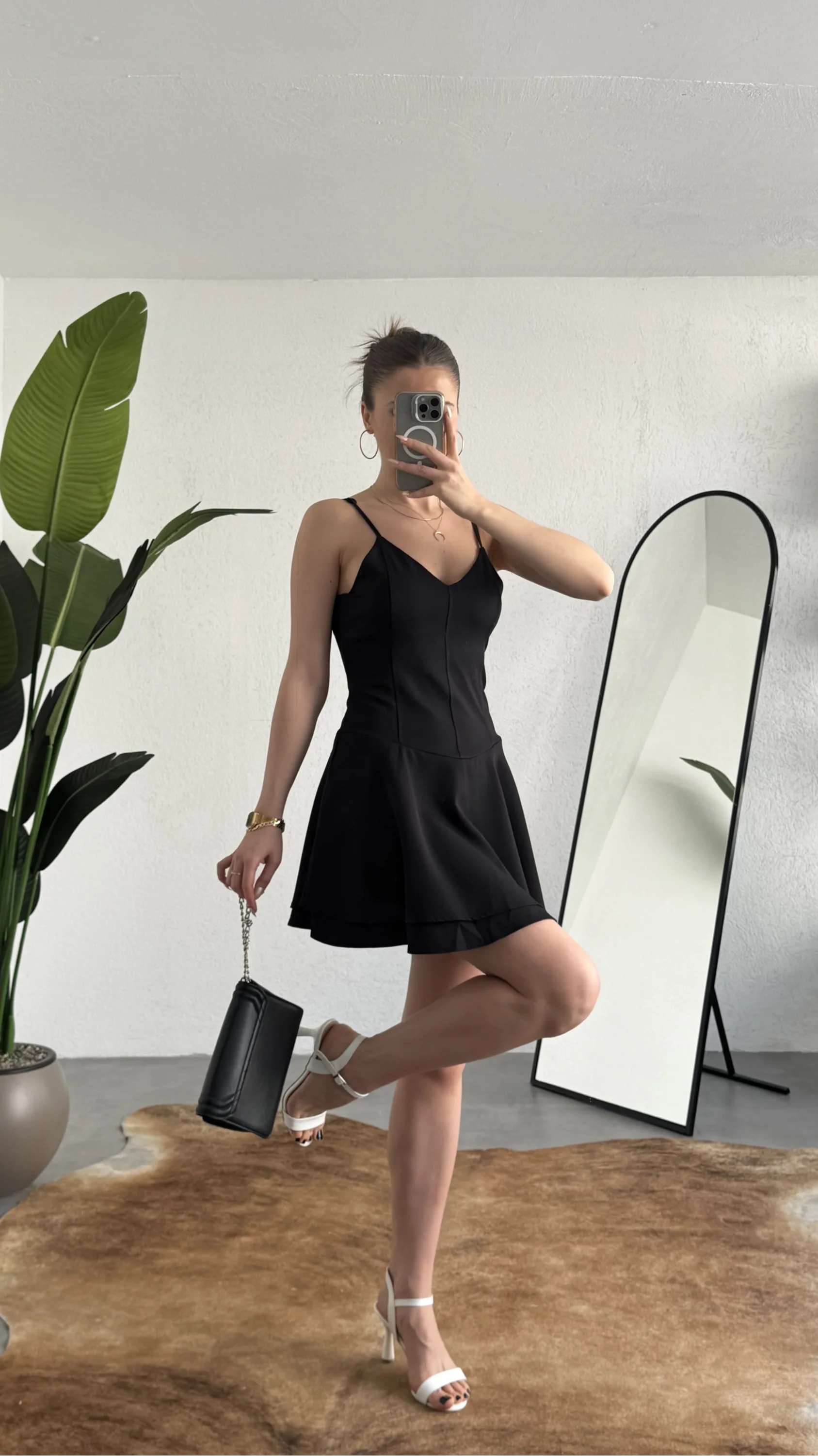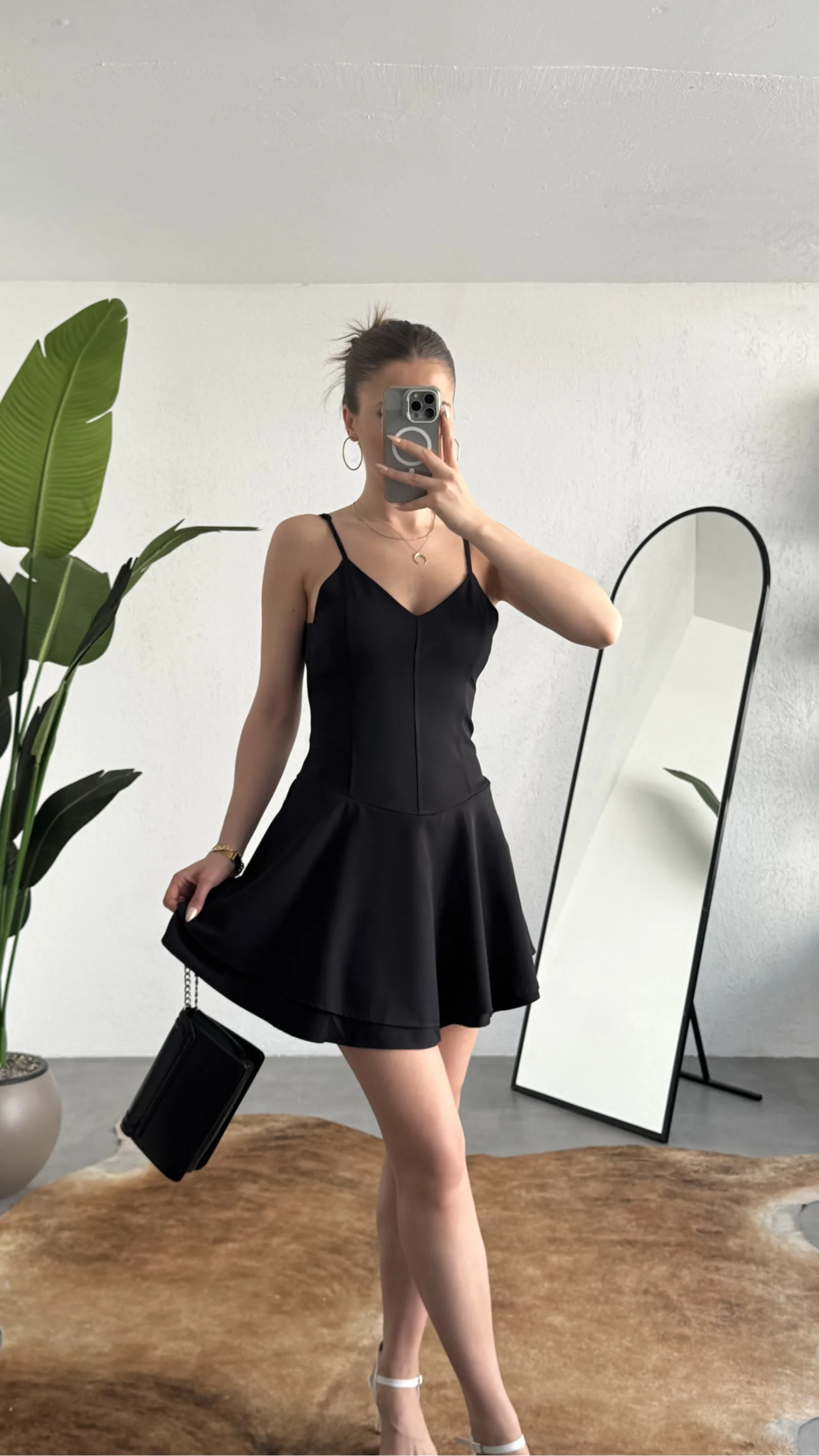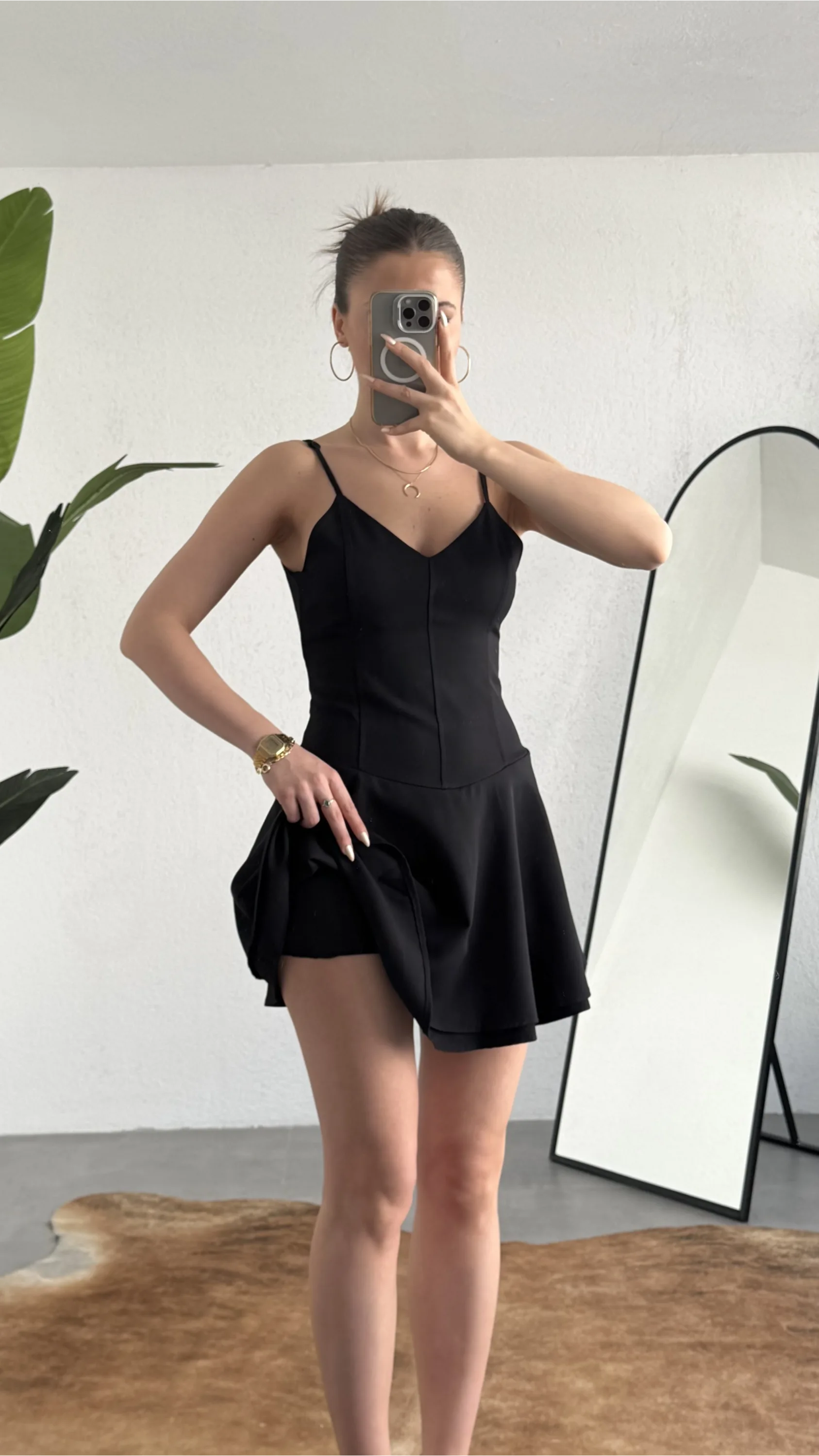 Korse formundan ilham alan üst yapı, vücut hatlarını dengeli şekilde şekillendirirken; ince askı ve V yaka detayı zarif bir duruş sunar. Hareketli volanlı etek kesimi ise dinamizm katarak genç, enerjik ve dikkat çekici bir siluet oluşturur.
