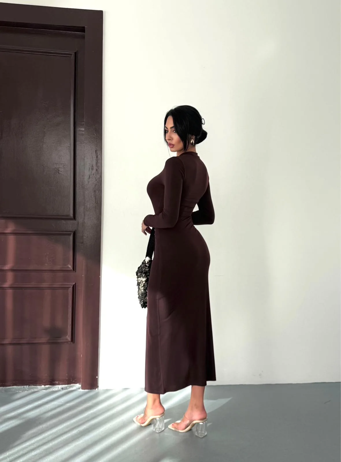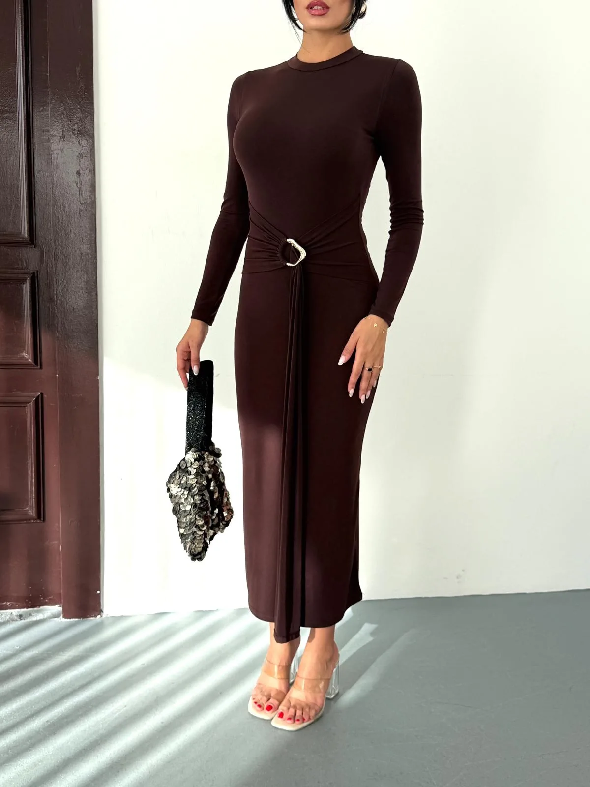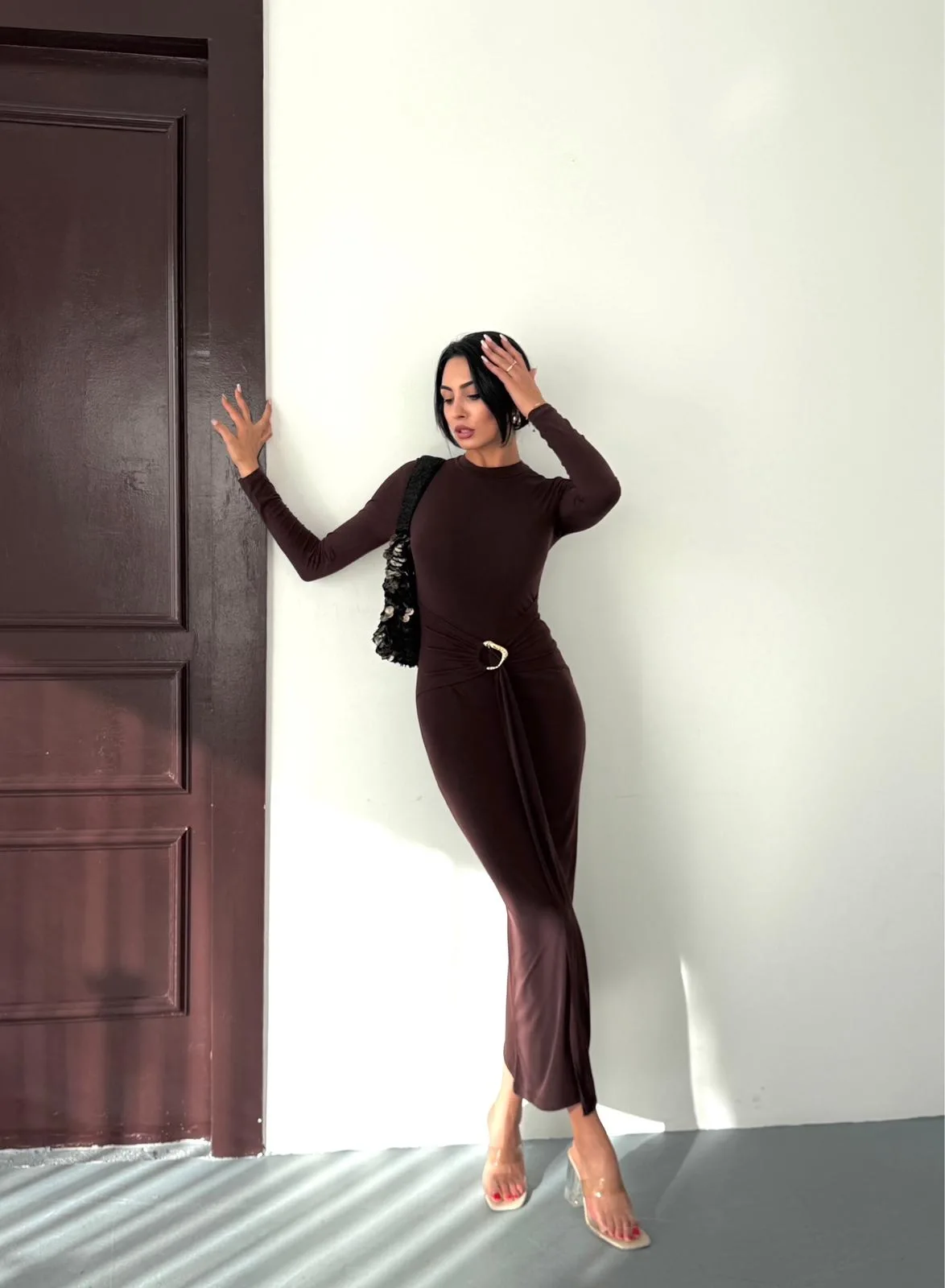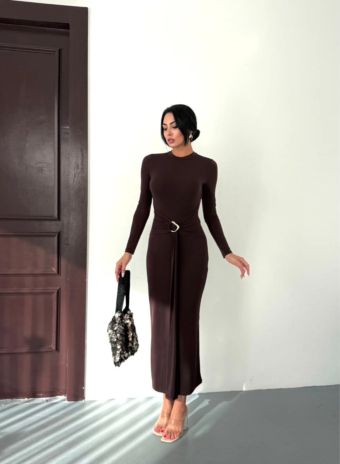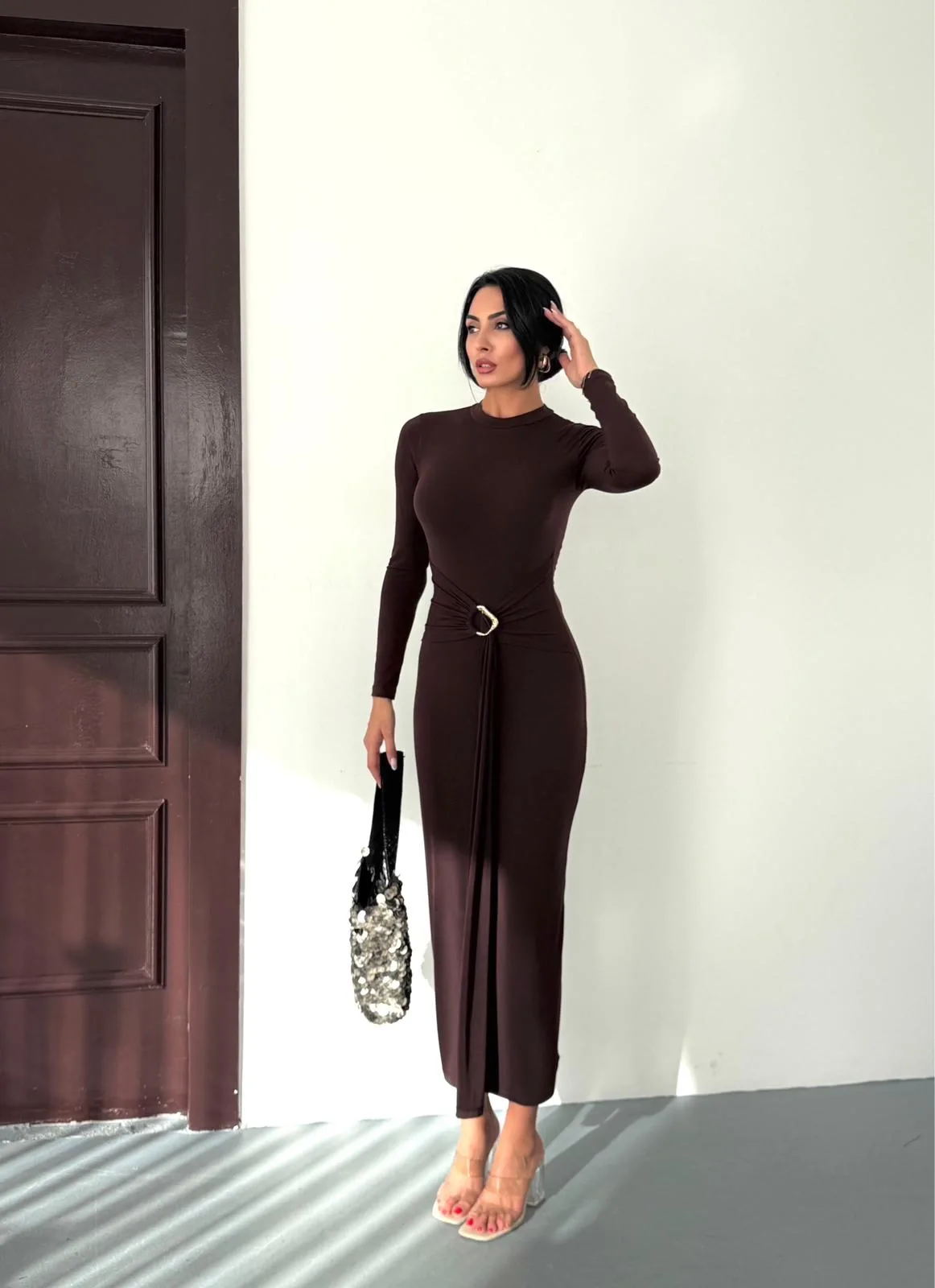 Kadın Kahverengi Bisiklet Yaka Gold Aksesuarlı Kuşaklı Uzun Boy Vucudu Saran Elbise
