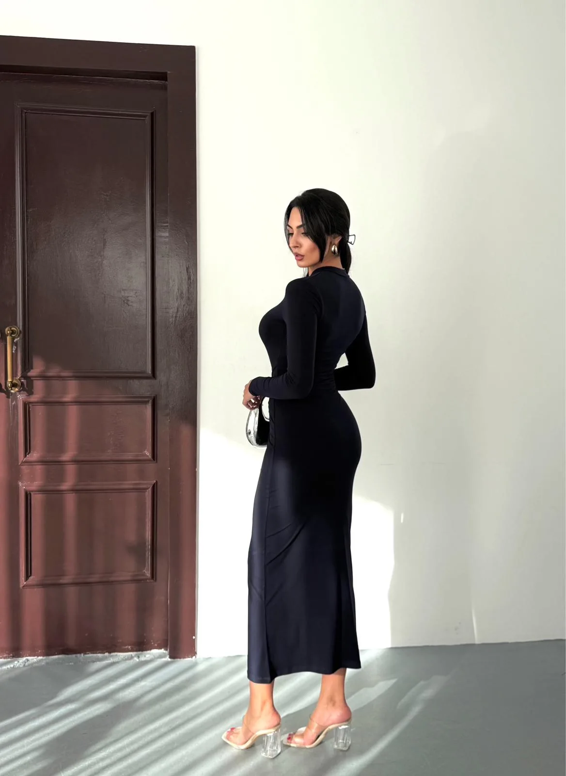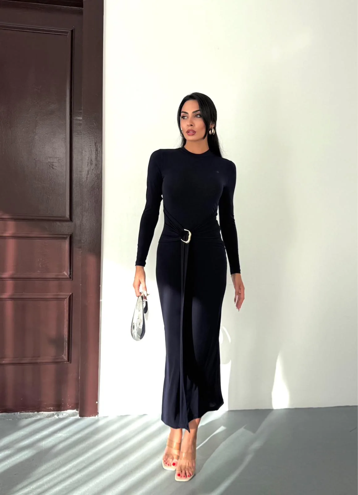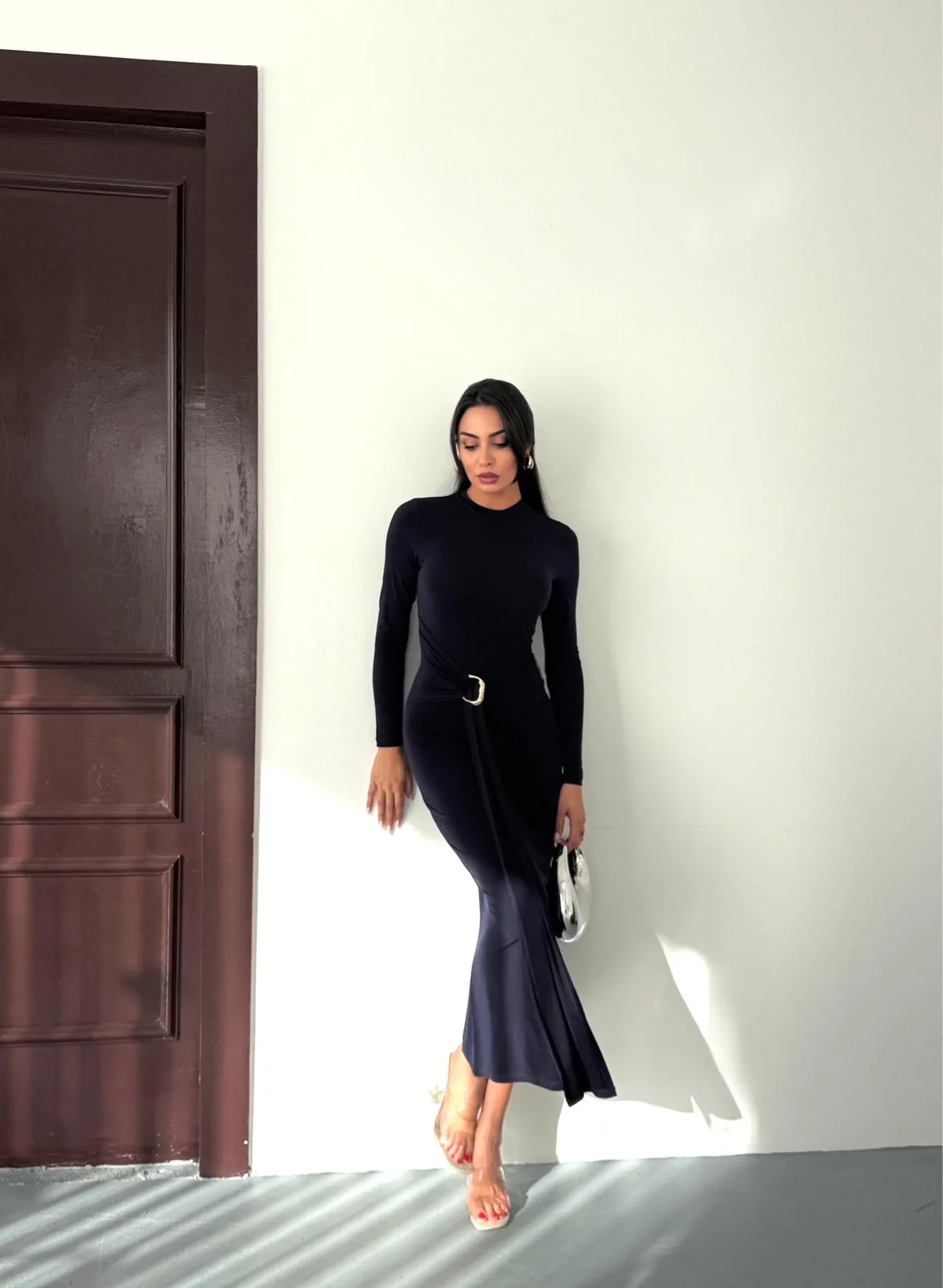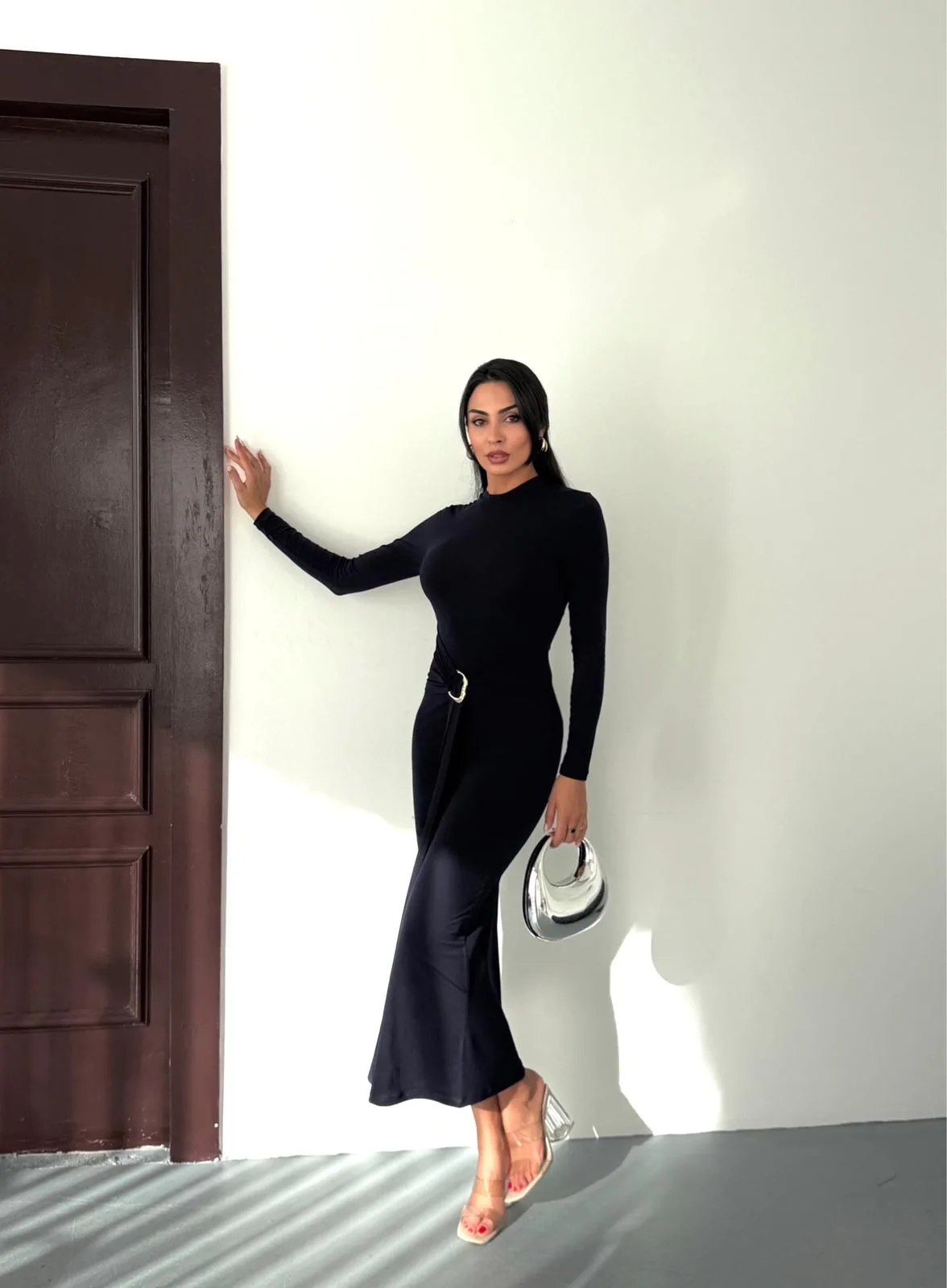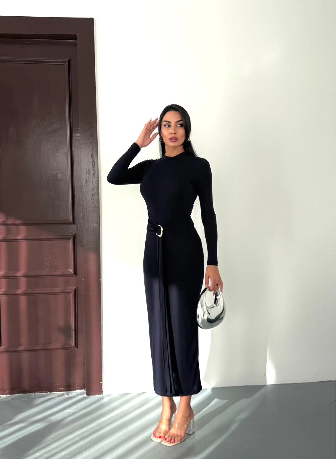 Siyah Vucudu Saran Simli Parlak Büzgülü Drapeli Midi Boy Uzun Kollu Elbise